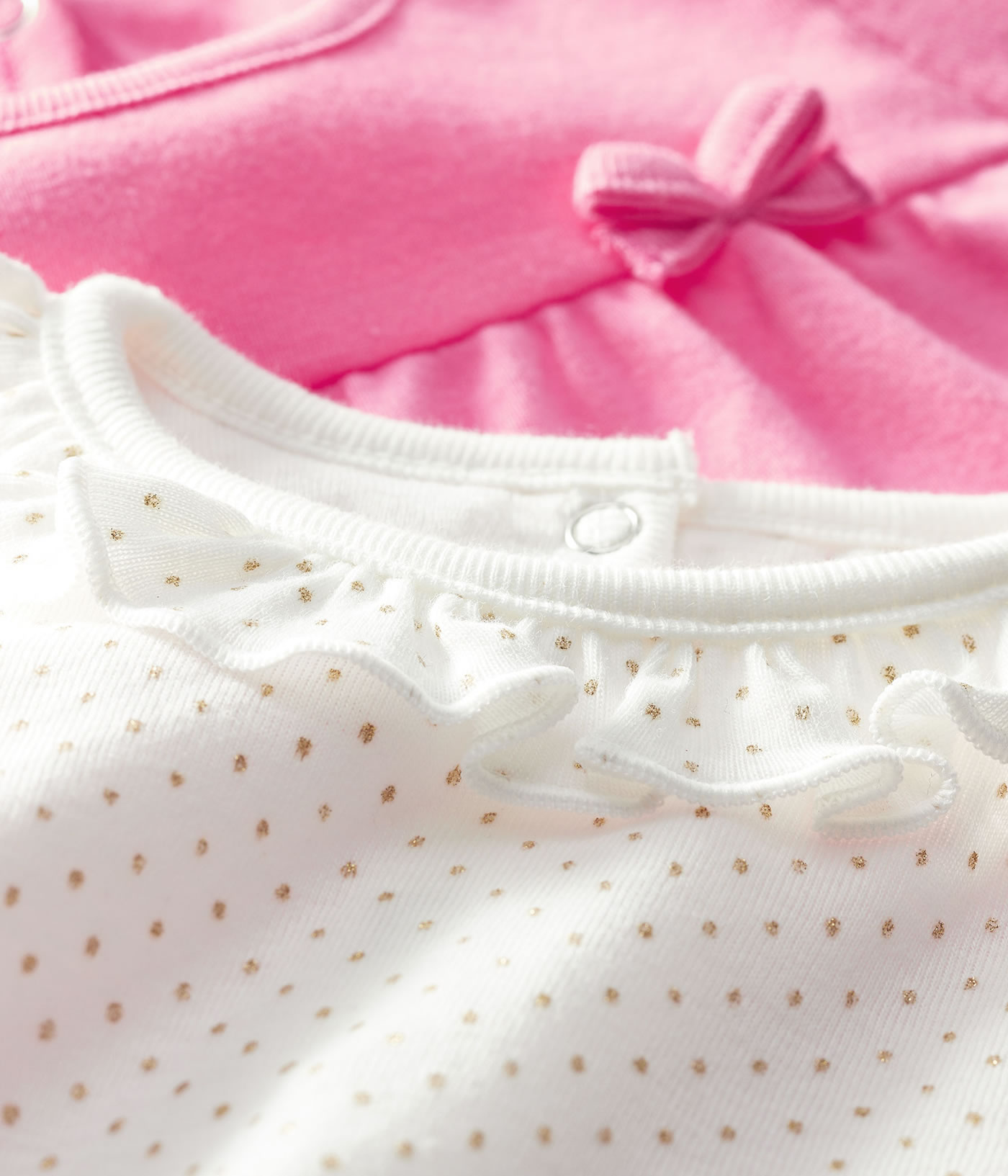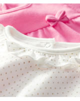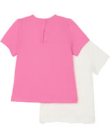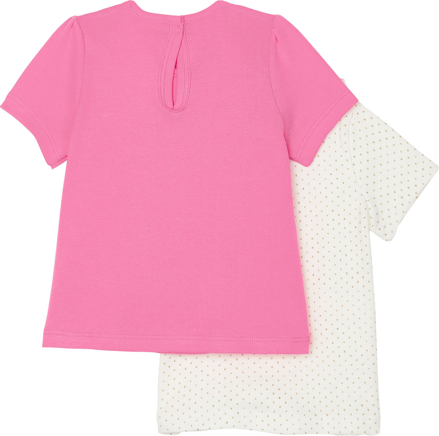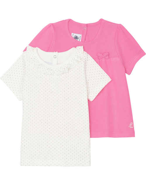 Mädchenhaftes Set von PETIT BATEAU bestehend aus zwei Kurzarm-Shirts in weiß mit goldenen Punkten und hübsch gewelltem Halsausschnitt und in pink mit abgesetzter Brust und kleiner Schleife auf der Vorderseite.