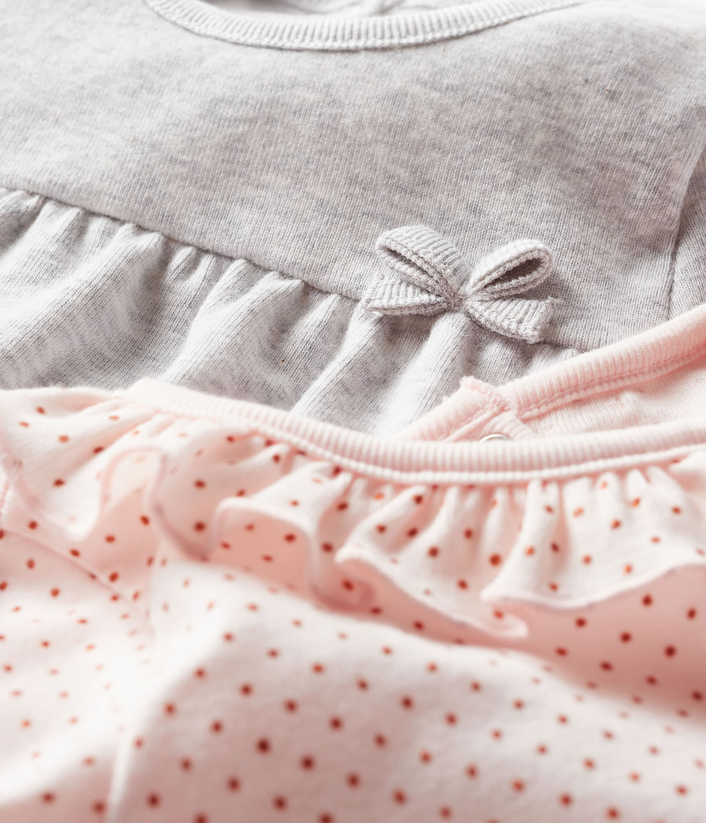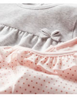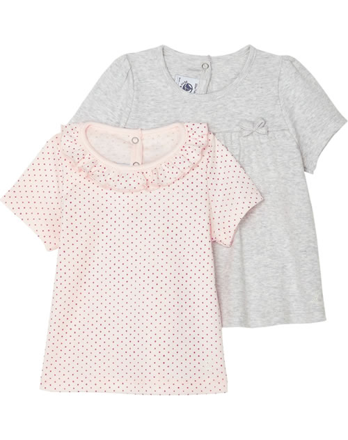 Mädchenhaftes Set von PETIT BATEAU bestehend aus zwei Kurzarm-Shirts in rosa mit pinken Punkten und hübsch gewelltem Halsausschnitt und in grau mit abgesetzter Brust und kleiner Schleife auf der Vorderseite.