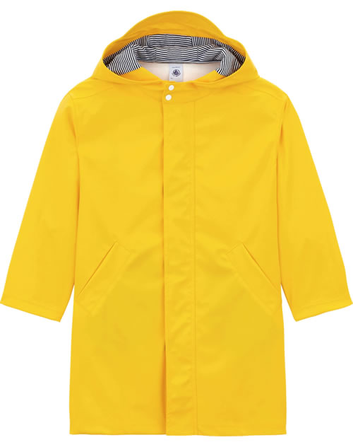 Dieses klassische Bekleidungsstück von PETIT BATEAU braucht keine Einleitung mehr, denn es ist Hauptbestandteil eines jeden Kleiderschranks für Mädchen und Jungen. Der gewachste, geschmeidige Regenmantel mit Kapuze aus gelb leuchtendem, wasserabweisendem Stoff, mit dem angenehm weichen und komfortablen Streifen-Innenfutter schützt bei jedem Regenwetter. Die Kapuze mit Schirm, das blau-weiß geringelte Kapuzenfutter und die großen Einstecktaschen mit viel Platz sind modische Details an dem ansonsten typischen Schnitt.