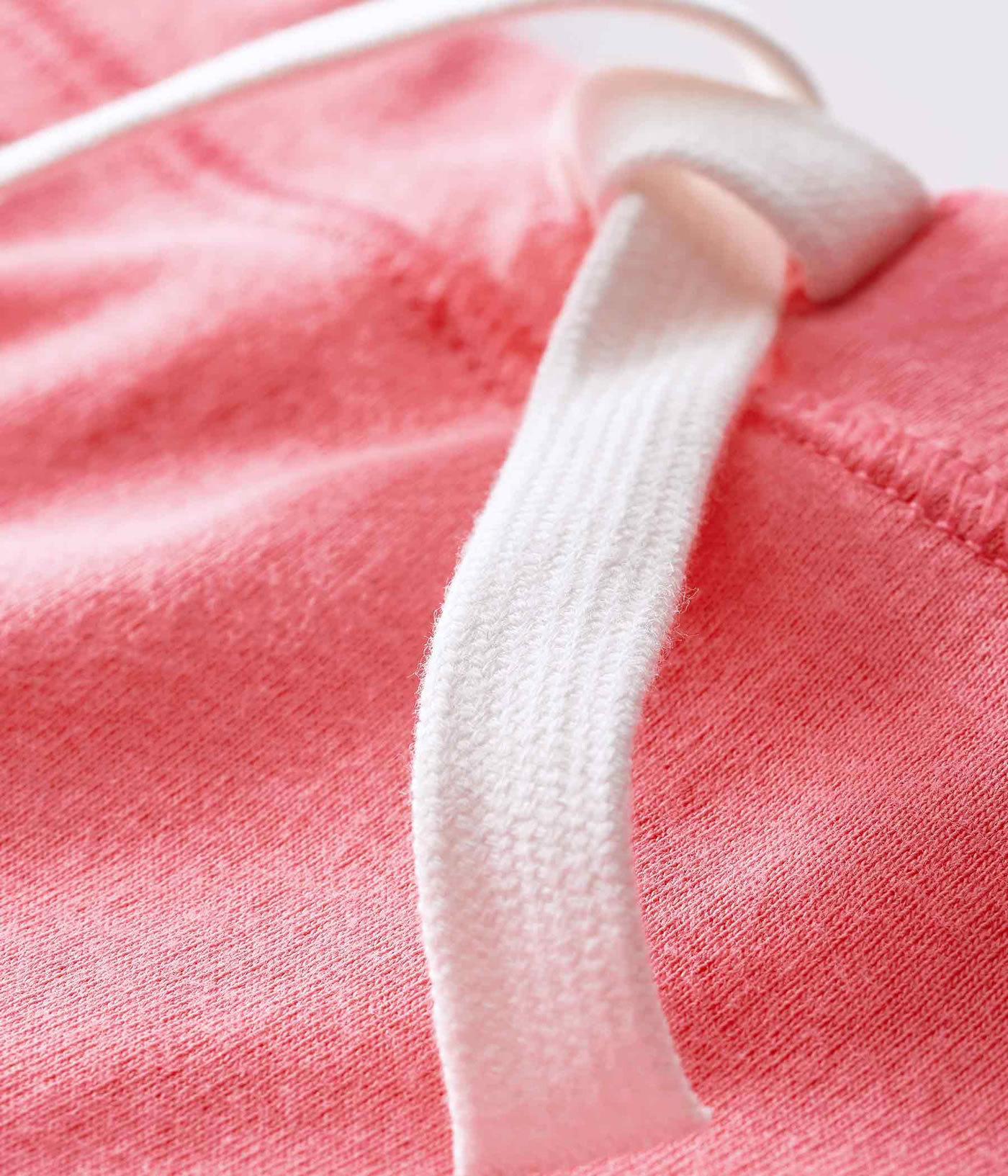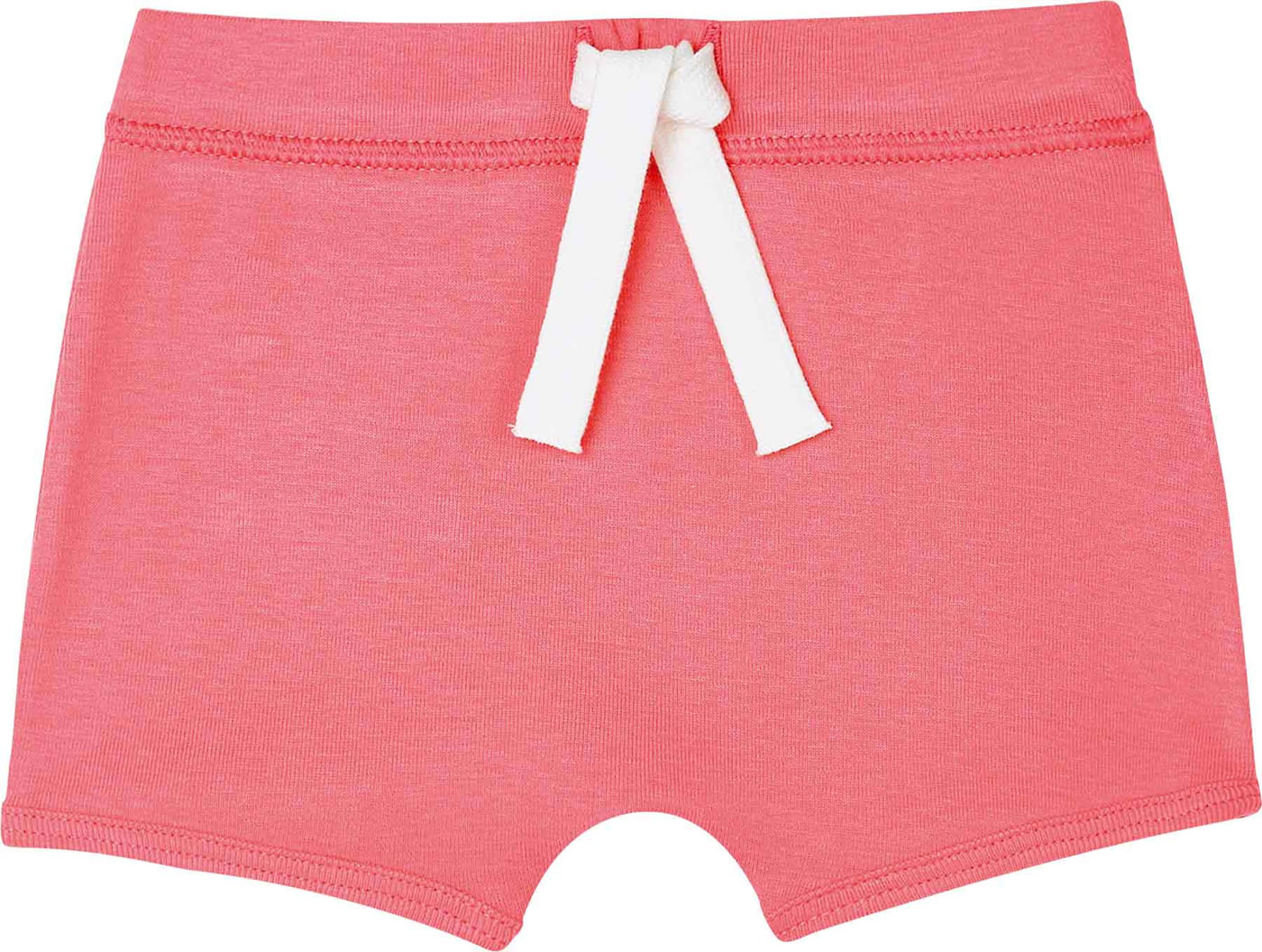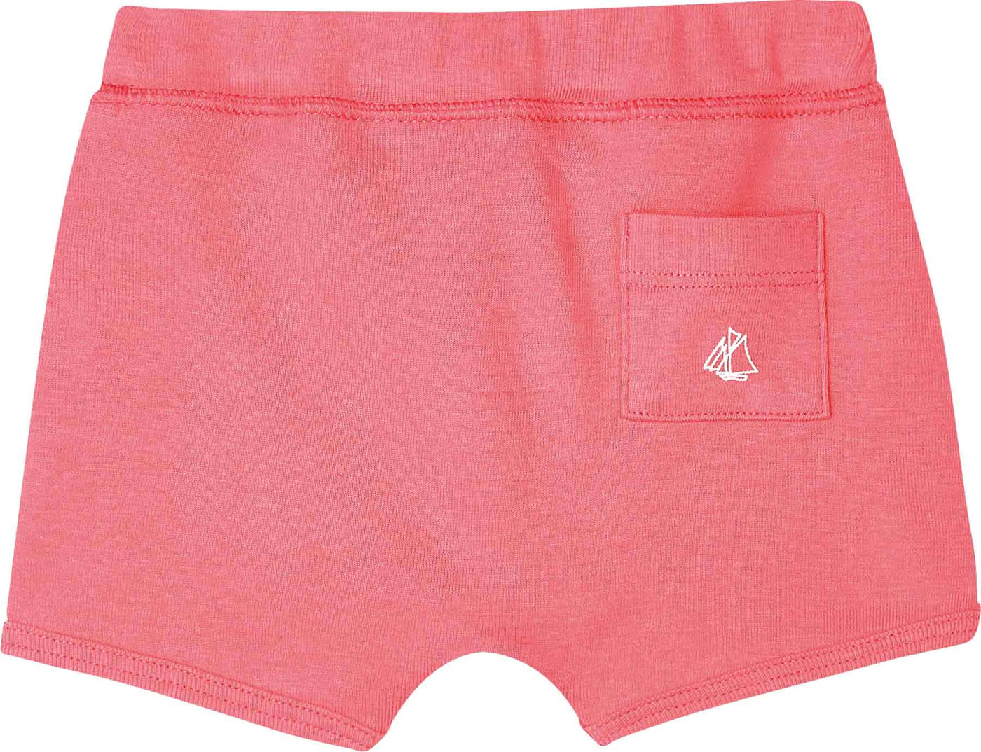 Bequeme Shorts in pink mit Bindeband in weiß von PETIT BATEAU für Mädchen. Auf der Rückseite befindet sich eine Gesäßtasche mit Segelboot-Siebdruck, dem Markenzeichen von Petit Bateau.
