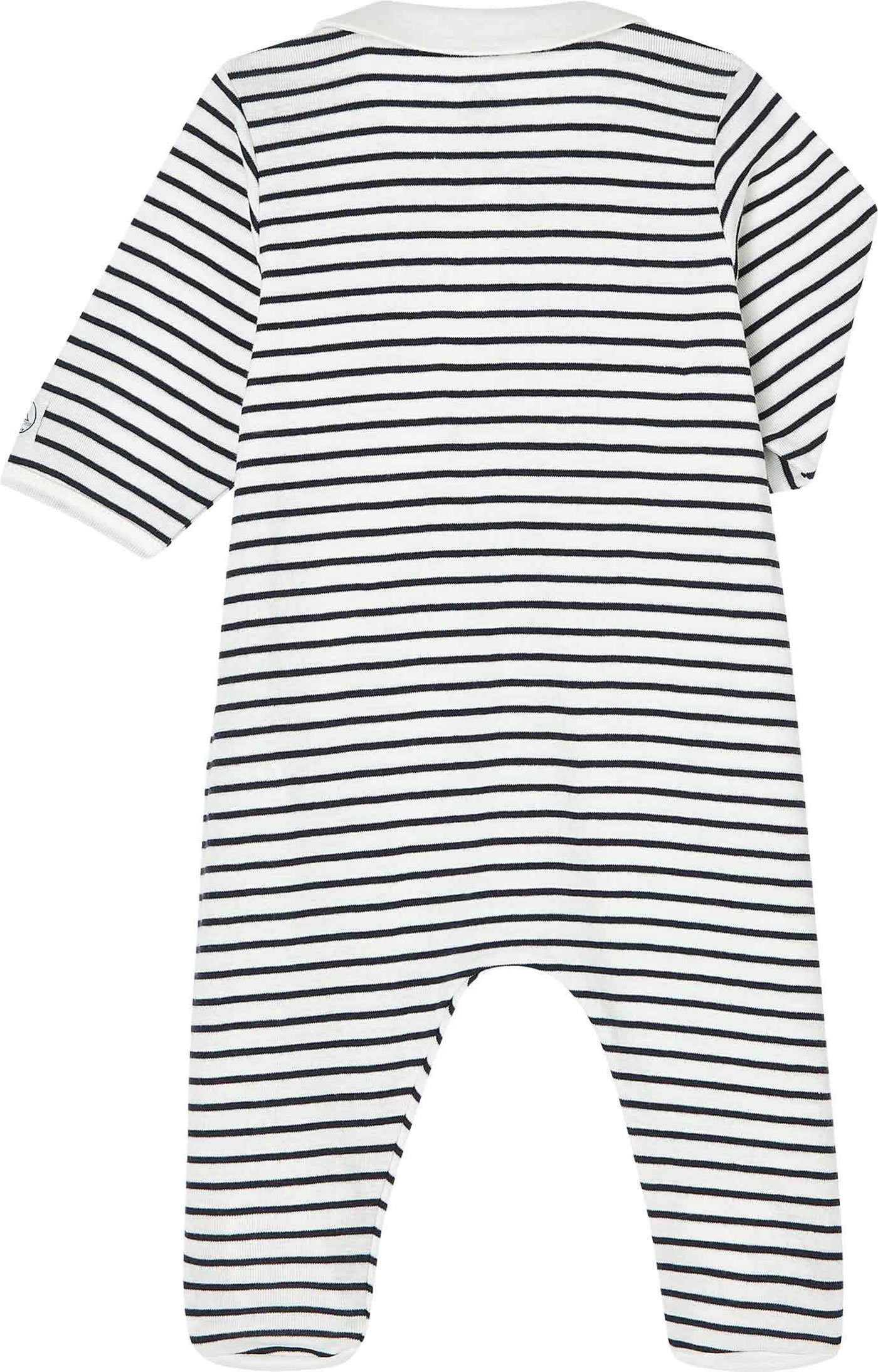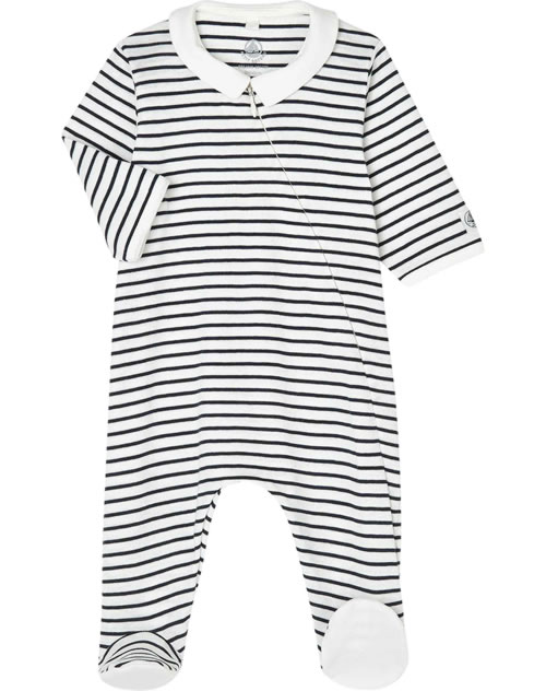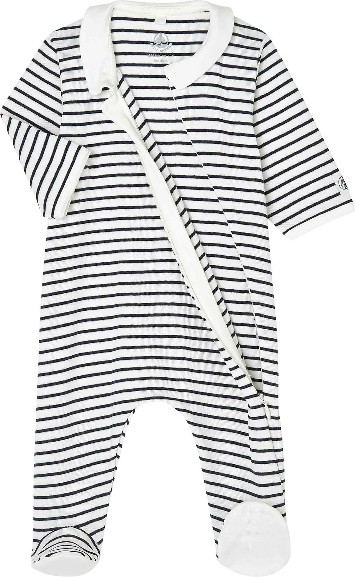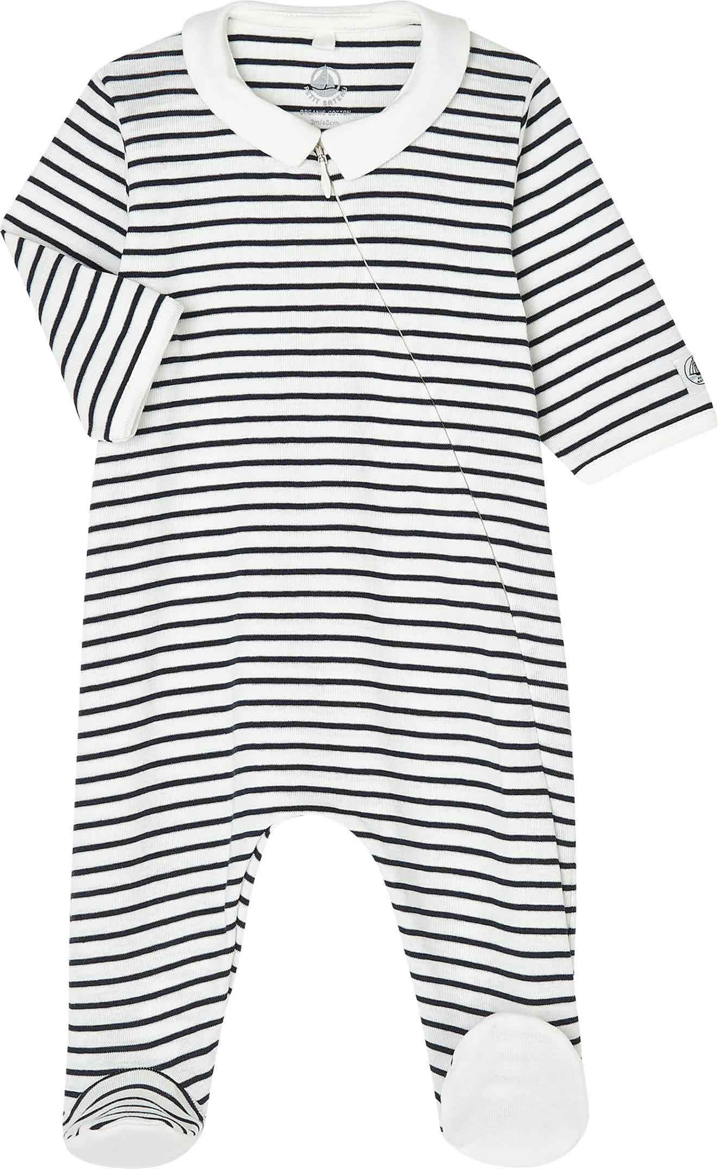 Gestreifter Strampler in blau und weiß mit Kragen und langem Reißverschluss inklusive Kinnschutz von PETIT BATEAU für Jungen und Mädchen.