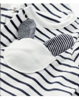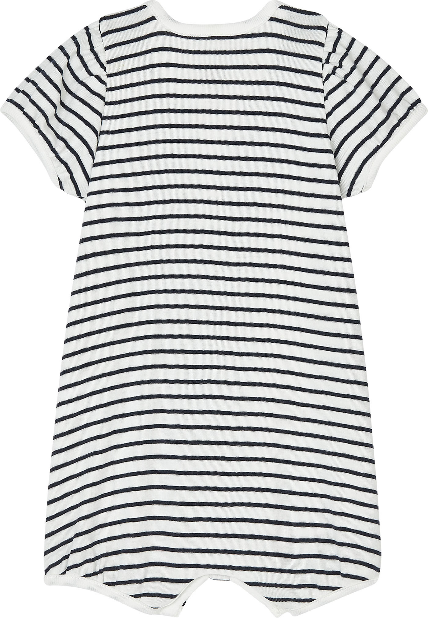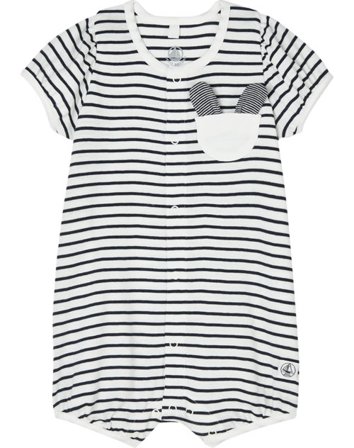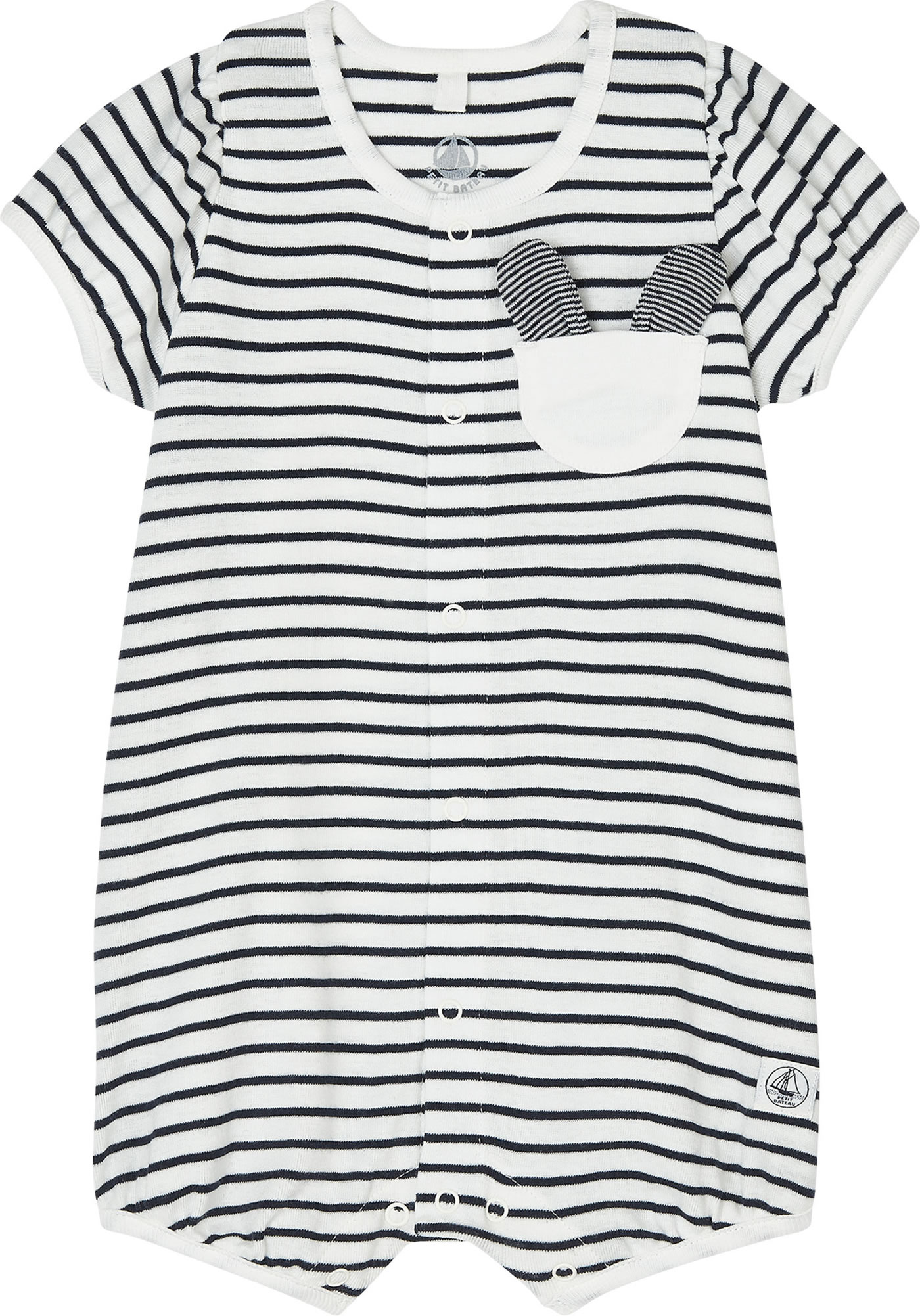 Gestreifter Kurzarm-Strampler in blau und weiß mit langer Druckknopfleiste und niedlicher Brusttasche mit Hasenohren von PETIT BATEAU für Jungen und Mädchen.