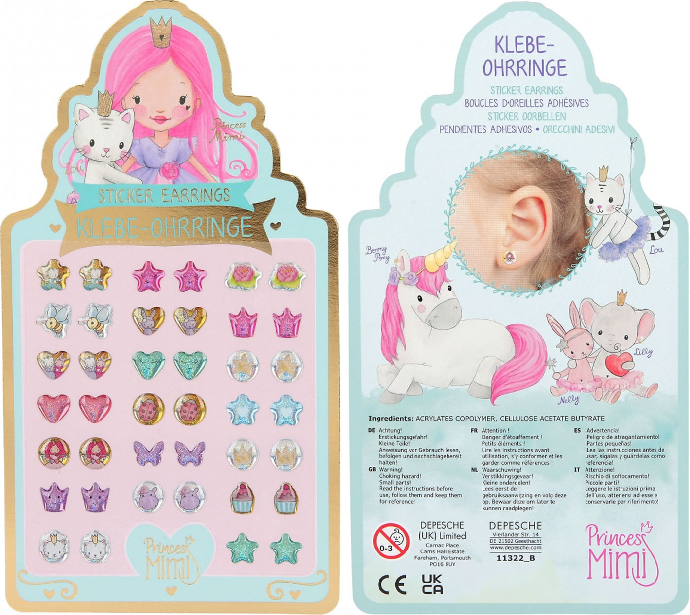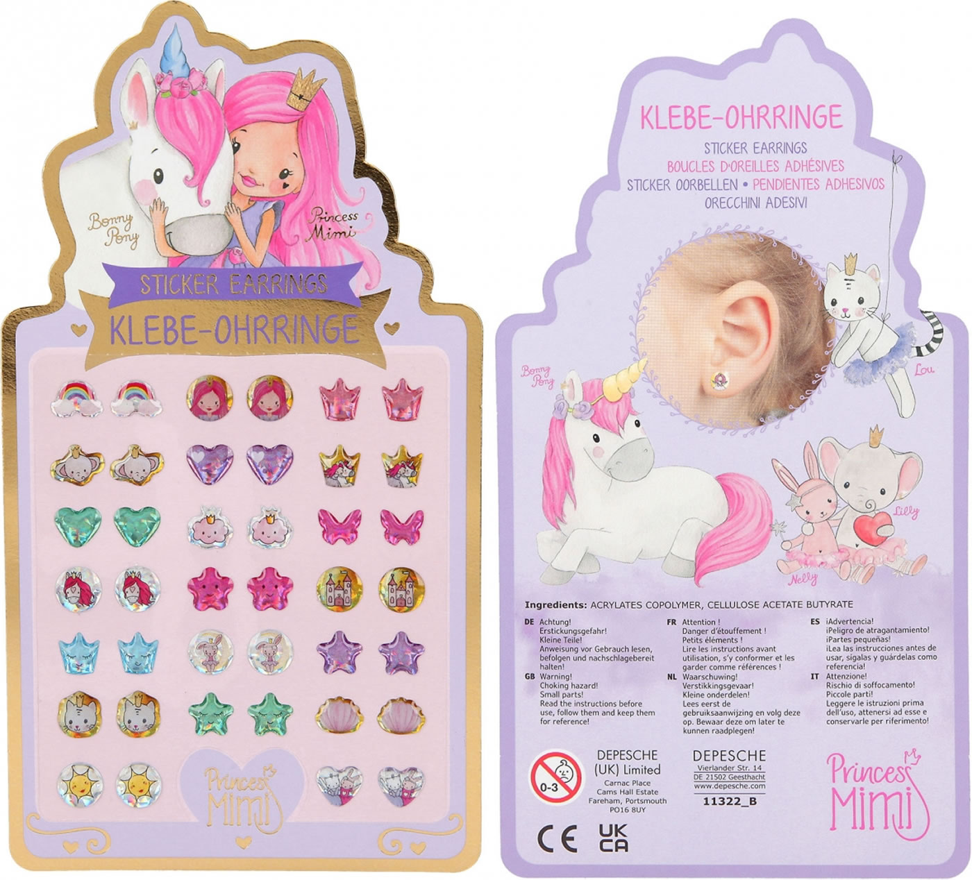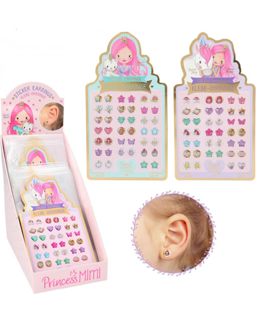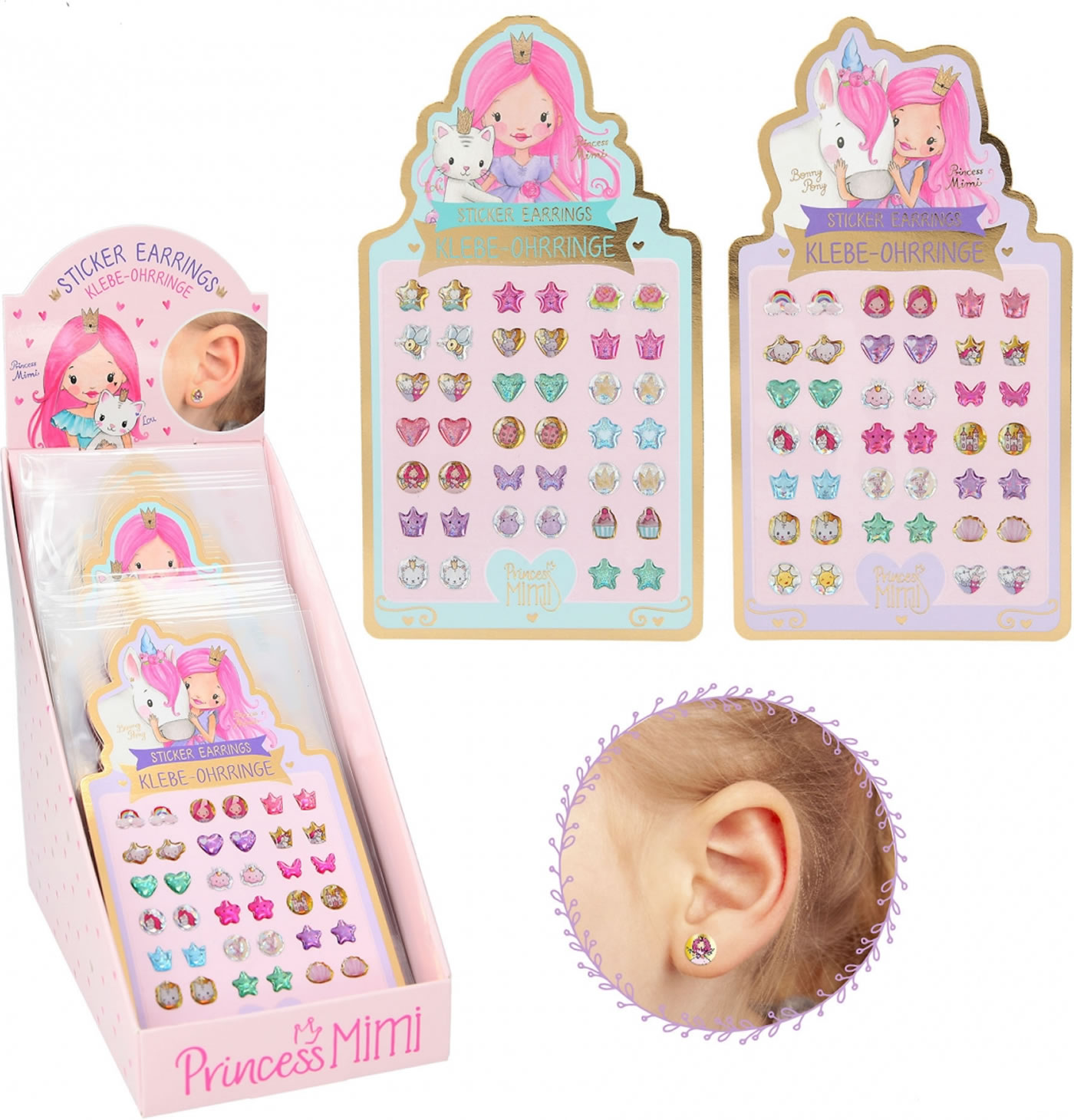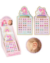 Die selbstklebenden bunten Ohrringe mit Glitzer von Princess Mimi. Sterne, Herzen, Schmetterlinge, Regenbogen und noch mehr! 20 verschiedene Paar Klebe-Ohrringe für kleine Prinzessinnen.
