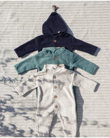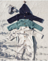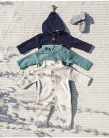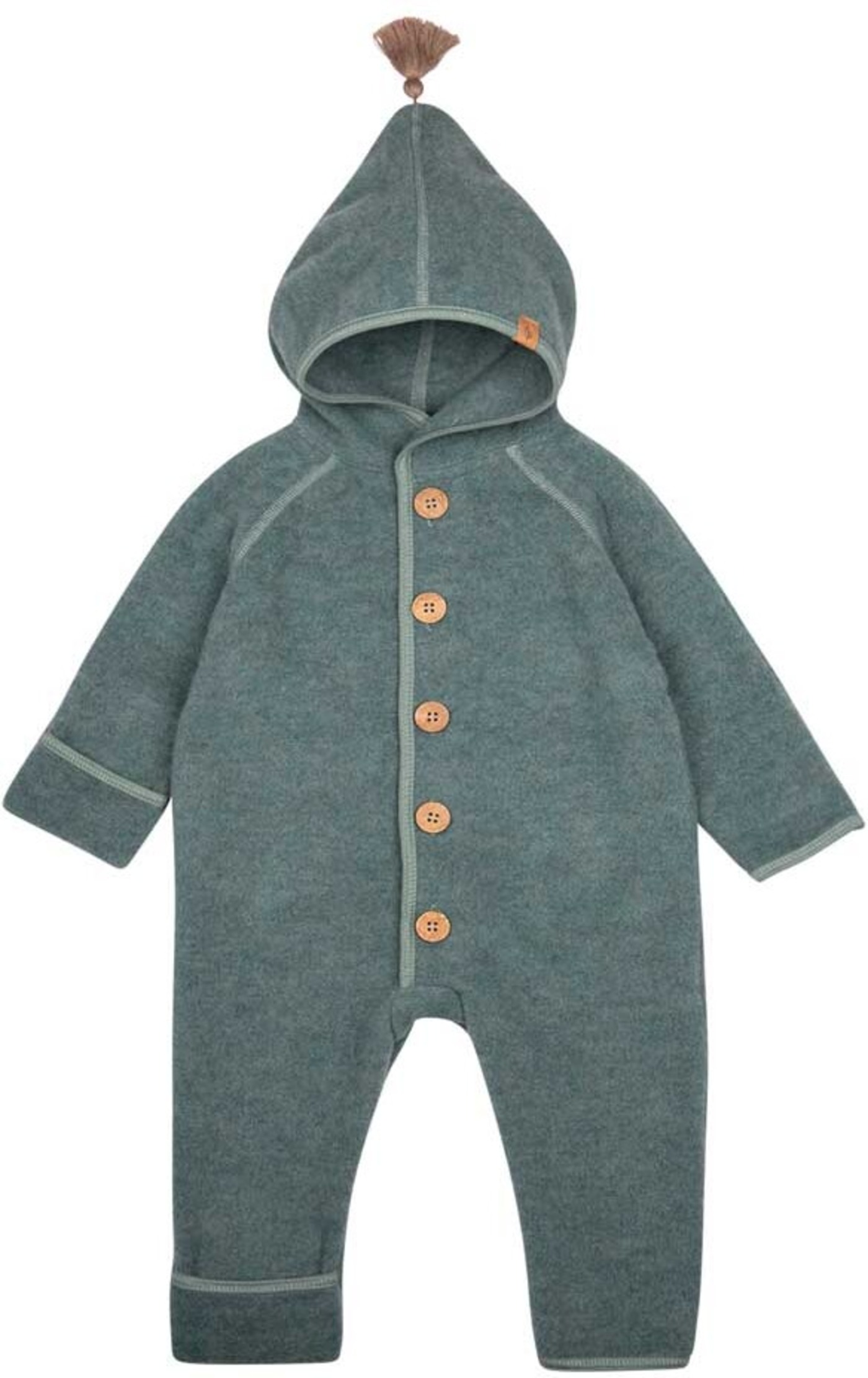 Die hübsche Holz-Knopfleiste und der süße Zipfel an der Kapuze machen diesen Overall zu etwas ganz Besonderem!