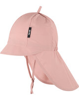 Der clevere Schnitt mit flexiblem Gummi hinten und zusätzlichen Bindebändern sorgt für einen optimalen Sitz, während der leicht verstärkte Schirm und der lange Nacken-/Ohrenschutz kleine Entdecker rundum vor der Sonne bewahren.