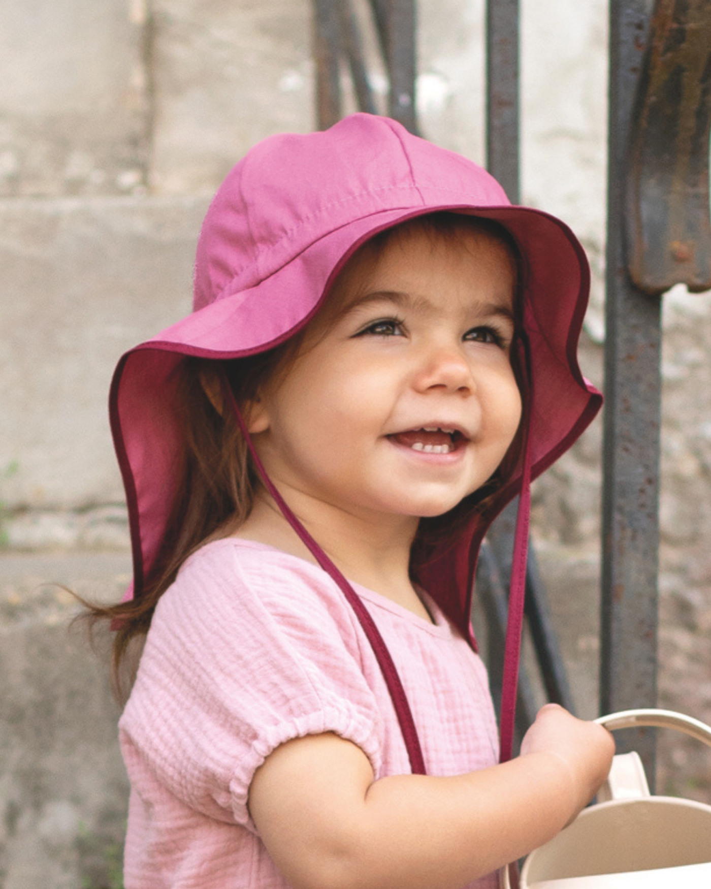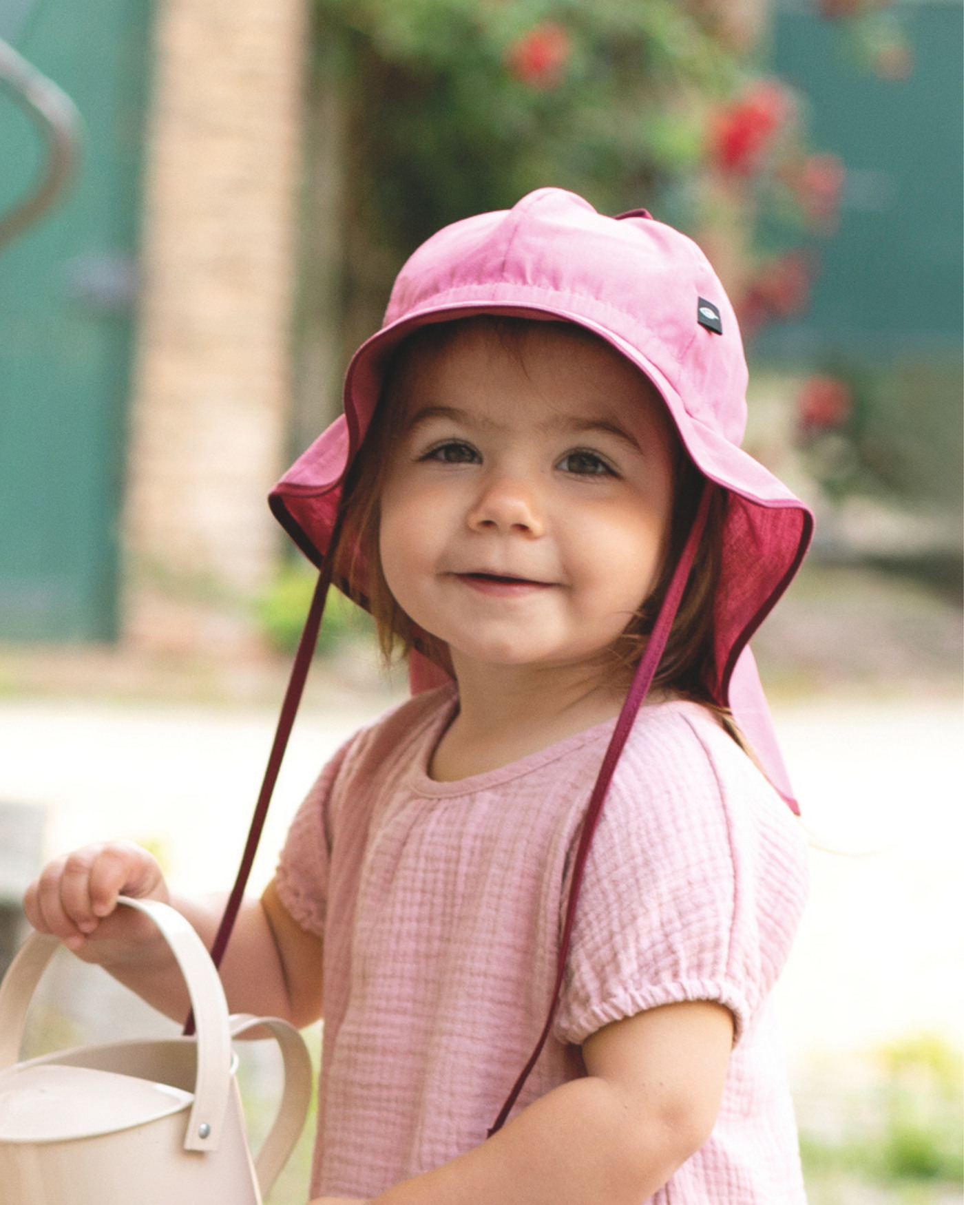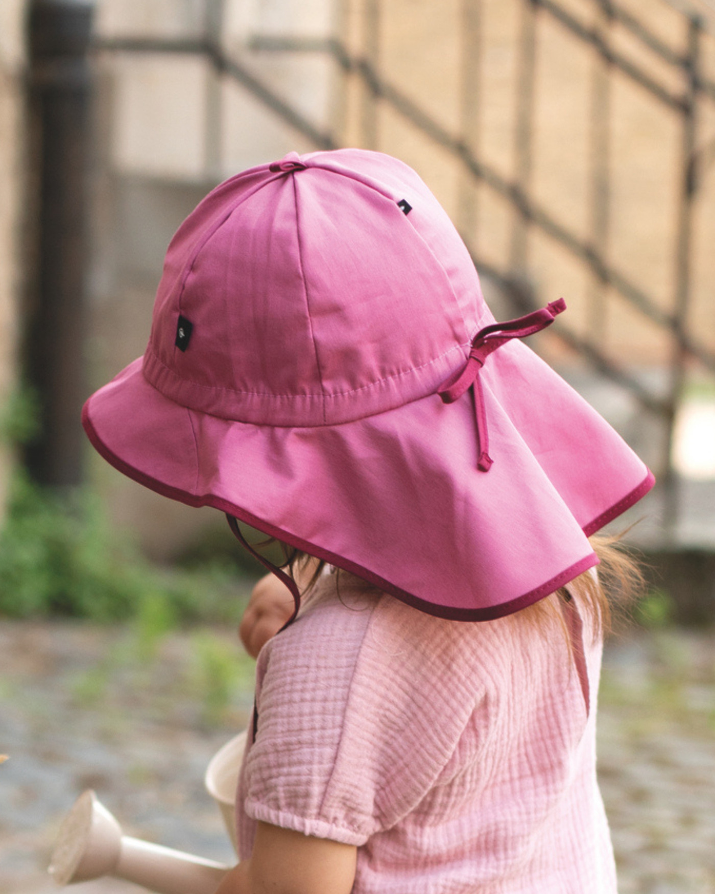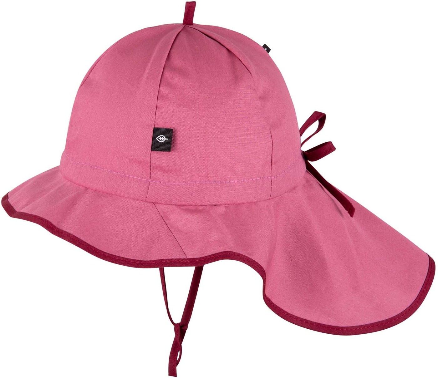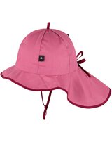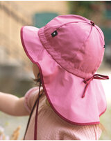 Bindebänder unter dem Kinn sorgen dafür, dass der Sonnenhut auch beim Spielen sicher auf dem Kopf bleibt, während der Nackenschutz zusätzlichen Schutz vor der Sonne bietet.