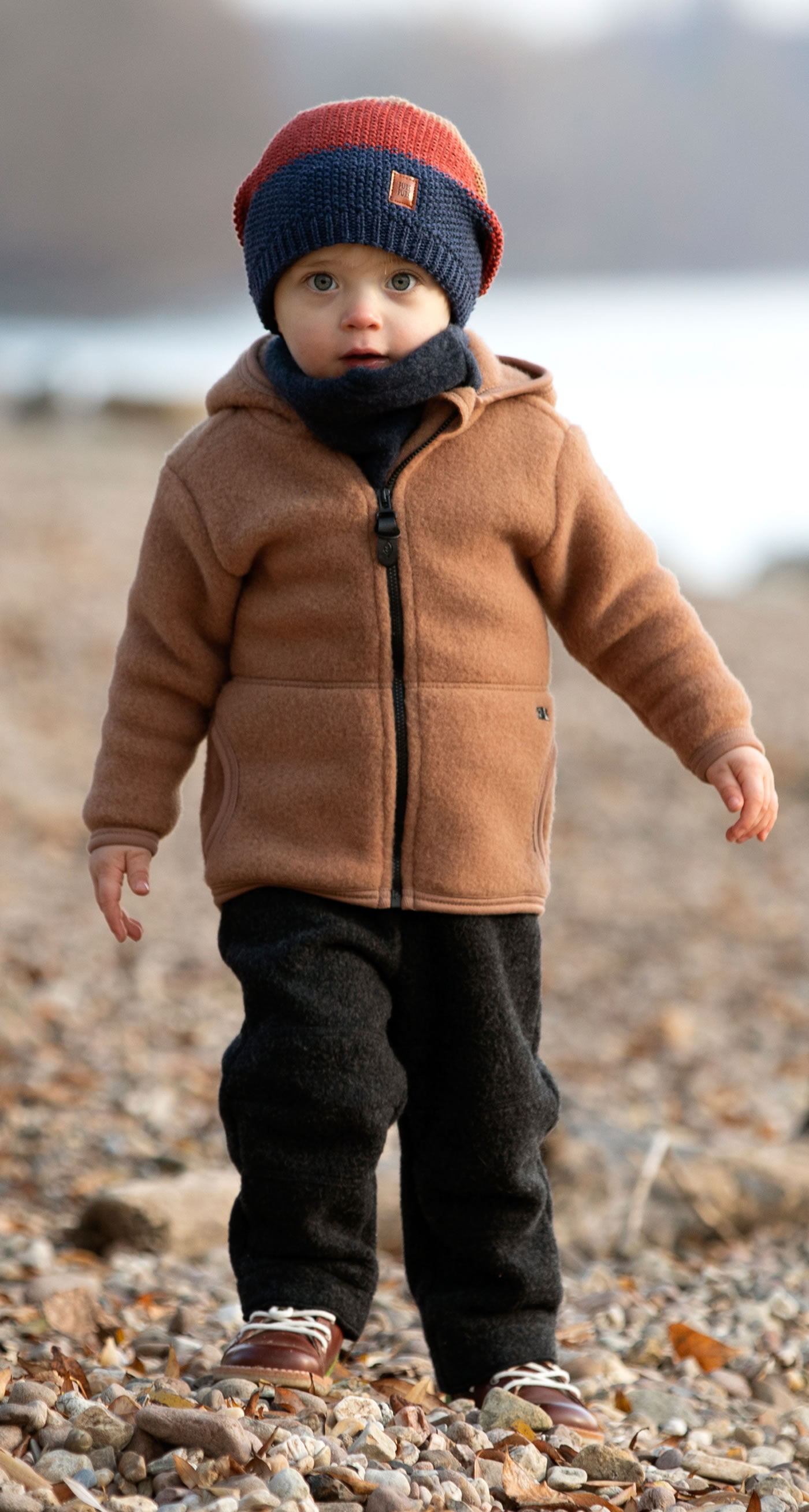 Material: 55 % Merinowolle (kbT), , 23 % Seide, 22 % Baumwolle (kbA); Futter 100 % Merinowolle (kbT) (zertifiziert nach Global Organic Textile Standard - GOTS)