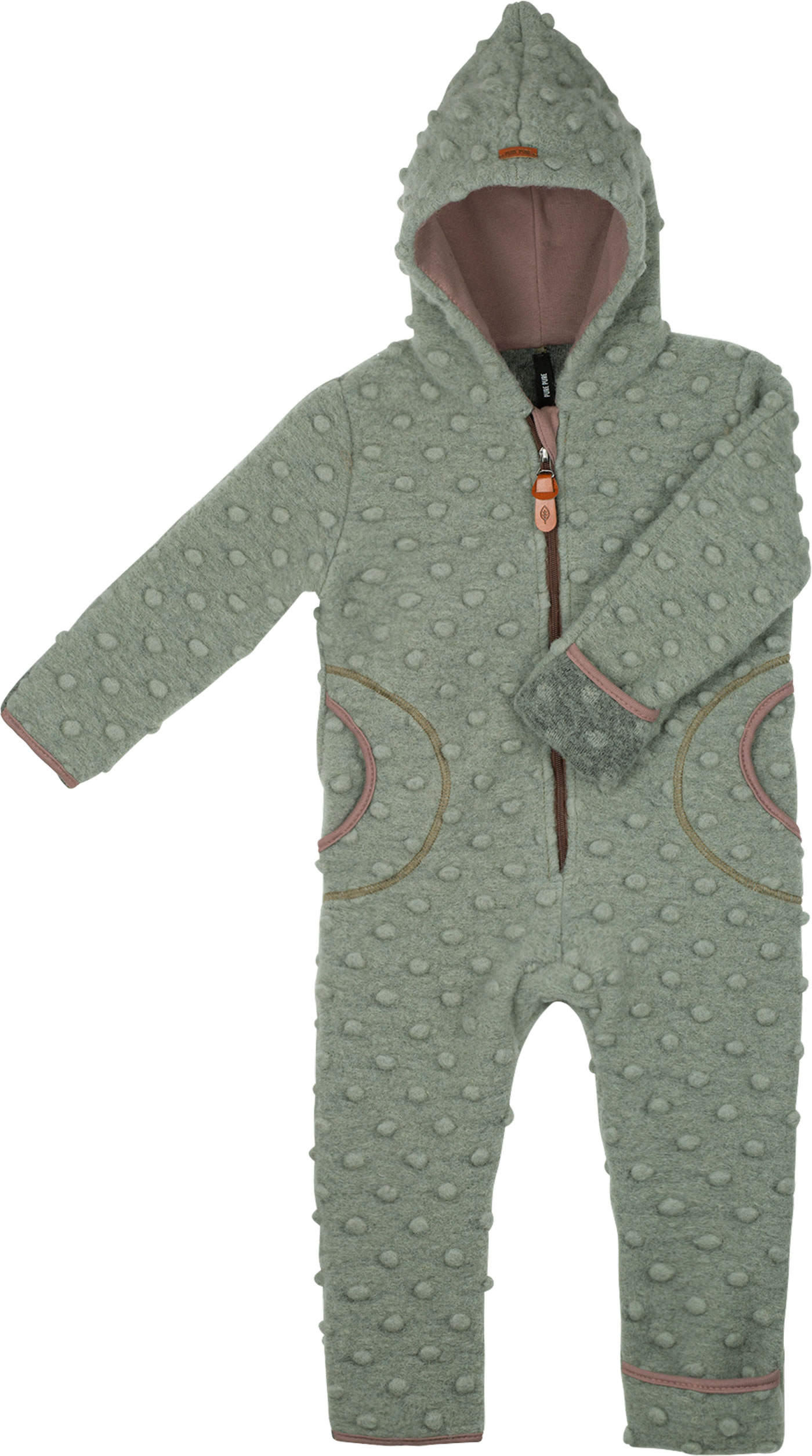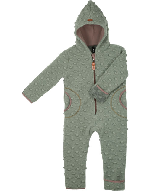 Warmer und weicher Overall mit Kapuze von Pure Pure by Bauer. Der Overall aus gewalkter Wolle ist für kühle Tage besonders geeignet. Der Reißverschluss ist mit einem Kinnschutz ausgestattet und die angeschnittene Kapuze sorgt dafür, dass das Kinn auch schön eingepackt ist. Arme und Beine schließen mit Stulpen ab, so dass auch Hände und Füße schön warm bleiben. Die Kapuze ist mit weichem Baumwolljersey gefüttert. Schöne Details sind die eingestrickten Noppen und die farblich abgesetzten Paspeln.
