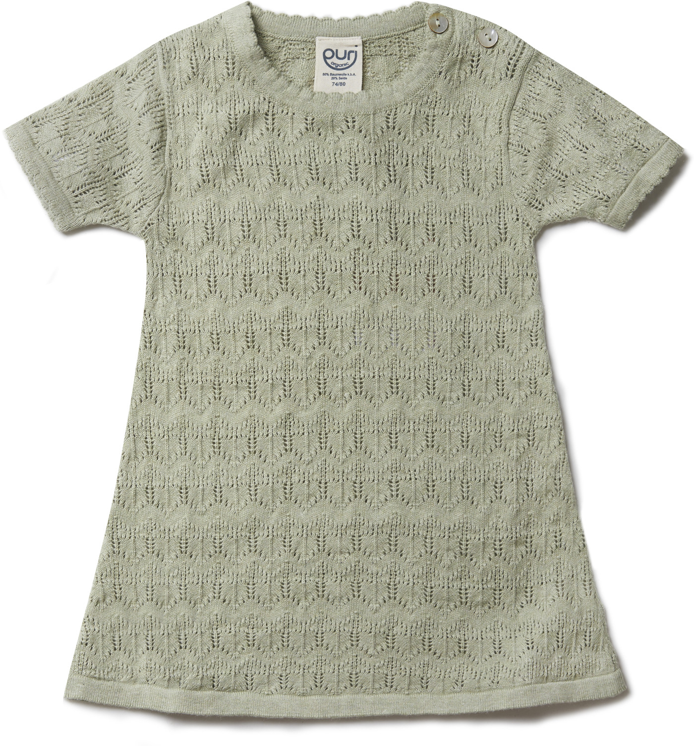 Das elegante Ajour-Strickmuster verleiht dem Kleid eine filigrane, lebendige Struktur, während zwei praktische Knöpfe in Perlmuttoptik an der Schulter das An- und Ausziehen erleichtert und zugleich liebevolle, verspielte Akzente setzt 🌸✨