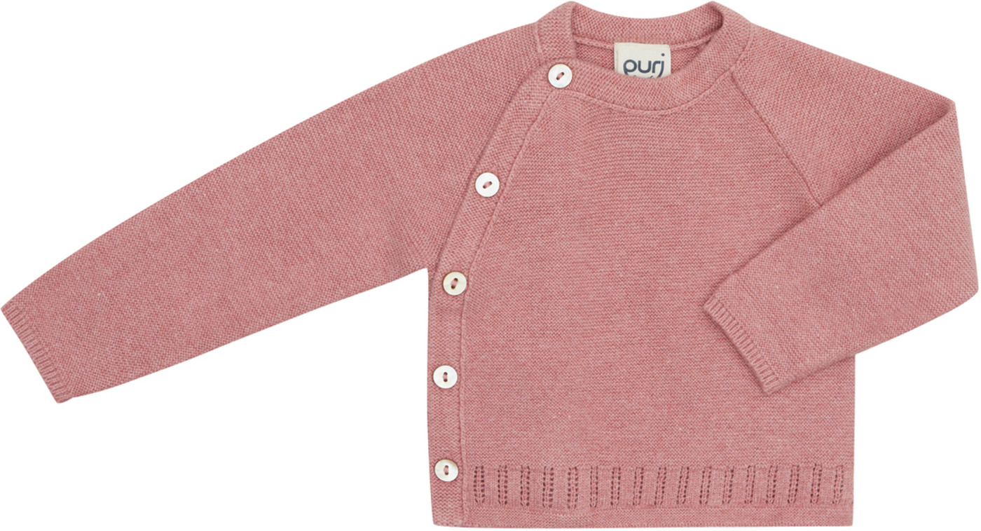 Die weiche und anschmiegsame Wickel-Strickjacke von PURI ORGANIC im leichten rose, ist ein tolles und nachhaltiges Kleidungsstück für die Baby-Ausstattung. Dank eines kleines Perlmuttknopfes in der Jacken-Innenseite und einer Knopfleiste an der Außenseite lässt sich die Baby-Wickeljacke schnell und praktisch an- und ausziehen. Das Material aus Baumwolle aus kontrolliert biologischem Anbau und Seide ist besonders sanft auf der Babyhaut.