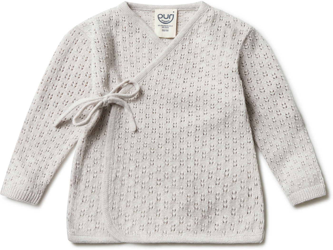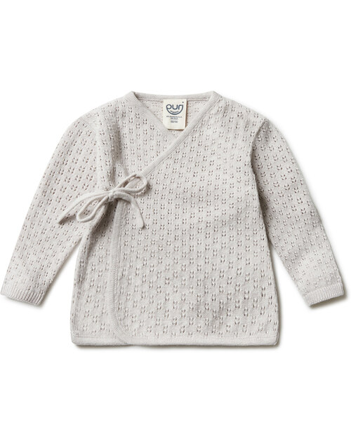 Die weiche und anschmiegsame Wickel-Strickjacke von Puri Organic ist ein wunderbares, nachhaltiges Lieblingsstück für die Baby-Erstausstattung. ❤