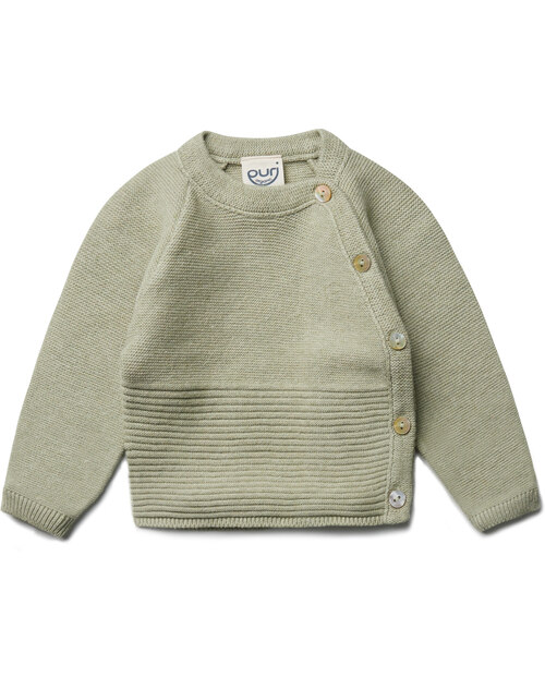 Dieser wunderbar weiche und anschmiegsame Wickel-Strickpulli im wunderschönen Krausstrick ist ein tolles und nachhaltiges Kleidungsstück für die Baby-Ausstattung.