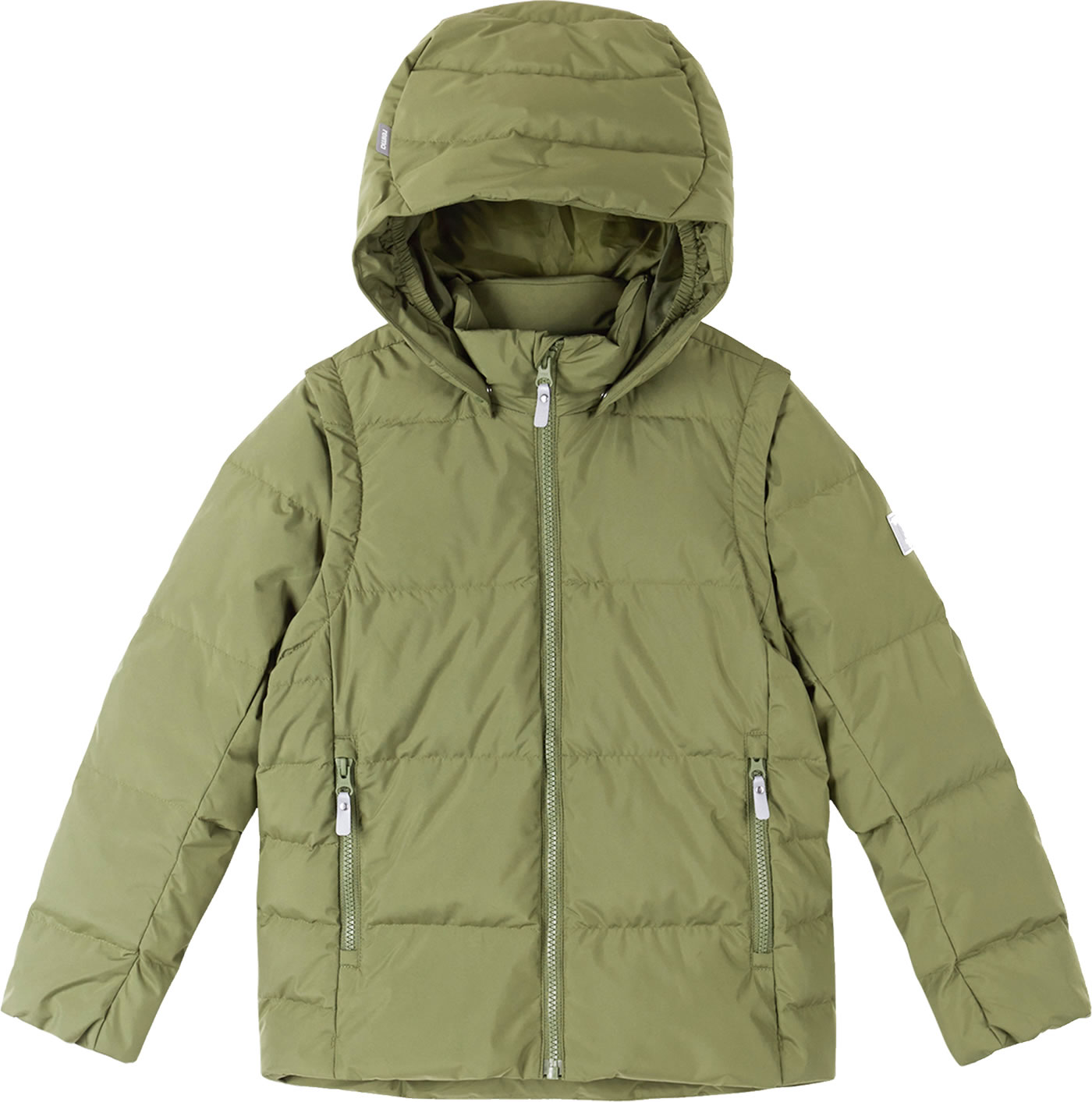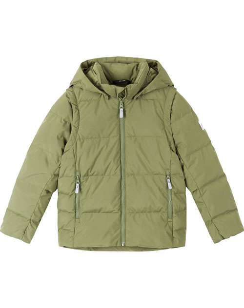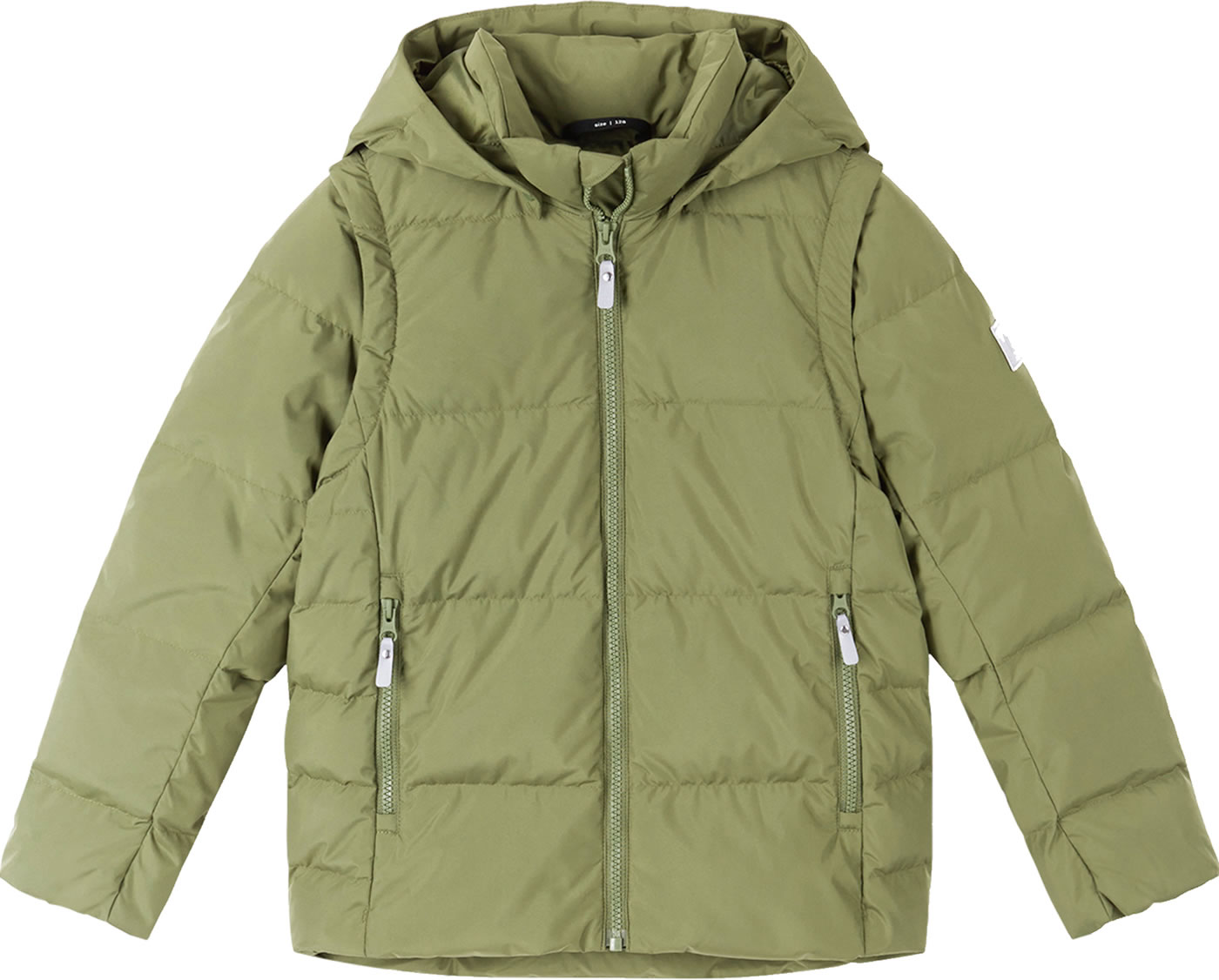 Kurz geschnittene 2in1 Jacke POROSEIN von REIMA mit abknöpfbarer Kapuze. Die Jacke ist ideal für kühle Wintertage und hält dank der Daunenfüllung auch bei kalten Temperaturen mollig warm. Der Clou ist, dass sie auch als Weste getragen werden kann. Die Ärmel lassen sich einfach abzippen. Reflektierende Elemente sorgen für eine gute Sichtbarkeit im Dunkeln und die beiden Reißverschlusstaschen bieten Platz für kleine Schätze. Die Rückseite ist etwas länger geschnitten.