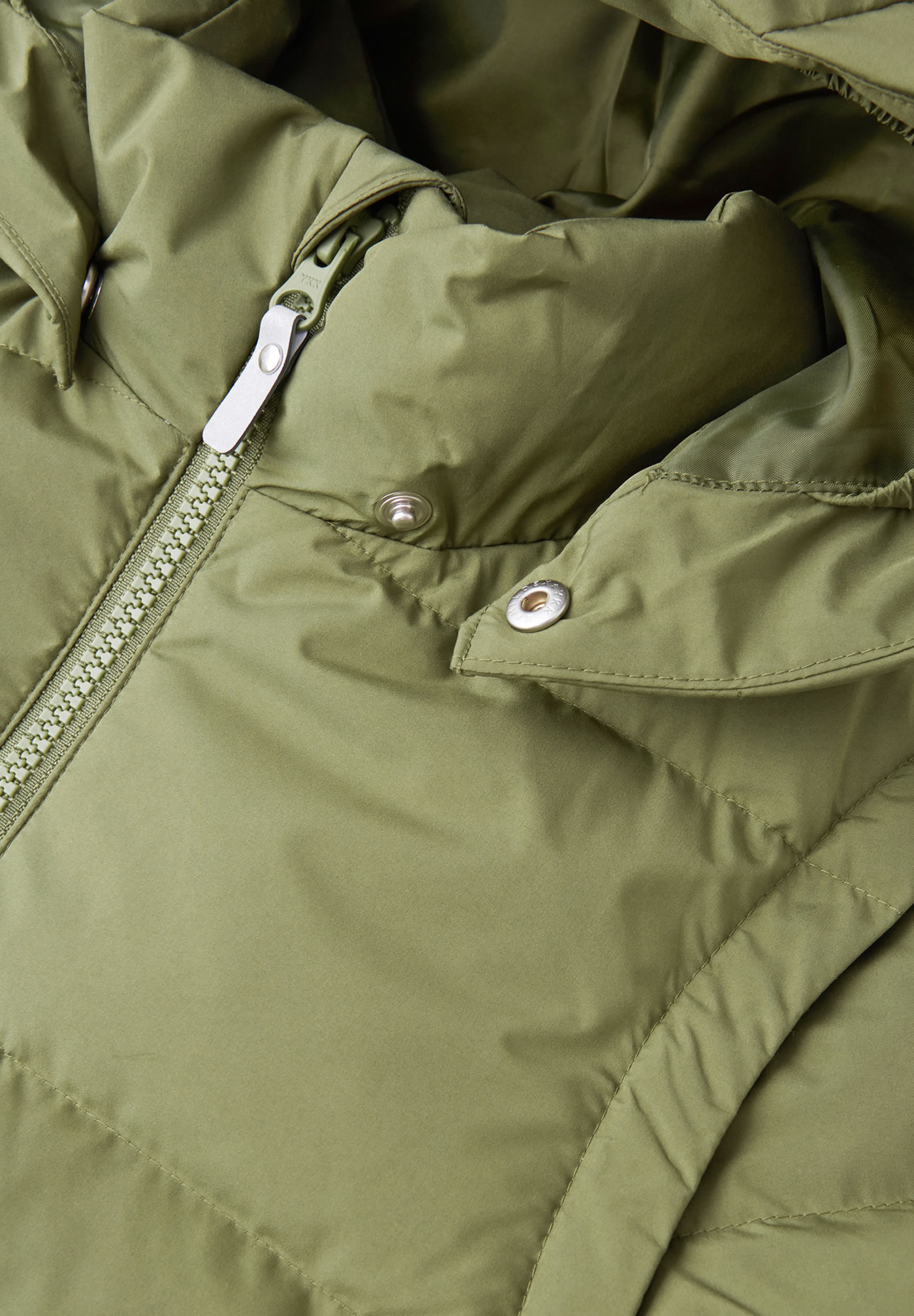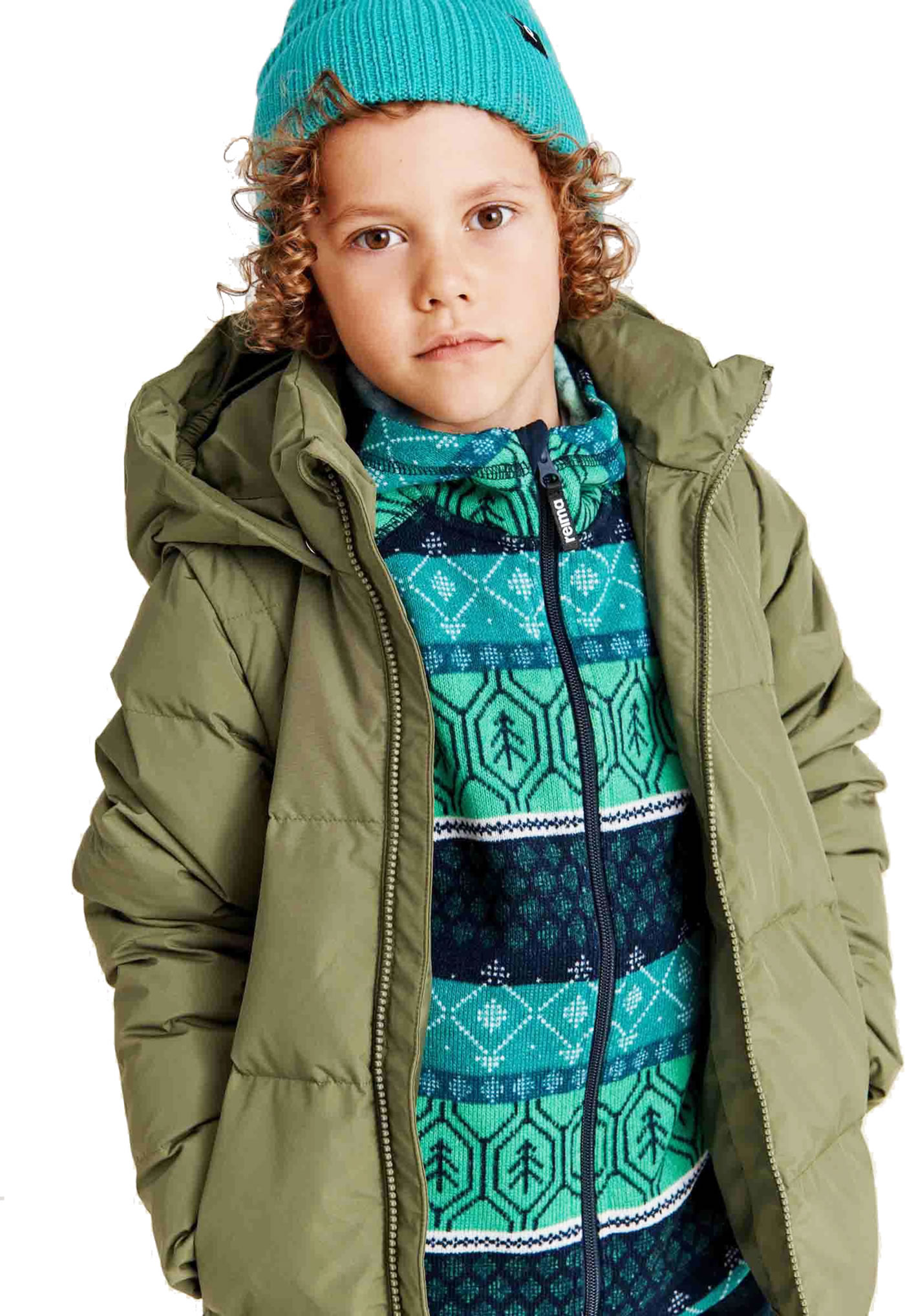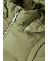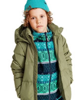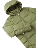 Die gesteppte Jacke wird aus einem wärmespeichernden Stoff auf Basis von gemahlenem Kaffee gefertigt. Für die Herstellung wird gemahlener Kaffee bei sehr hohen Temperaturen verkohlt und in mikroskopisch kleine Partikel zerkleinert, die sich durch eine Wabenstruktur auszeichnen. Wenn diese zu Polyester verarbeitet werden, entstehen winzige Löcher in den Fasern, die Wärme speichern. In Kombination mit einer Füllung aus 60% Daunen und 40% Federn hält dieses neue, schimmernde Material auf der Basis von Kaffeebohnen Kinder draußen schön warm.