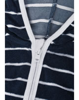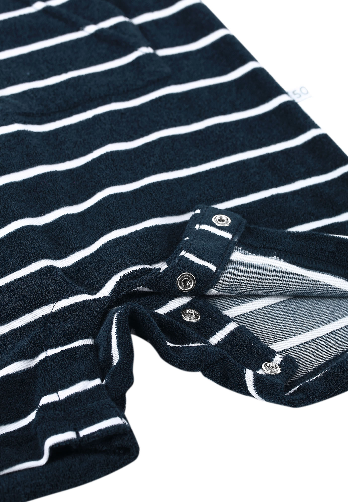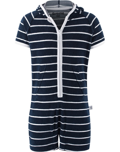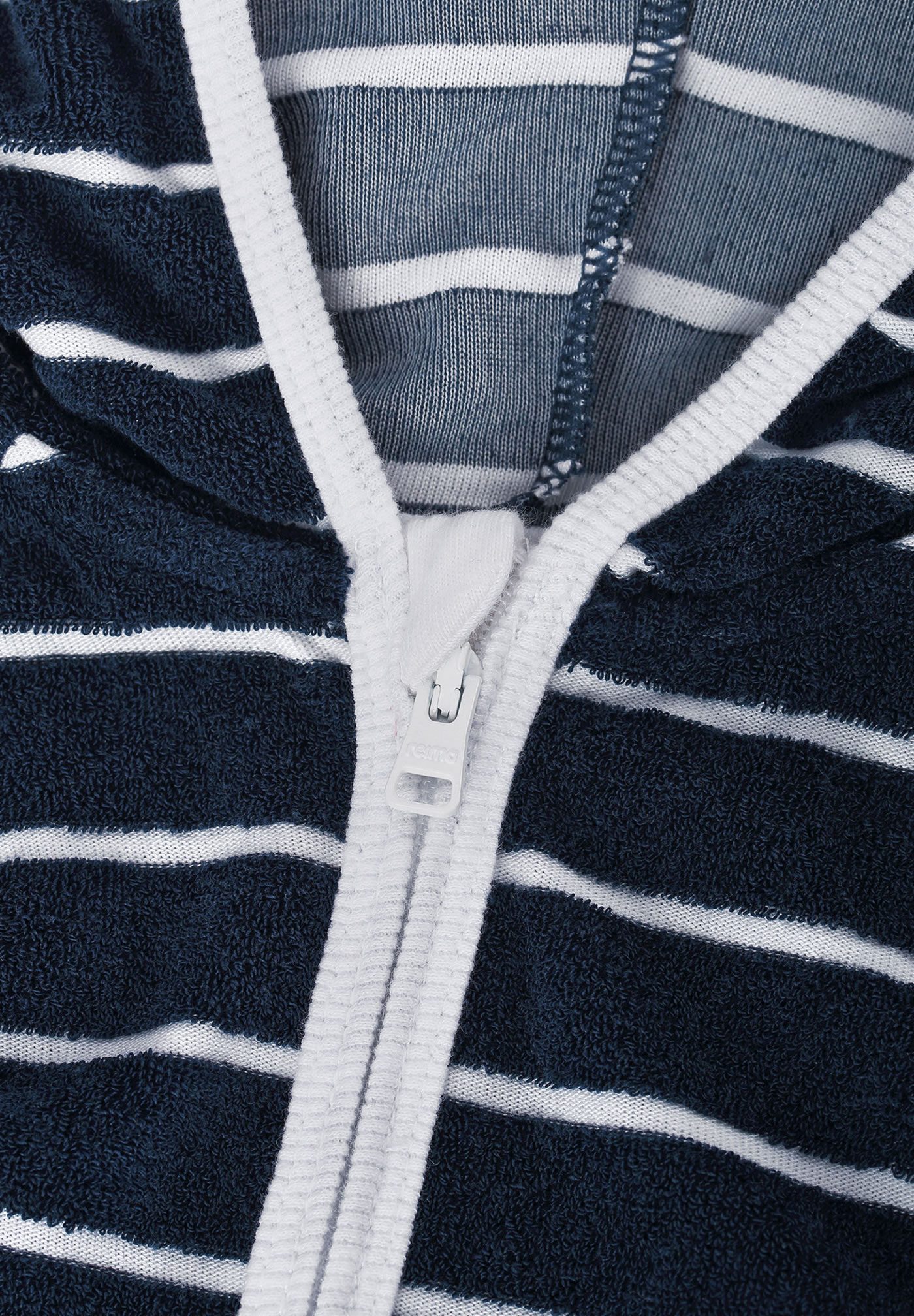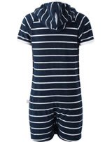 Bequem, stylish und mit UV-Schutzfaktor 50+: der Frottee-Overall mit kurzen Ärmeln und Kapuze im peppigen Streifendesign hat viele Vorteile und sieht zudem noch toll aus! Ideal für den Ausflug zum Strand oder ins Freibad. Das weiche Modell für Mädchen und Jungen mit Reißverschluss in dunkelblau ist ein Lieblingsstück für die Sommerzeit.