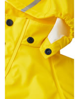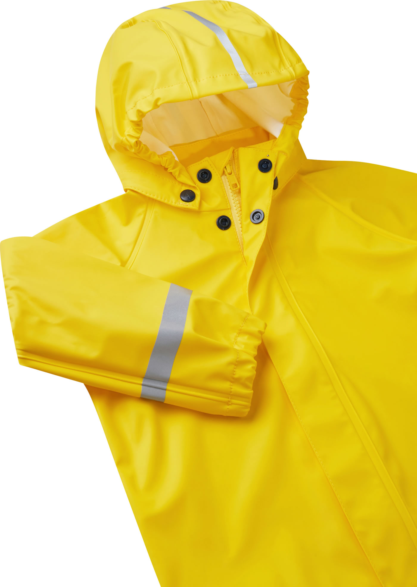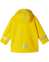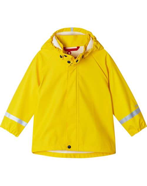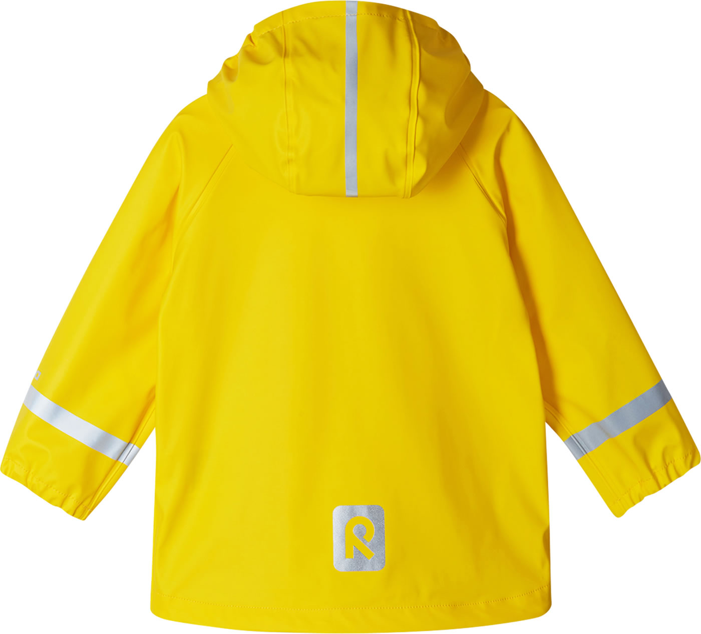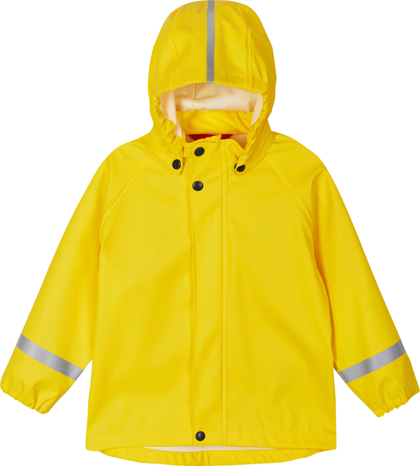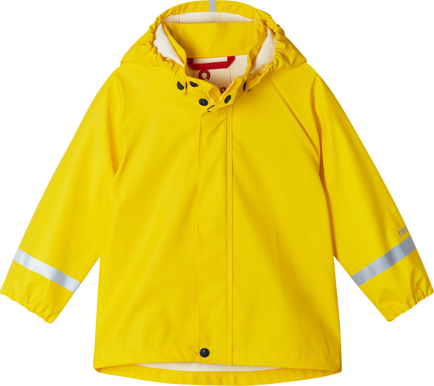 Farbenfrohe Regenjacke VESI von REIMA. Die Kinderregenjacke besteht aus flexiblem und PVC-freiem Material und die Nähte sind wasserdicht verschweißt. Bei Nieselwetter und Wind schützt die abnehmbare Kapuze. Die reflektierenden Details sorgen für gute Sichtbarkeit in der Dunkelheit.