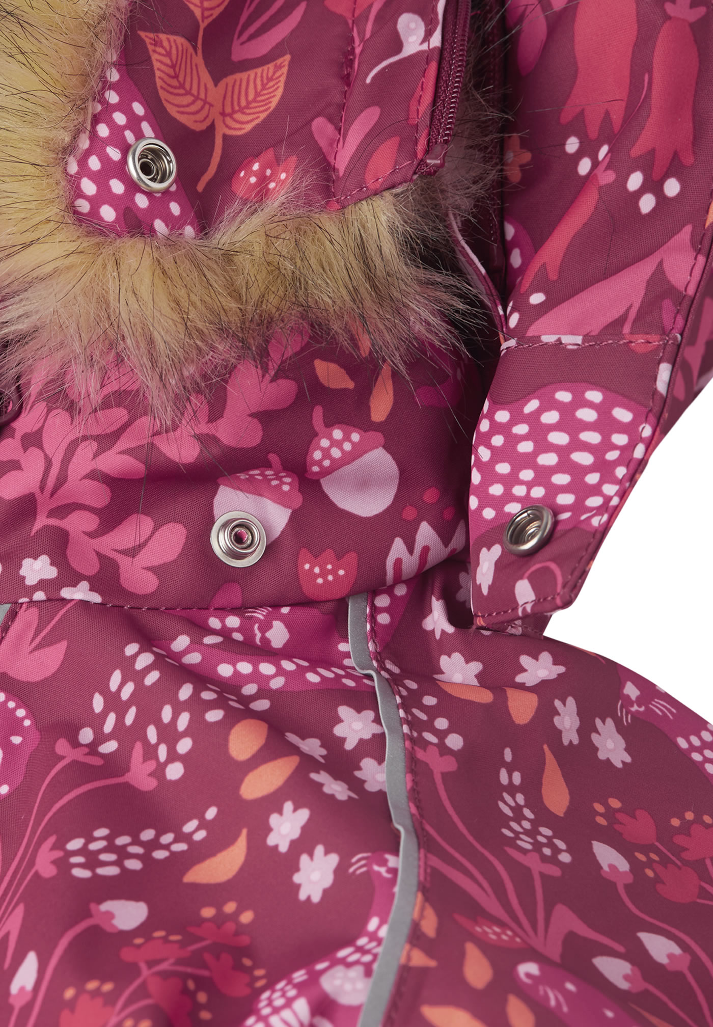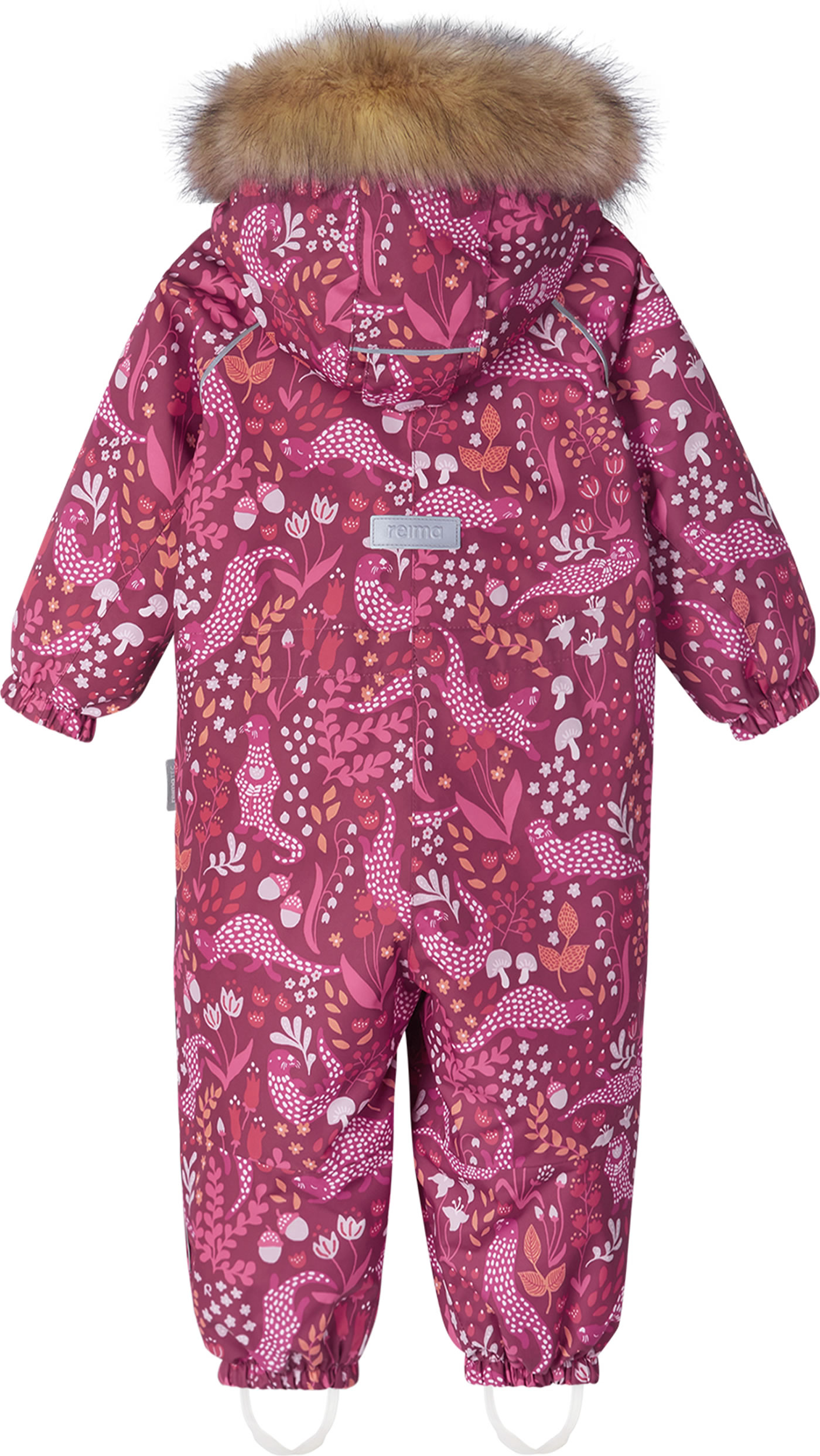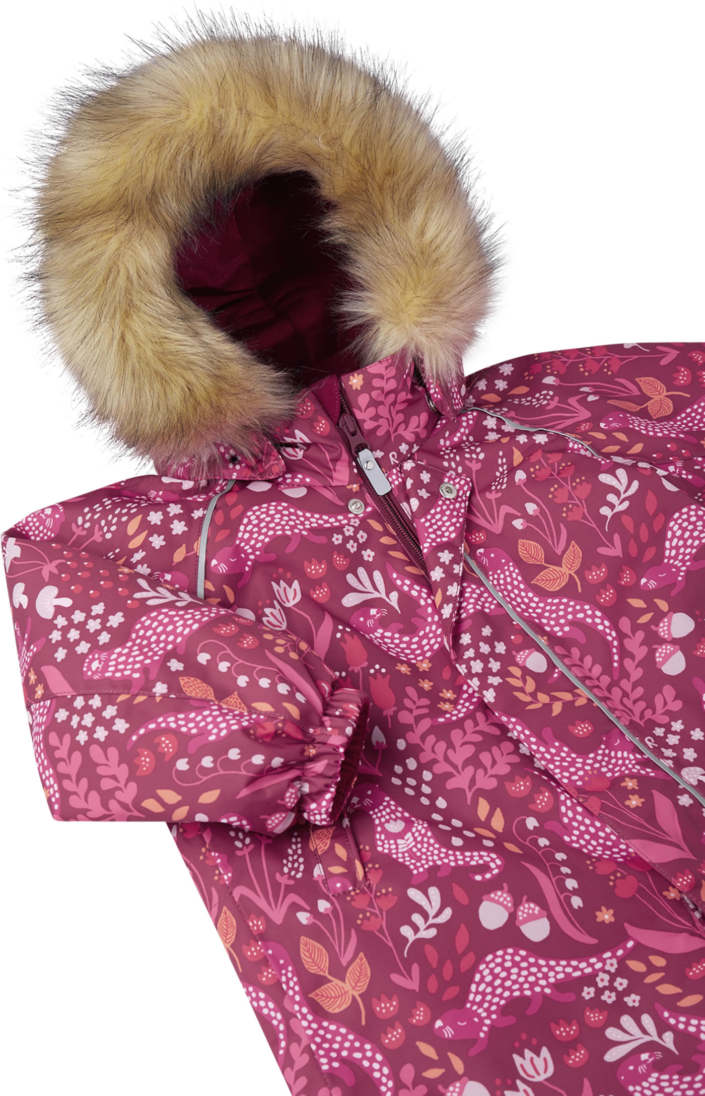 Ausgezeichneter Winter-Overall LAPPI aus teilweise recyceltem Material von REIMA mit Otter-Muster für Kleinkinder! Die Hauptnähte des Overalls aus wasserdichtem Material sind versiegelt. Der isolierte Hosenboden wärmt zusätzlich beim Spielen im Schnee. Die Weite kann in der Taille reguliert werden. Außerdem besitzt er elastische Bündchen an den Beinabschlüssen. Die mit Druckknöpfen befestigte abnehmbare Kapuze schützt vor kaltem Wind und löst sich schnell, wenn sie sich irgendwo verfängt. Der abnehmbare Kunstpelz-Besatz ist mit einem Reißverschluss befestigt. Die abnehmbaren Fußschlaufen aus Silikon verhindern das Hochrutschen. Reflektierende Elemente sorgen für eine bessere Sichtbarkeit im Dunkeln. Der lange Reißverschluss erleichtern das An- und Ausziehen.