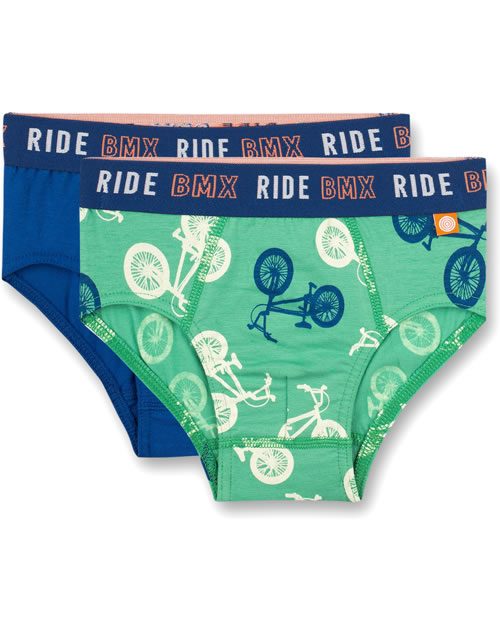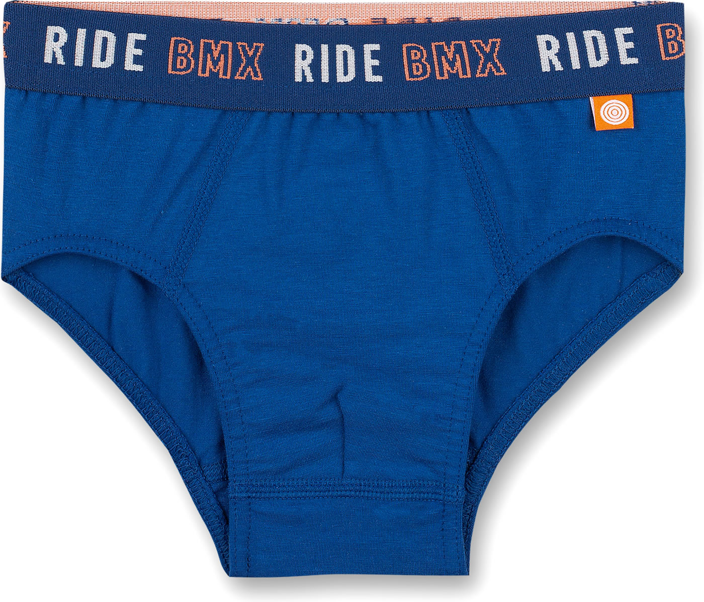 Zwei Slips für Jungen von SANETTA in uni blau und in grün mit BMX Allover-Druck. Dank der elastischen Single-Jersey Qualität passt sie sich jeder Körperform an. Der flexible Webbund mit verschiedenen Wordingprints Bund schneidet nicht ein und bietet einen optimalen Tragekomfort.