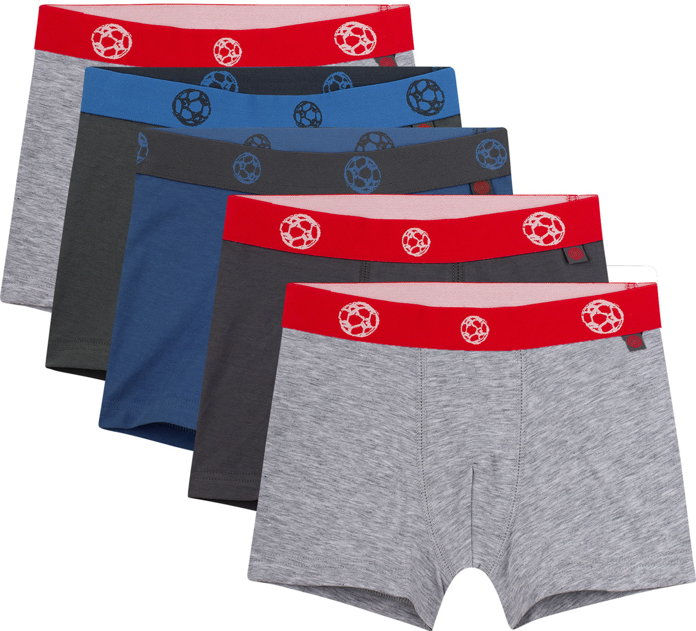 Fünf Boxer-Shorts für Jungen von SANETTA mit Fußball-Motiven im Bündchen. Dank der elastischen Single-Jersey Qualität passt sie sich jeder Körperform an. Der flexible Bund schneidet nicht ein und bietet optimalen Tragekomfort.