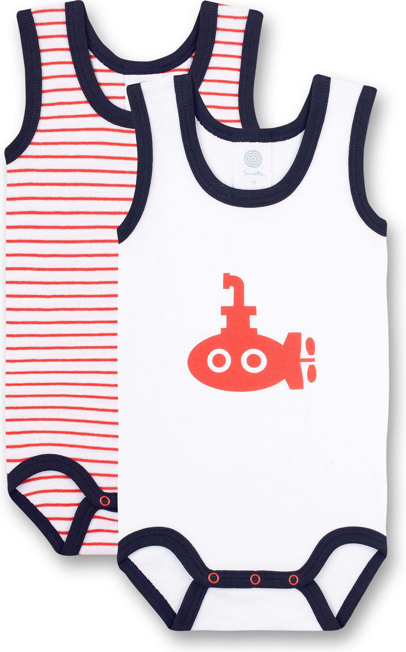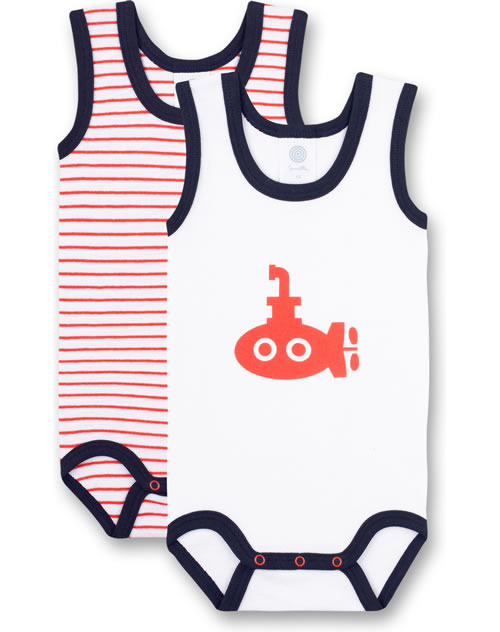 Tolles Set bestehend aus zwei maritimen Kurzarm-Bodys von SANETTA für Mädchen und Jungen. Der eine Body kommt im Ringel-Design, der andere Body hat ein lustiges U-Boot Motiv auf der Brust. Dank nickelfreier Druckknöpfe an der Schulter und im Schritt wird das Umziehen und Wickeln kinderleicht. Die Bodys bestehen aus 100 % Bio-Baumwolle.