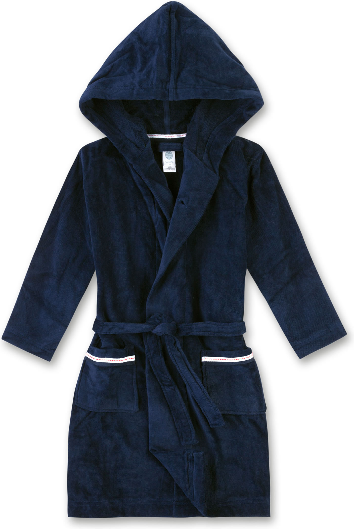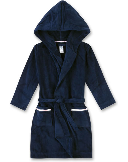 Schöner Bademantel in angenehmer und weicher Velours Frottee-Qualität mit Kapuze von SANETTA für Jungen. Auf der Vorderseite befinden sich zwei große Taschen. Schließen lässt sich der Bademantel in neptun mit einem Gürtel. Ob nach dem ausgiebigen Bad zu Hause oder nach einem Tag am Strand, dieser Bademantel ist ein toller Begleiter für Kinder.