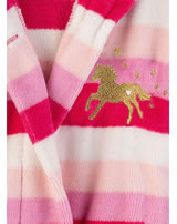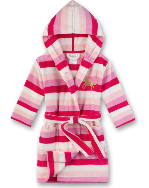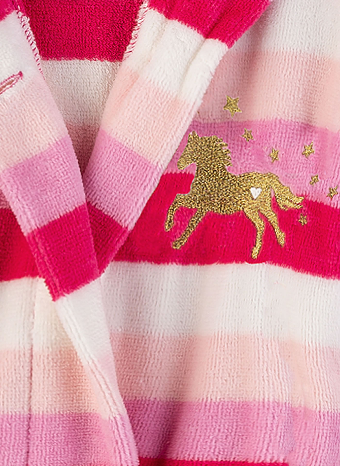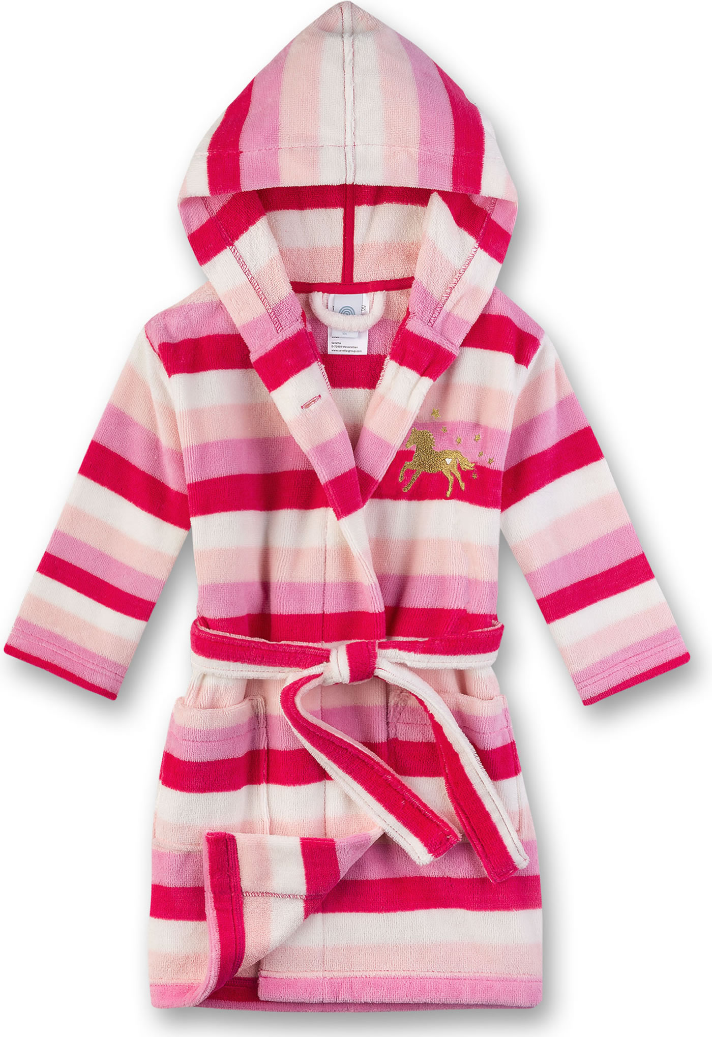 Schöner Bademantel in angenehmer und weicher Velours Frottee-Qualität mit Kapuze von SANETTA für Mädchen. Auf der Vorderseite befinden sich zwei große Taschen. Schließen lässt sich der Bademantel in pretty pink mit einem Gürtel. Ein schönes Detail ist die Pferde-Stickerei an der linken Brust. Ob nach dem ausgiebigen Bad zu Hause oder nach einem Tag am Strand, dieser Bademantel ist ein toller Begleiter für Kinder.