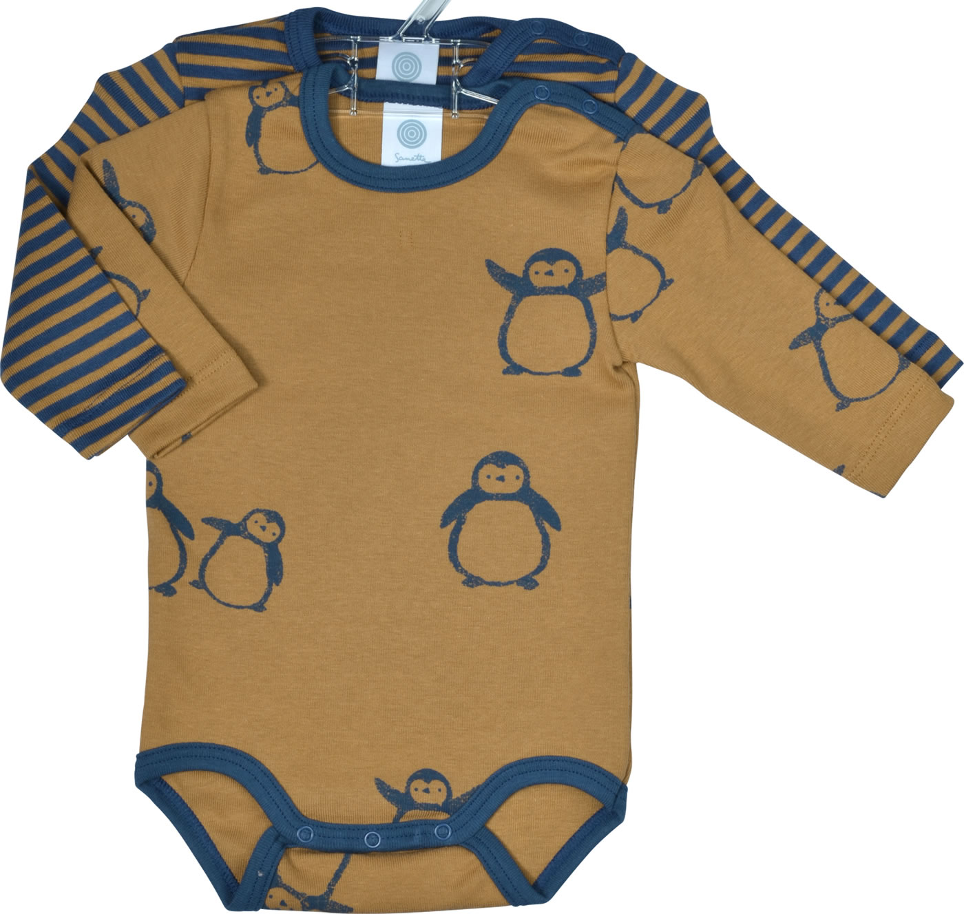 Tolles Set bestehend aus 2 Langarm-Bodys in Jersey-Qualität von SANETTA für Jungen. Der eine Body kommt in braun und blau gestreift, der andere Body hat einen niedlichen Allover-Print mit Pinguinen. Dank nickelfreier Druckknöpfe an der Schulter und im Schritt wird das Umziehen und Wickeln kinderleicht. Die Bodys bestehen aus 100 % Bio-Baumwolle.