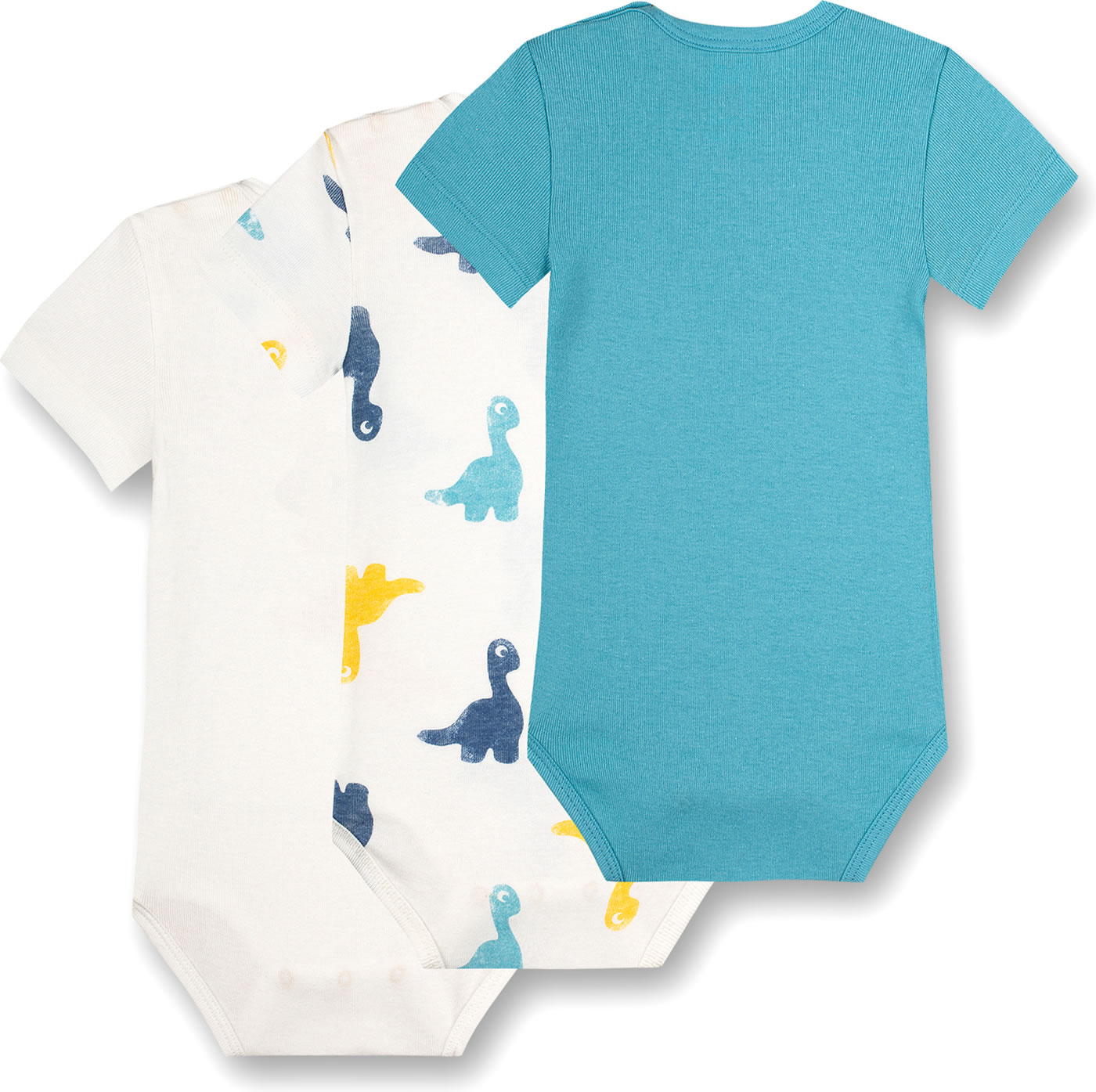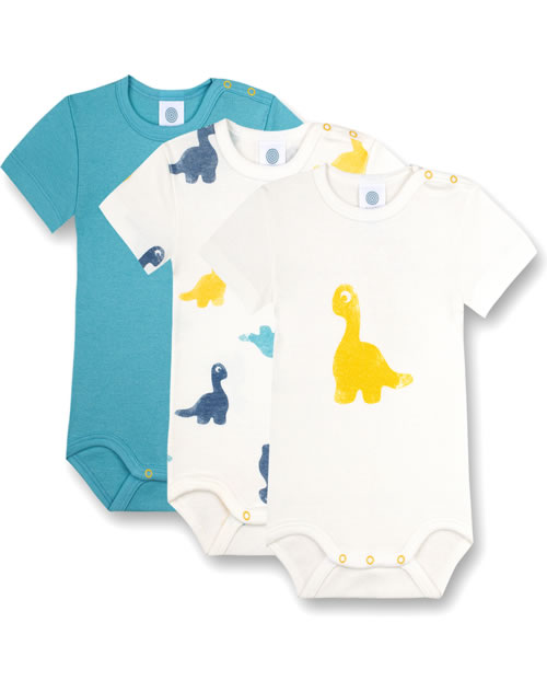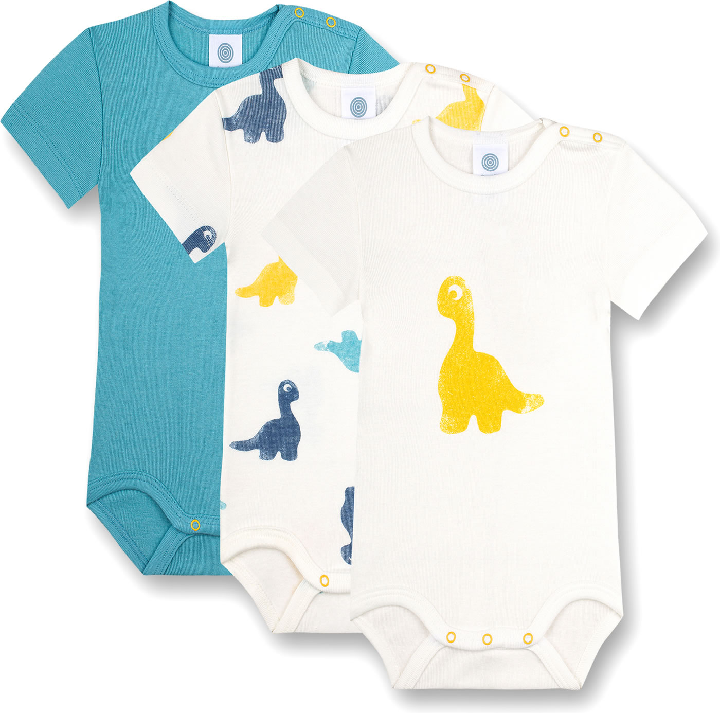 Tolles Set bestehend aus 3 Kurzarm-Bodys von SANETTA für Jungen in weiß und blau. Der eine Body kommt in hellblau, der andere Body in weiß hat einen schönen Allover Dino-Druck. Der dritte Body in weiß hat einen großen Dino auf der Vorderseite. Dank nickelfreier Druckknöpfe an der Schulter und im Schritt wird das Umziehen und Wickeln kinderleicht. Die Bodys bestehen aus 100 % Bio-Baumwolle.