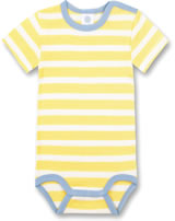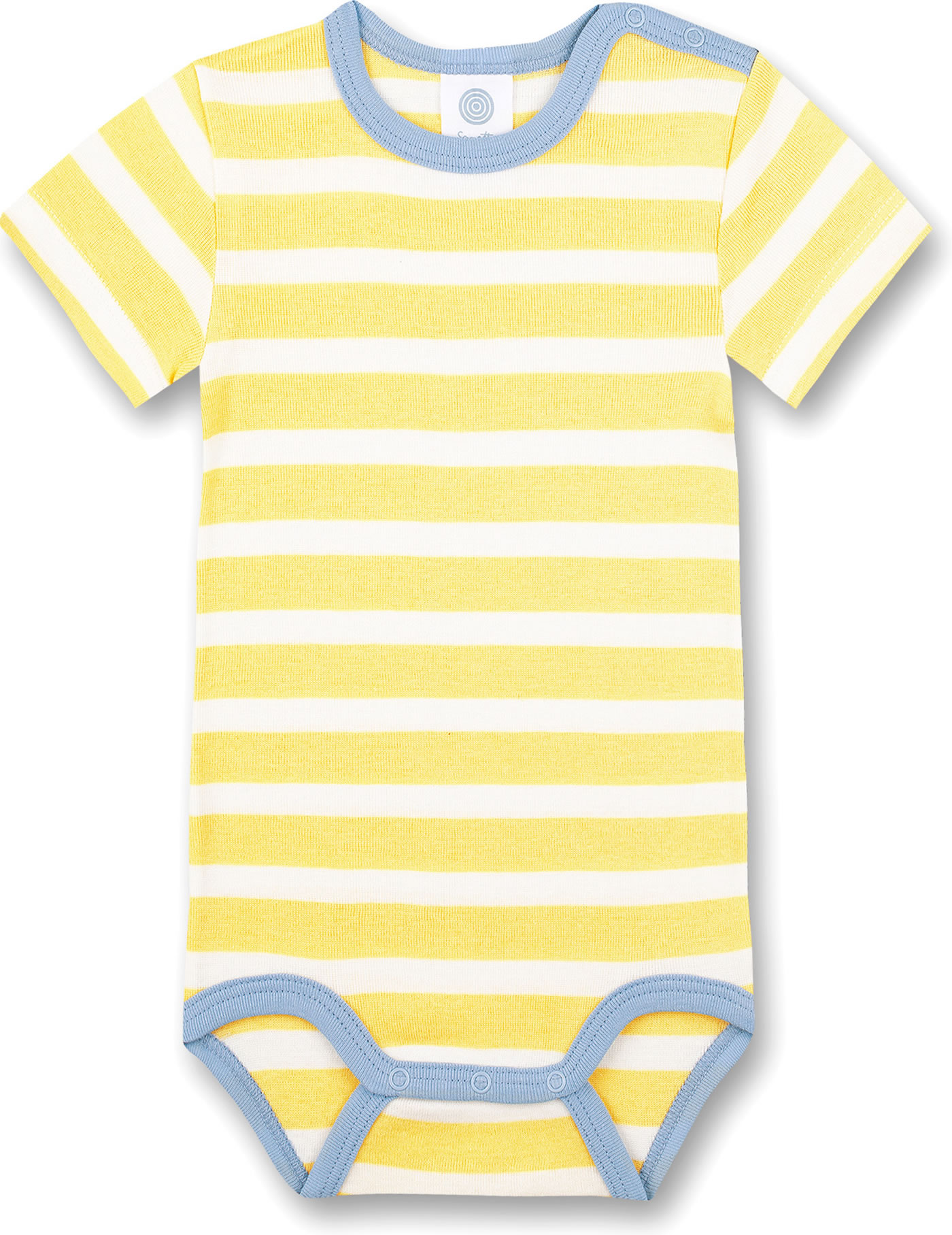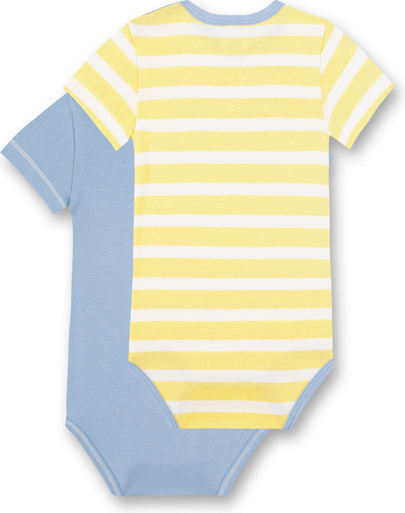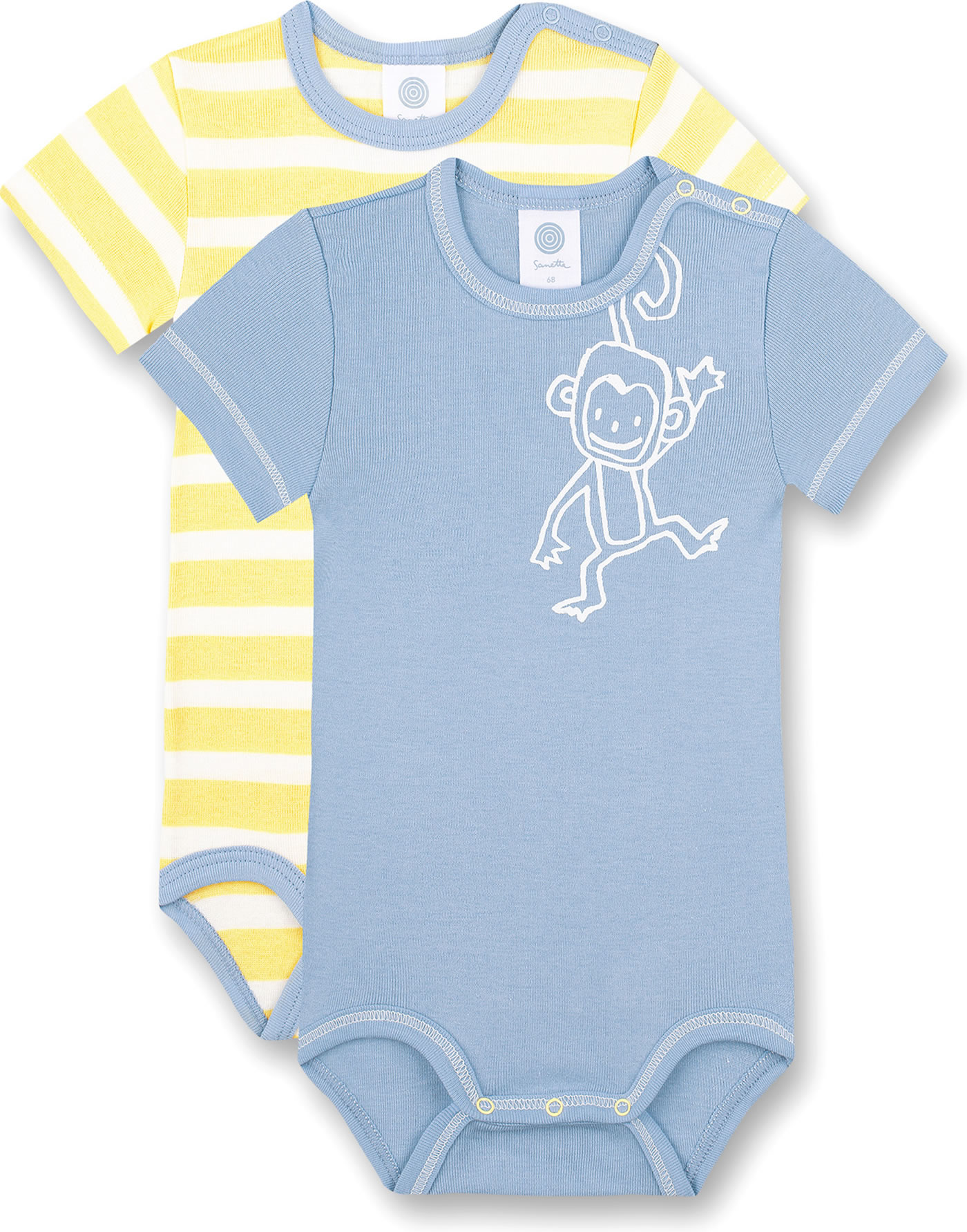Tolles Set bestehend aus zwei sommerlichen Kurzarm-Bodys in Feinripp-Qualität von SANETTA für Mädchen und Jungen. Der eine Body kommt im lustig gestreift in weiß und gelb, der andere Body in blau hat einen tollen Äffchen-Druck auf der Vorderseite. Dank kleiner Druckknöpfe an der Schulter und im Schritt wird das Umziehen und Wickeln kinderleicht. Die Bodys bestehen aus 100 % Bio-Baumwolle.