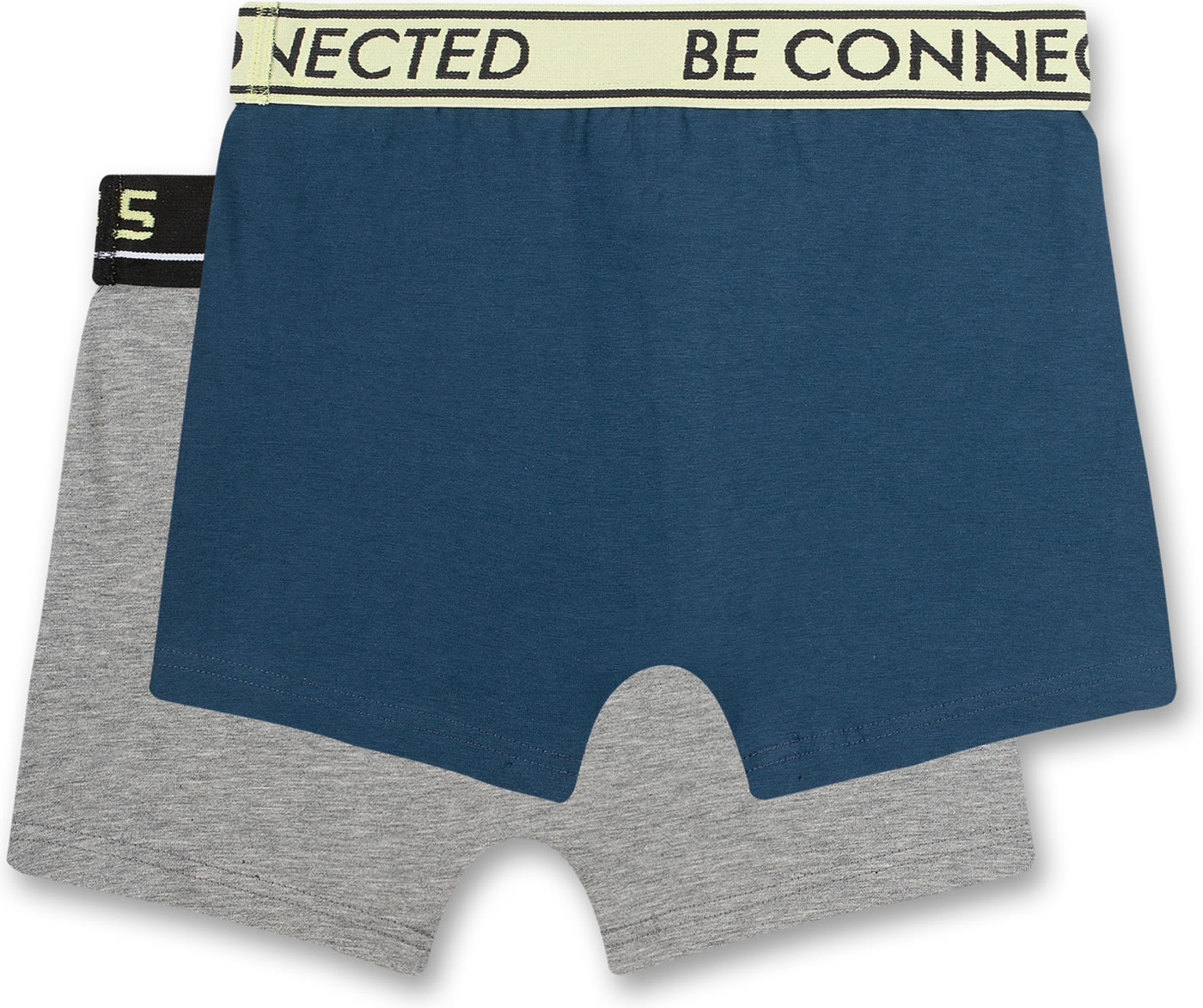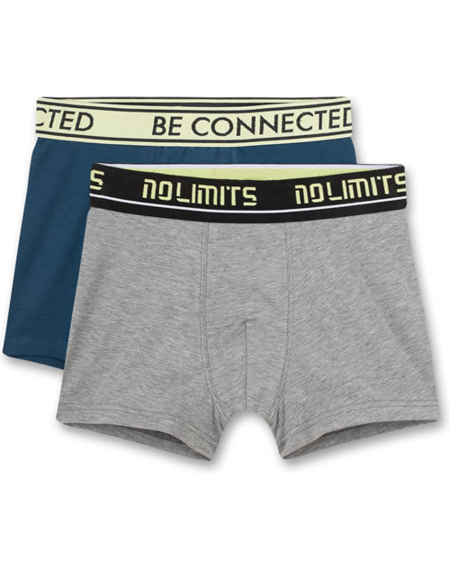 Boxer-Shorts Set für Jungen von SANETTA in blau und grau. Dank der elastischen Single-Jersey Qualität passt sie sich jeder Körperform an. Der flexible Webbund mit verschiedenen Wordingprints BE CONNECTED und NO LIMITS schneidet nicht ein und bietet optimalen Tragekomfort.
