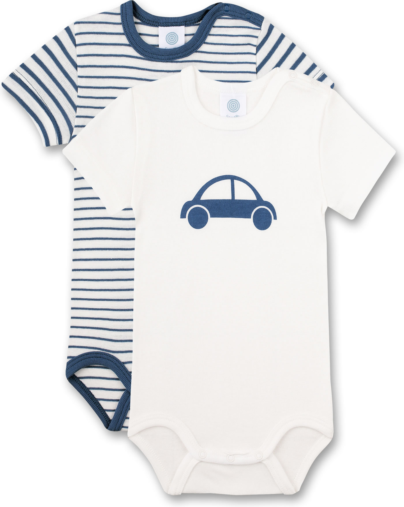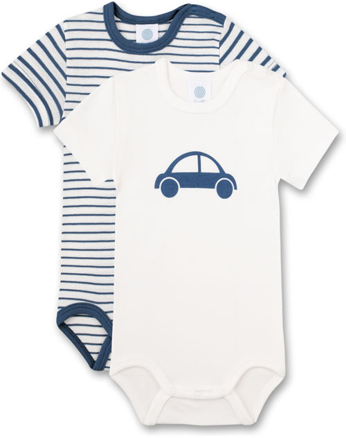 Tolles Set bestehend aus 2 Kurzarm-Bodys von SANETTA für Jungen in weiß und blau. Der eine Body kommt im Ringel-Design, der andere Body hat ein schönes Auto-Motiv auf der Brust. Dank nickelfreier Druckknöpfe an der Schulter und im Schritt wird das Umziehen und Wickeln kinderleicht. Die Bodys bestehen aus 100 % Bio-Baumwolle.