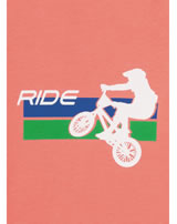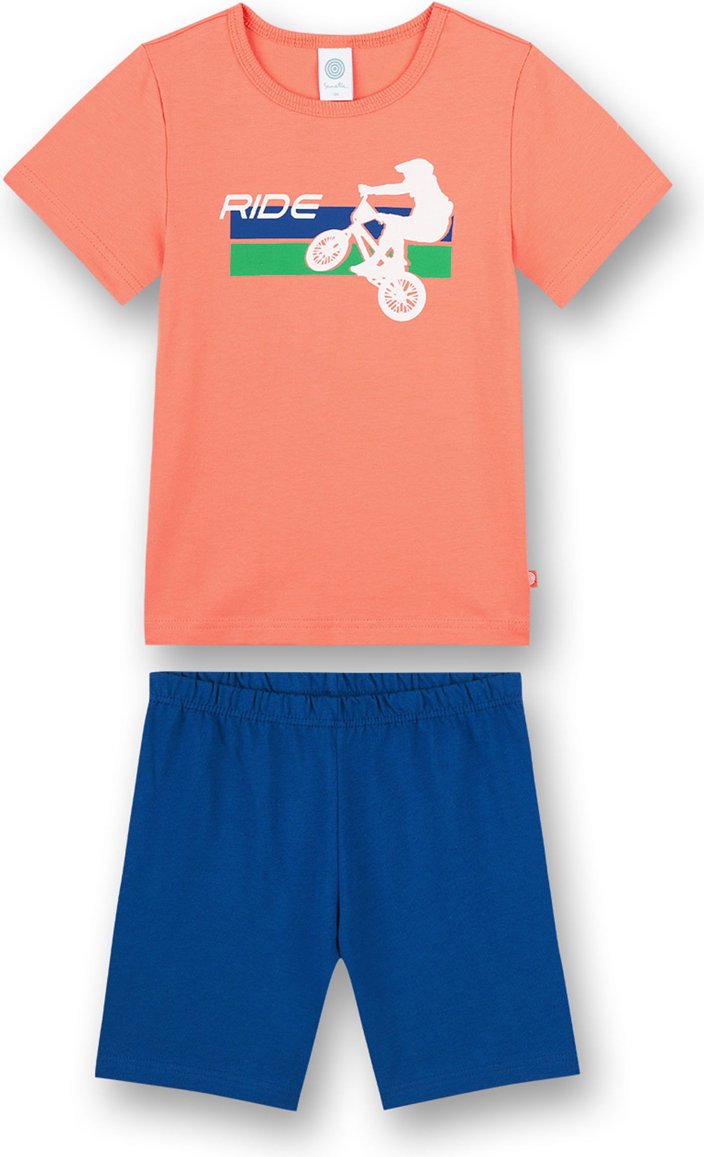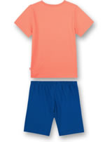 Zweiteiliger Schlafanzug für Jungen mit Kurzarm-Shirt in knalligem orange und Shorts in dunkelblau von SANETTA. Ein cooles Detail ist der BMX-Druck auf der Vorderseite des Shirts. Ein Gummi-Bündchen am Hosenbund sorgt für einen guten Sitz und das leicht elastische Material garantiert einen hohen Tragekomfort.