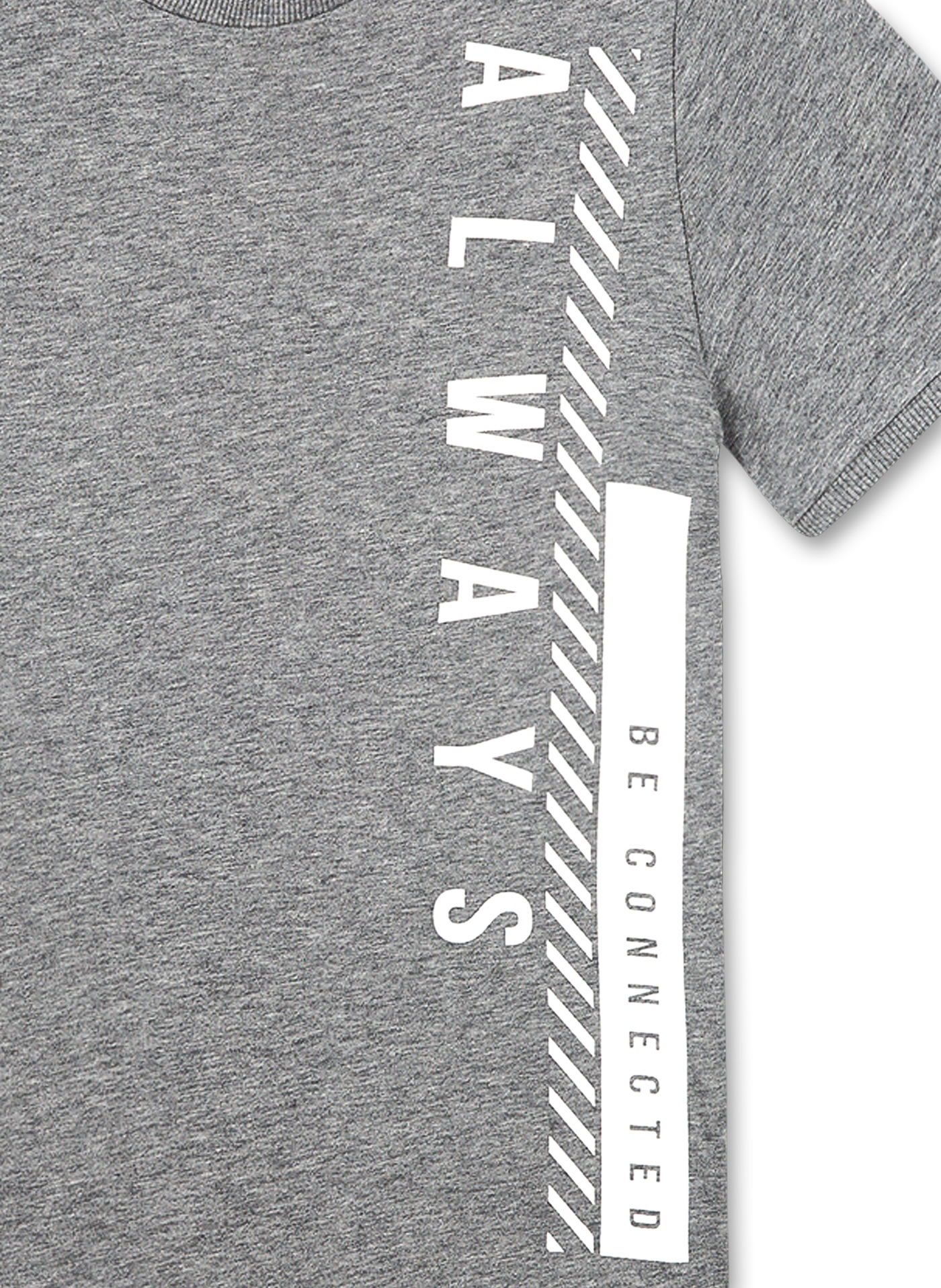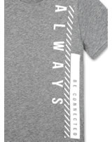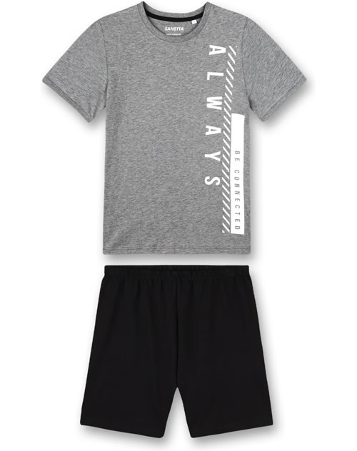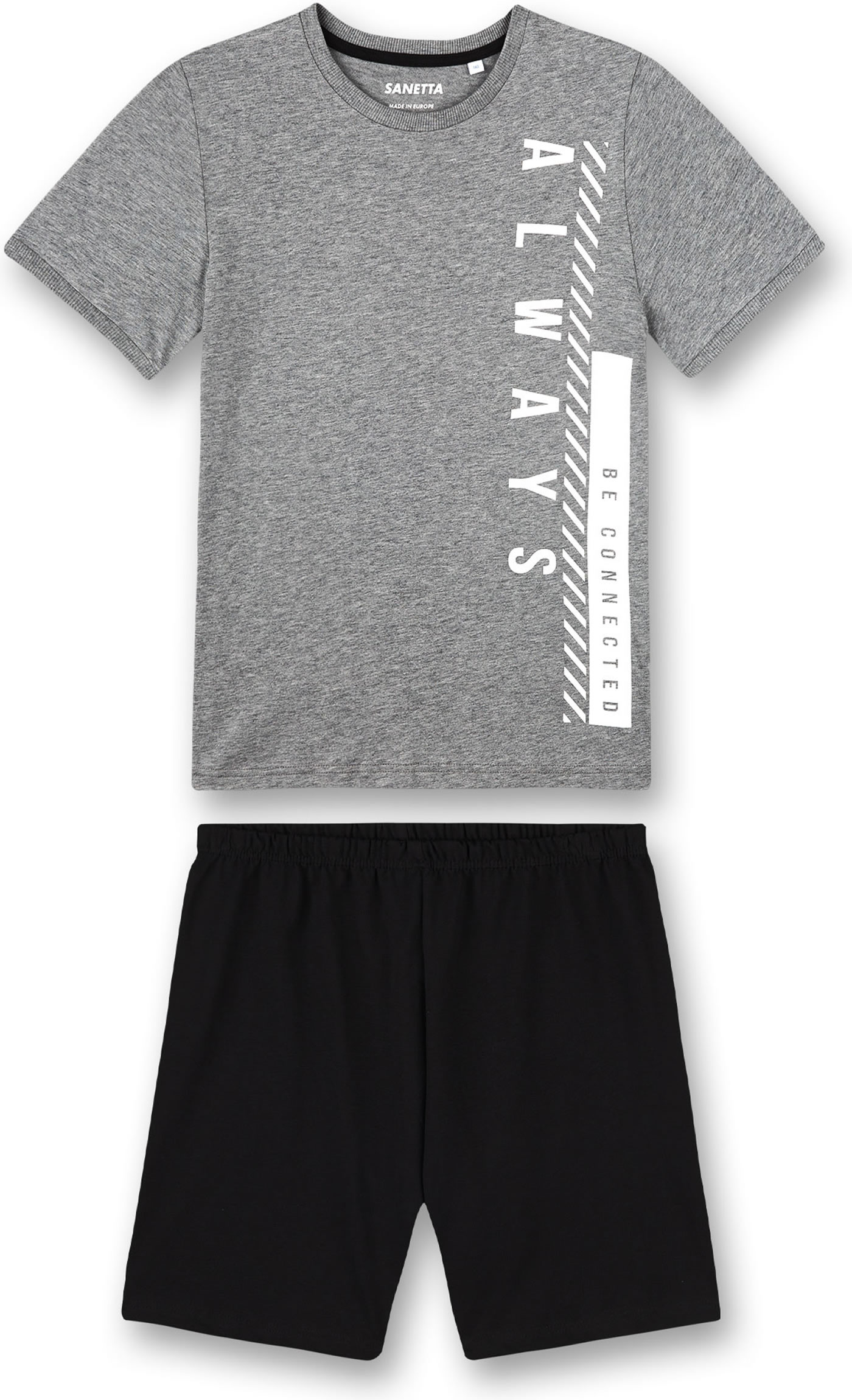 Zweiteiliger Schlafanzug für Jungen mit Kurzarm-Shirt in grau und Shorts in schwarz von SANETTA. Ein cooles Detail ist der Schriftzug in weiß auf der Vorderseite des Shirts. Ein Gummi-Bündchen am Hosenbund sorgt für einen guten Sitz und das leicht elastische Material garantiert einen hohen Tragekomfort.