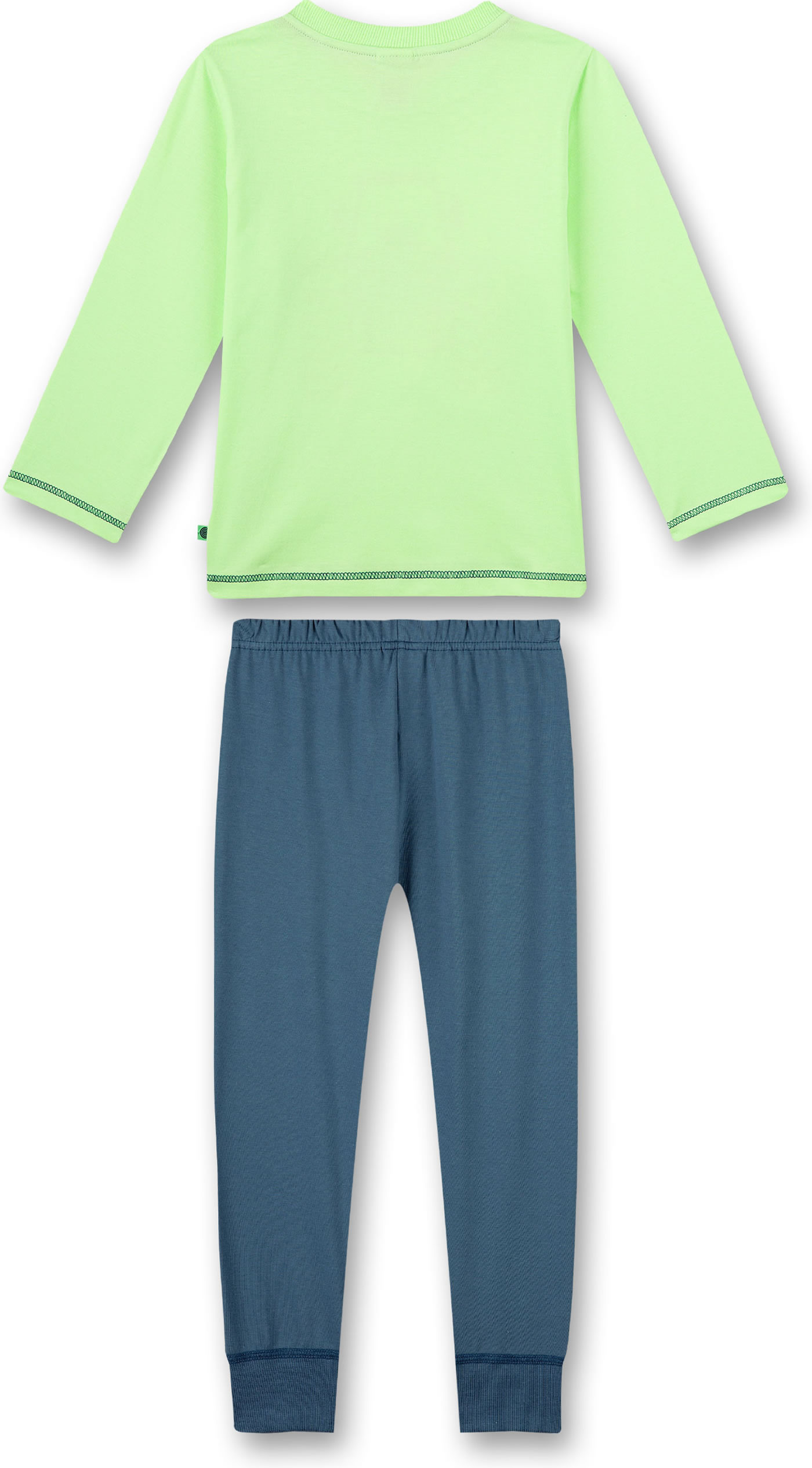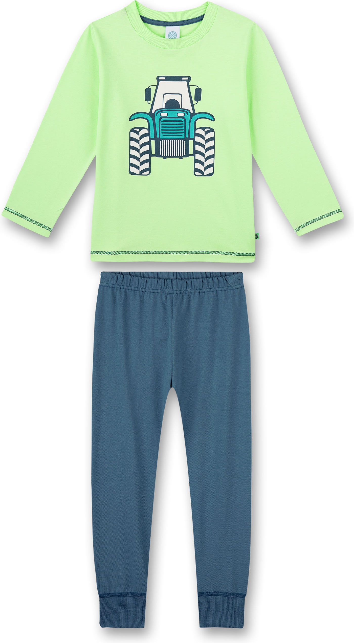 Zweiteiliger Schlafanzug mit grünem Langarm-Shirt und Schlafhose in blau von SANETTA für Jungen. Ein toller Traktor-Aufdruck befindet sich auf der Vorderseite des Shirts. Das weiche Baumwollmaterial sorgt für einen hohen Tragekomfort.