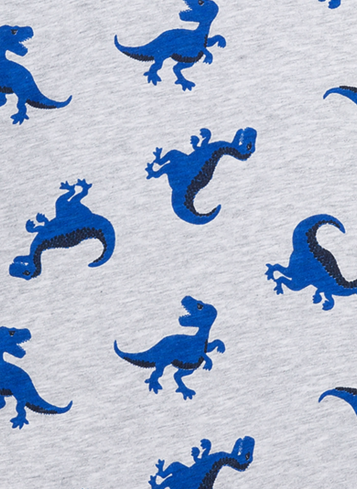 Hübscher zweiteiliger Schlafanzug in grau/blau kombiniert von Sanetta. Highlight sind die farbigen Kontrastnähte und das Allover-Dinosaurier-Motiv auf dem Oberteil. Der angenehm weiche Stoff sorgt für kuschelige Stunden. Das Gummi-Bündchen am Hosenbund garantiert einen guten Sitz und das leicht elastische Material garantiert einen hohen Tragekomfort.