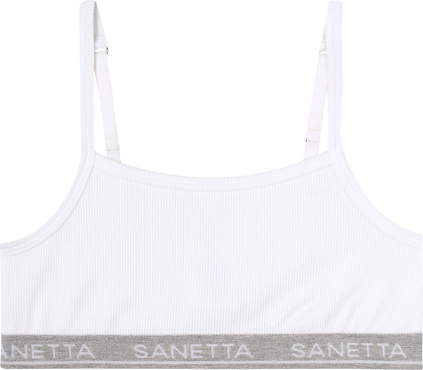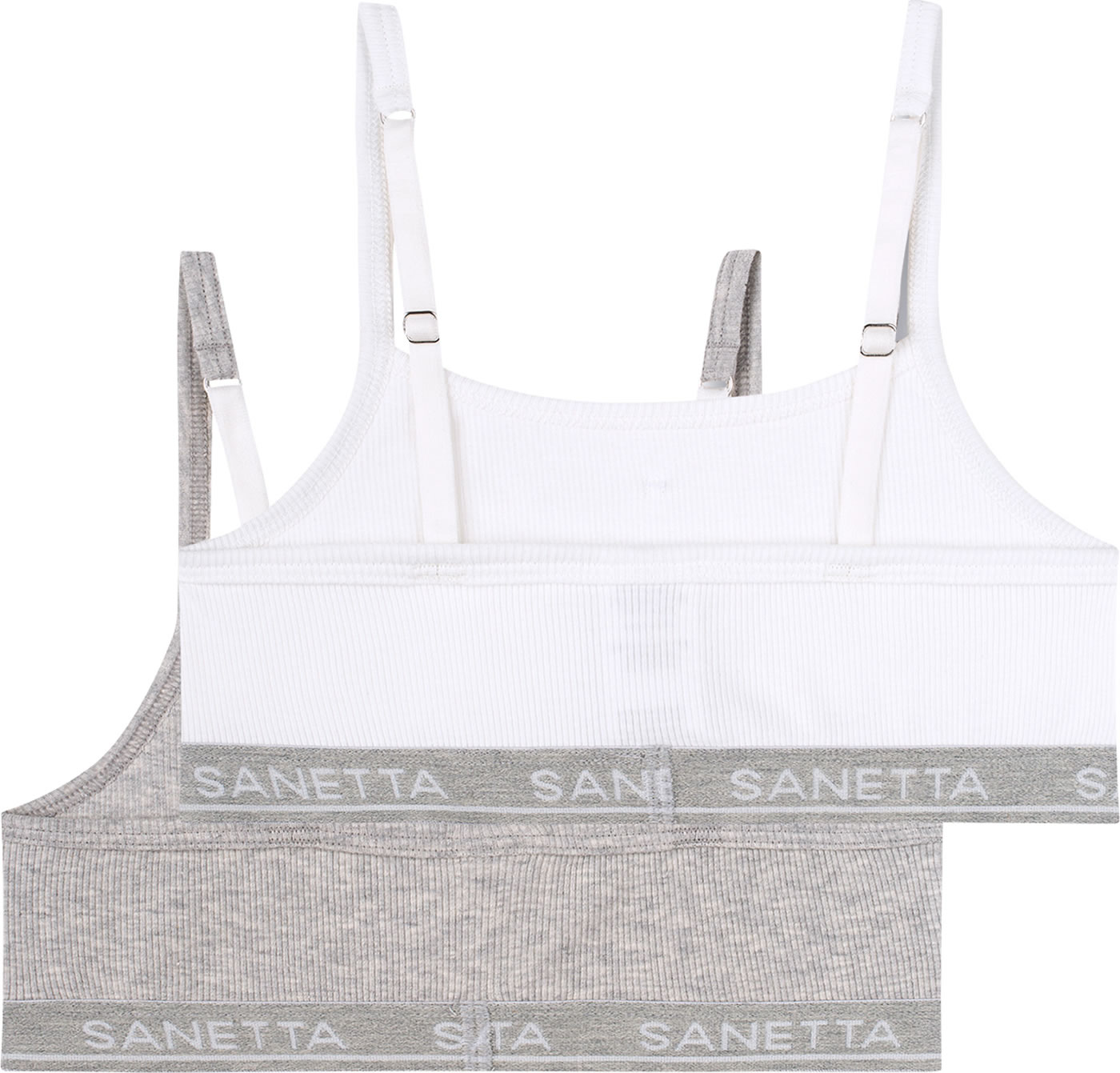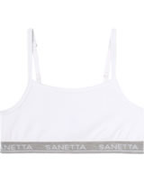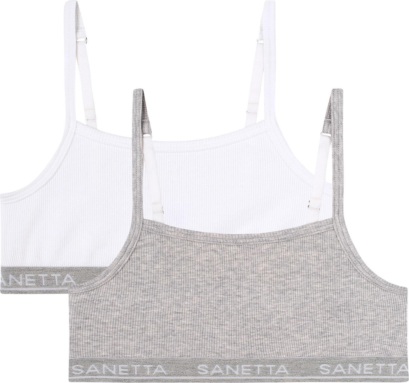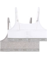 Mädchenhaftes Bustier-Set in weiß und grau von SANETTA. Das elastische Unterbrustband sowie die verstellbaren Träger sorgen für die optimale Passform und die elastische Feinripp-Qualität bietet ein komfortables Tragegefühl.