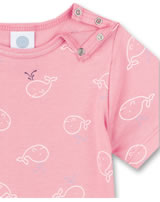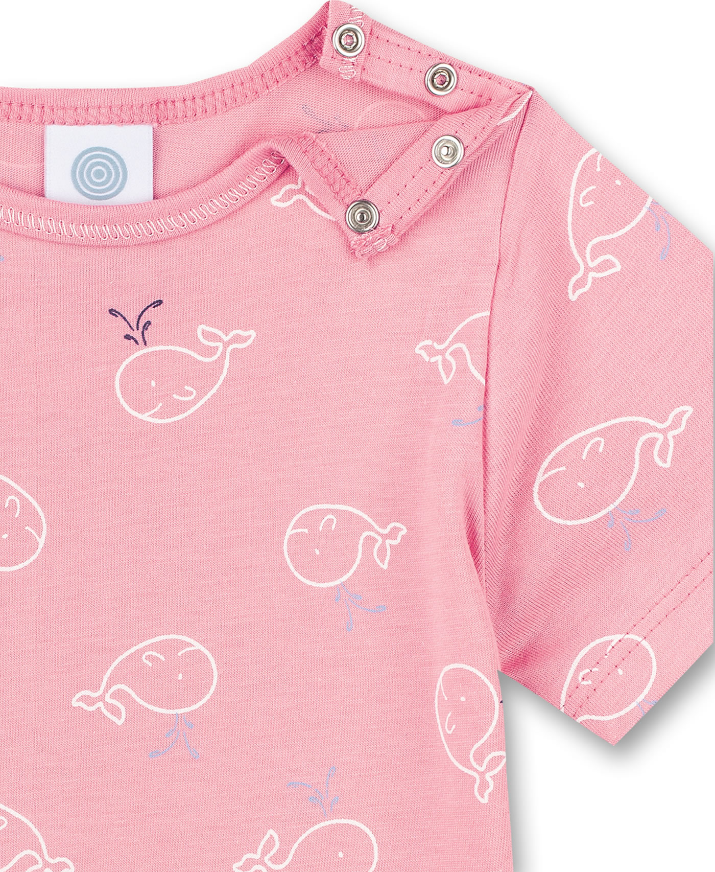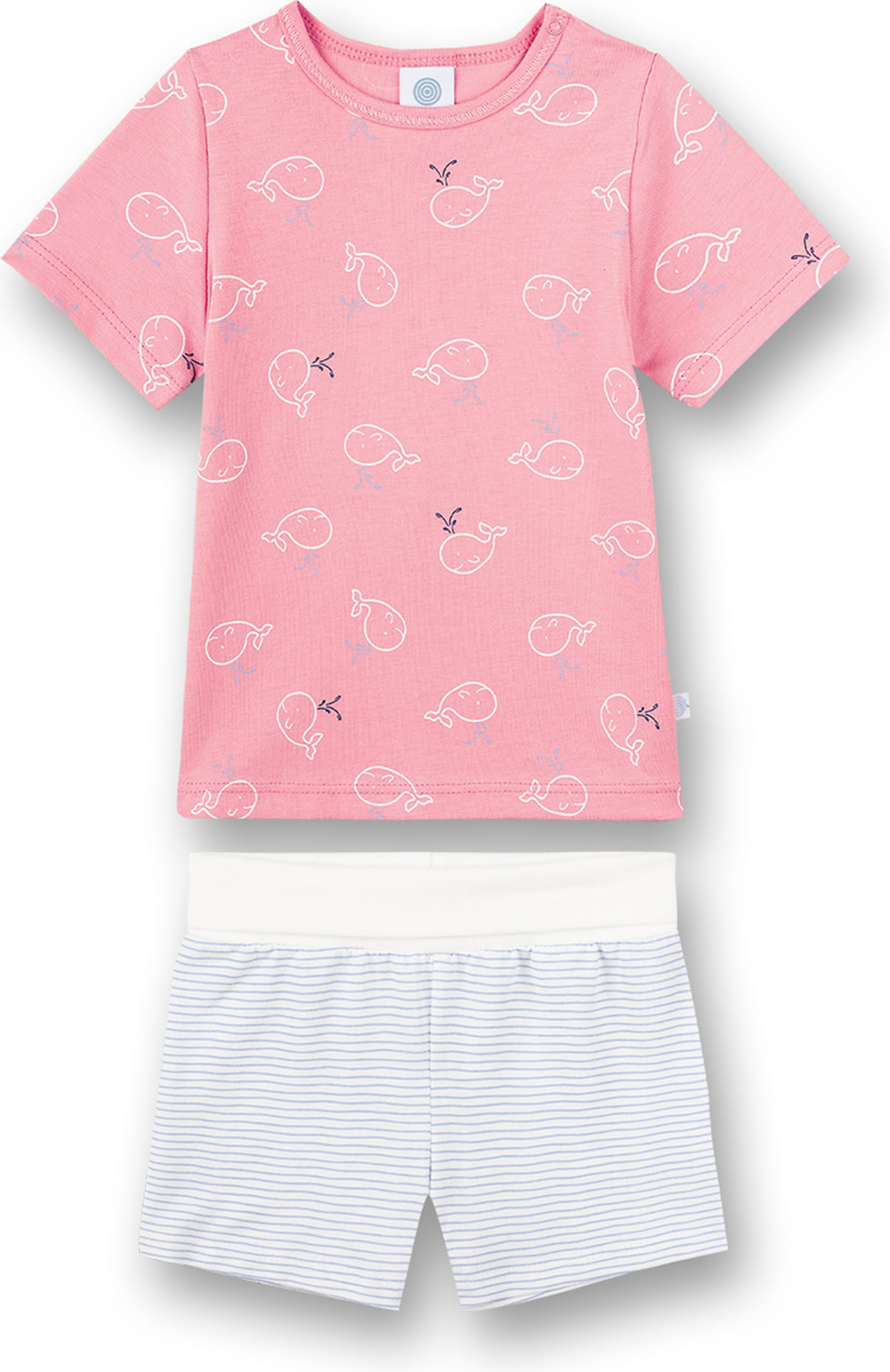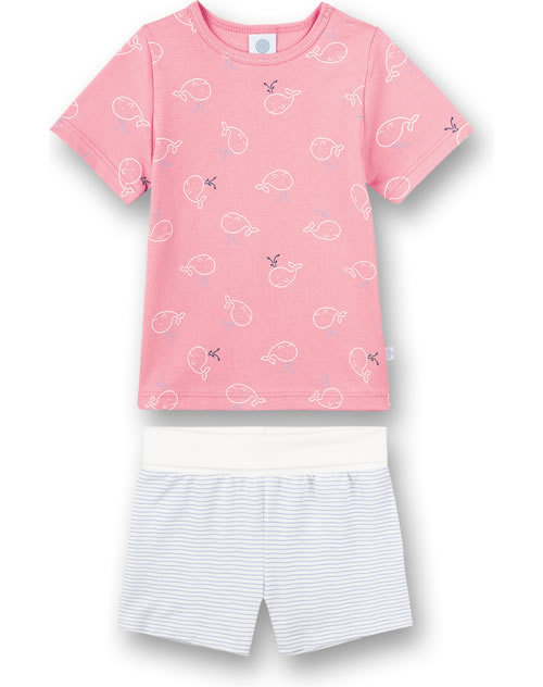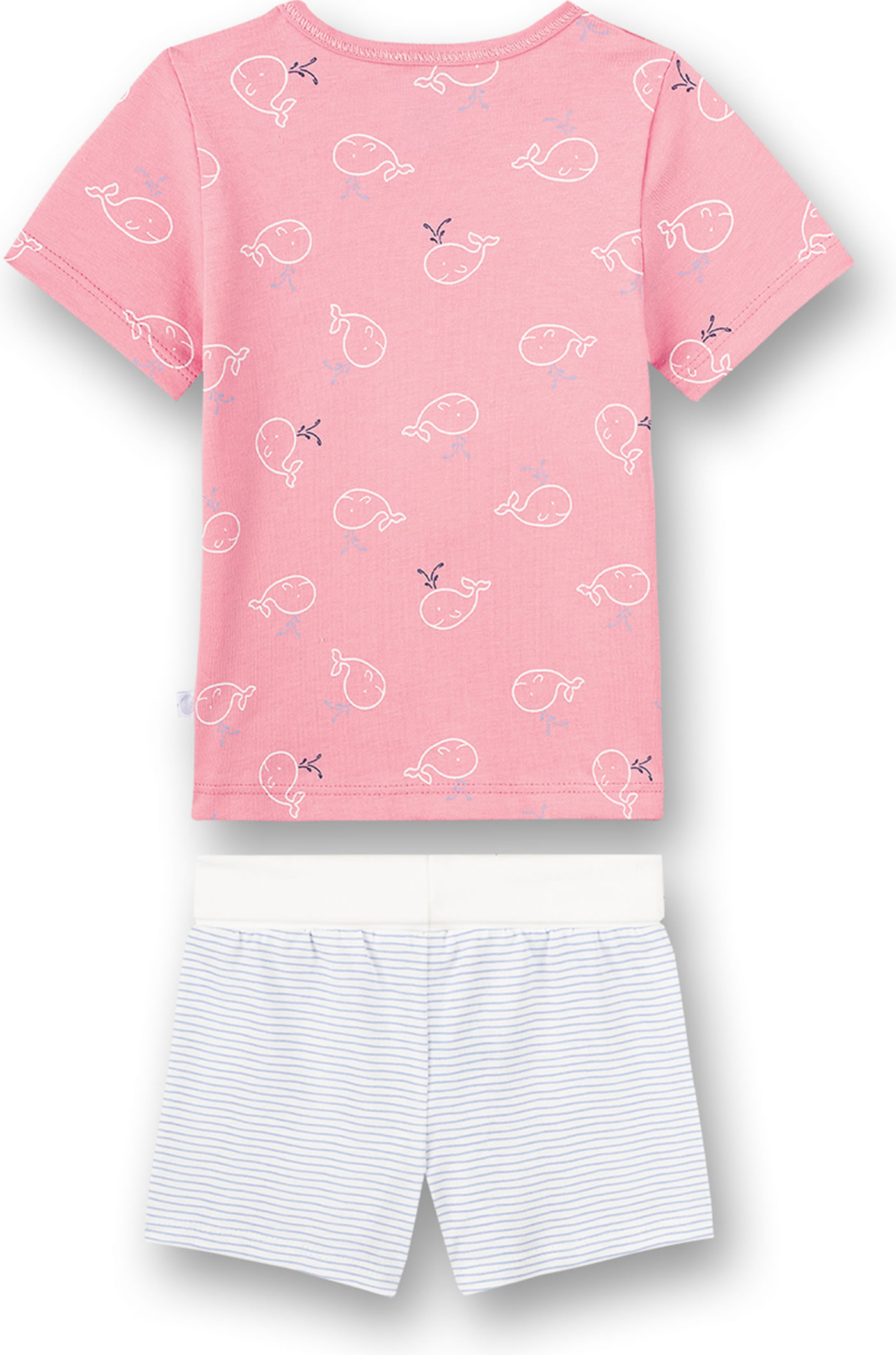 Zweiteiliger Schlafanzug für Mädchen mit Kurzarm-Shirt in rosa und Shorts in blau und weiß gestreift von SANETTA. Ein hübscher Blickfang ist der niedliche Wal Allover-Druck auf dem Shirt. Dieses lässt sich dank zwei Druckknöpfen an der linken Schulter kinderleicht an- und ausziehen. Ein breiter Hosenbund sorgt für einen guten Sitz und das leicht elastische Material garantiert einen hohen Tragekomfort.