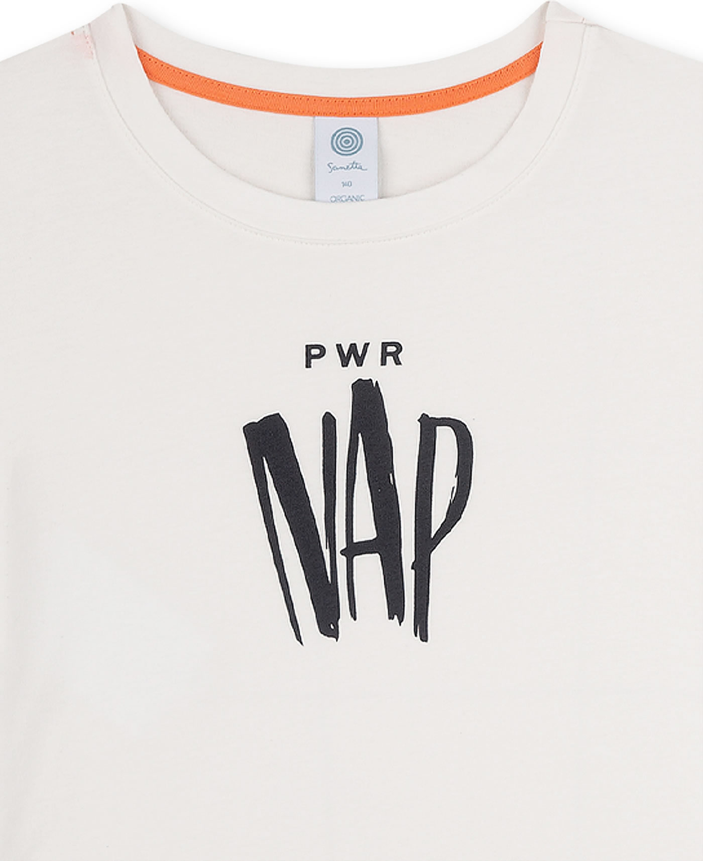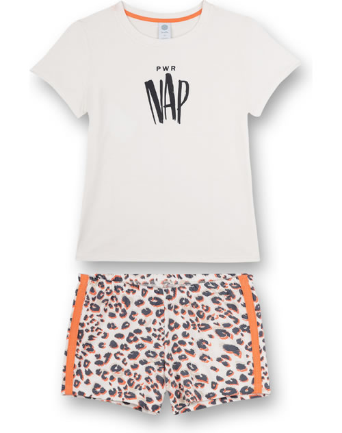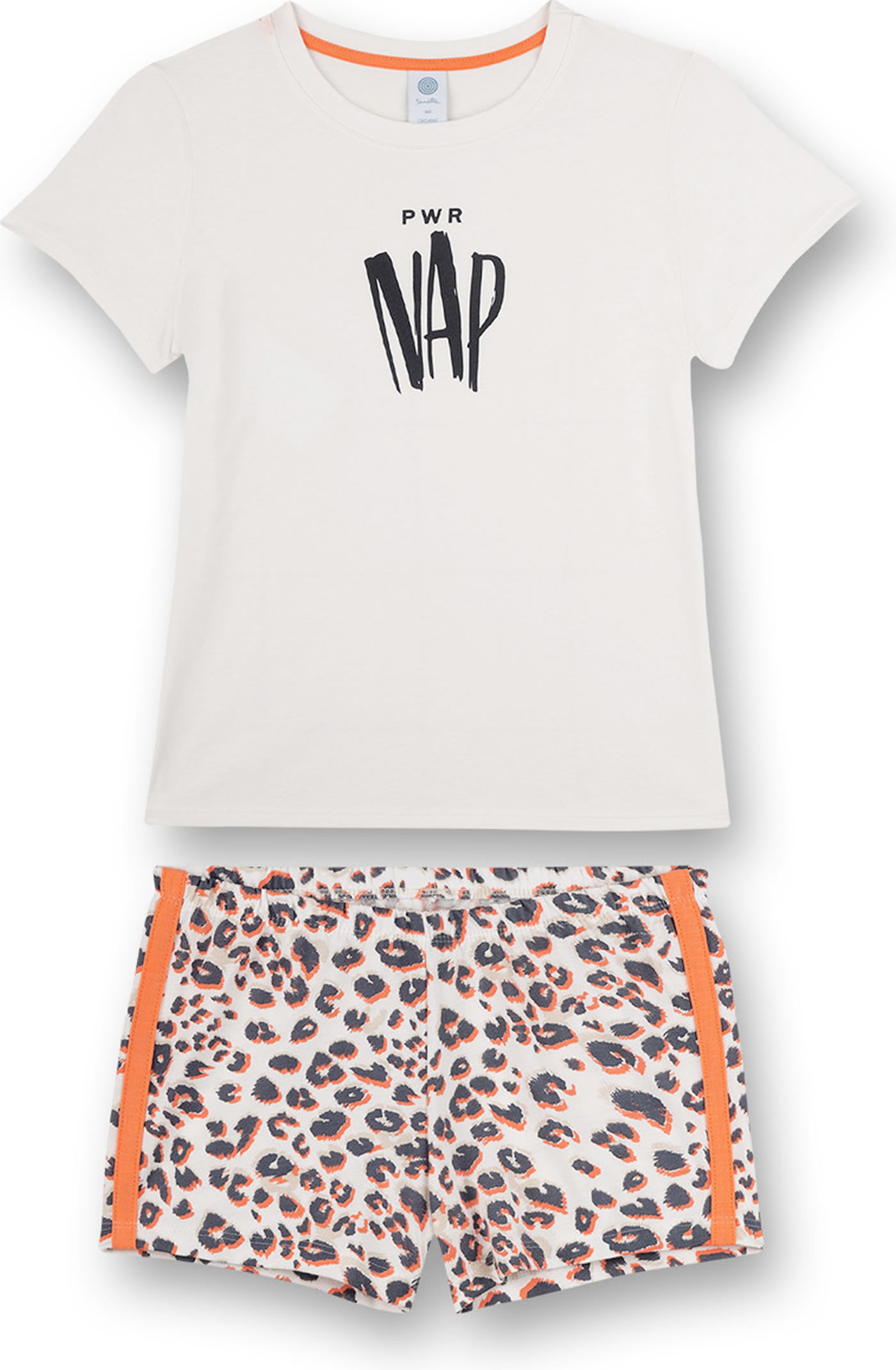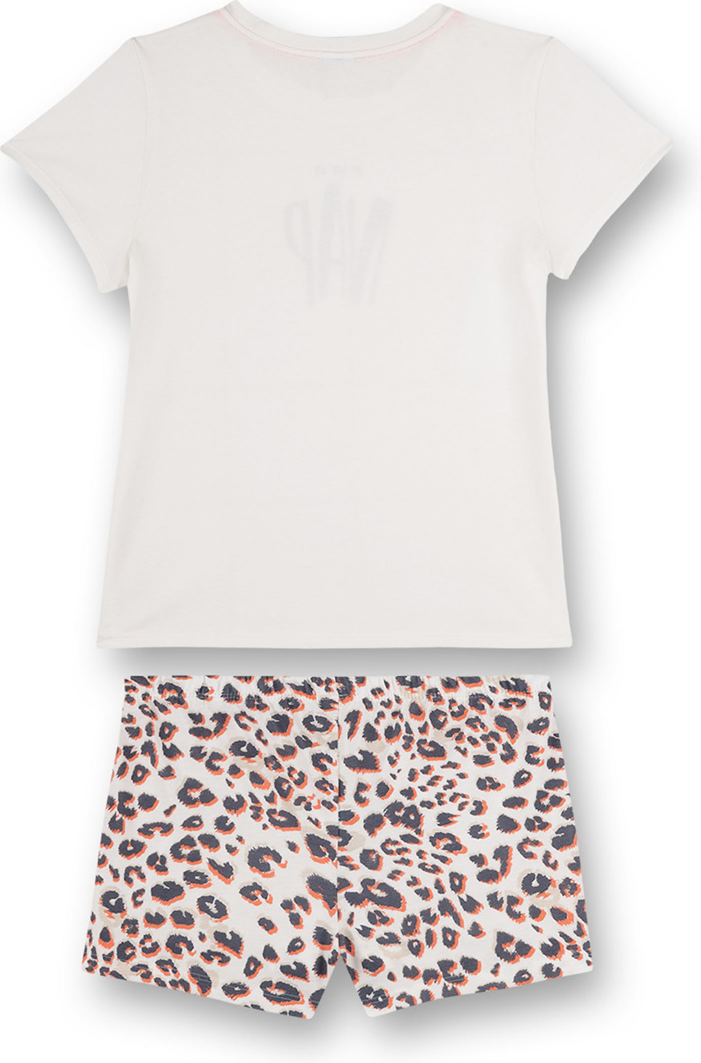 Zweiteiliger Schlafanzug für Mädchen mit Kurzarm-Shirt in weiß und Shorts mit tollem Leo Allover-Druck von SANETTA. Ein hübscher Blickfang ist der tolle NAP-Print auf dem Shirt. Ein elastischer Taillenbund sorgt für einen guten Sitz und das Material in Single Jersey Qualität garantieren einen hohen Tragekomfort.
