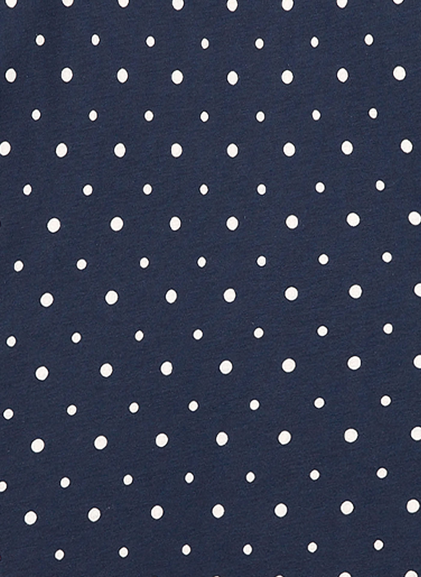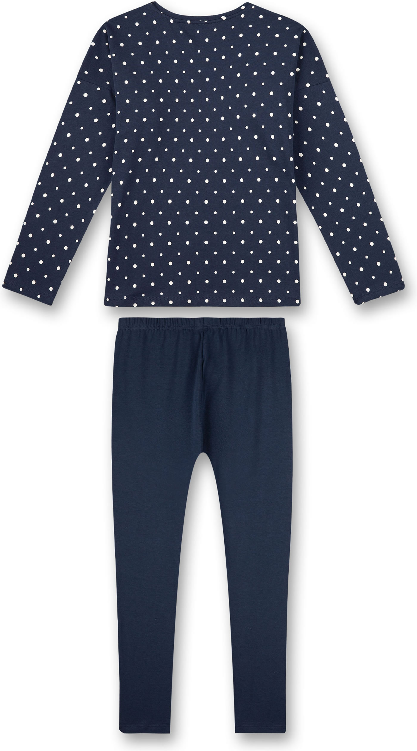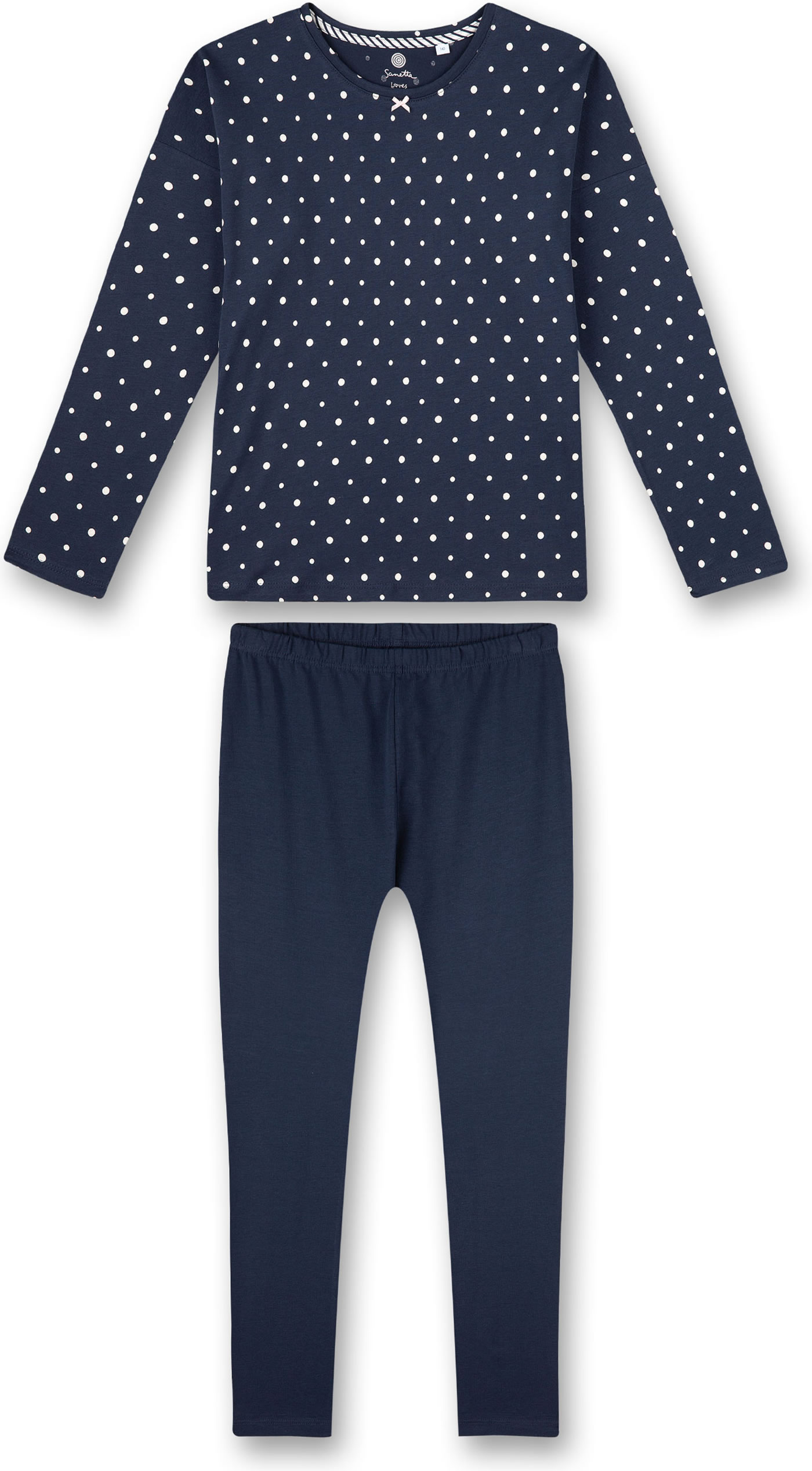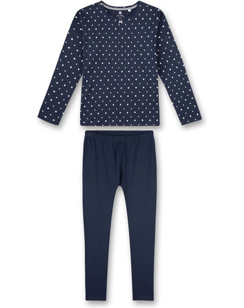 Hübscher, zweiteiliger Schlafanzug in dunkelblau mit Allover-Punkte-Druck in weiß von SANETTA für Mädchen. Ein schönes Detail ist die kleine Schleife in rosa am Halsausschnitt.