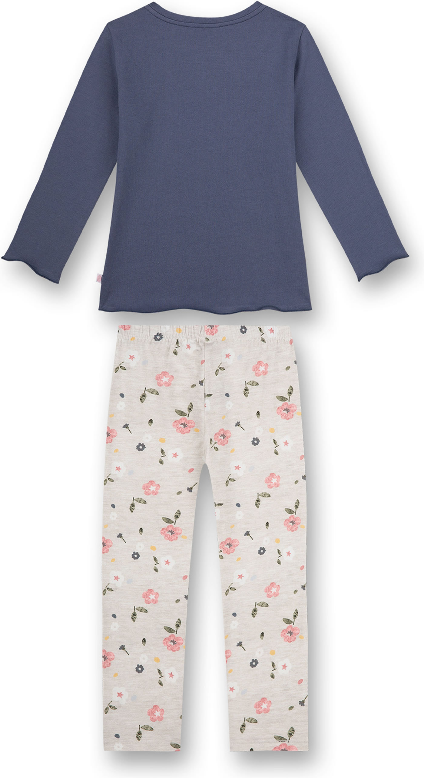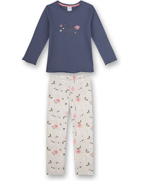 Hübscher, zweiteiliger Schlafanzug mit niedlichem Hunde-Print auf dem blauen Langarm-Shirt und floralem Allover-Druck auf der langen Hose von SANETTA für Mädchen. Das Gummi-Bündchen am Hosenbund garantiert einen guten Sitz und das Material in hervorragender Velours-Single Qualität aus 100 % Baumwolle sorgt für einen hohen Tragekomfort.