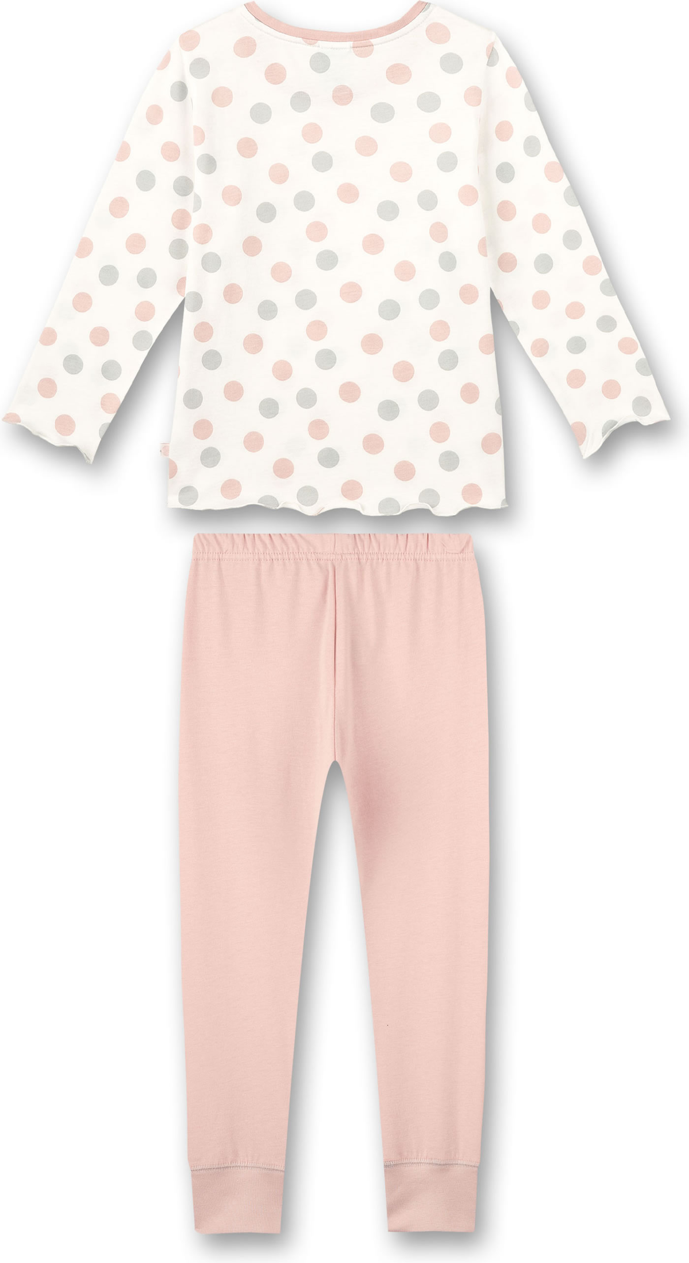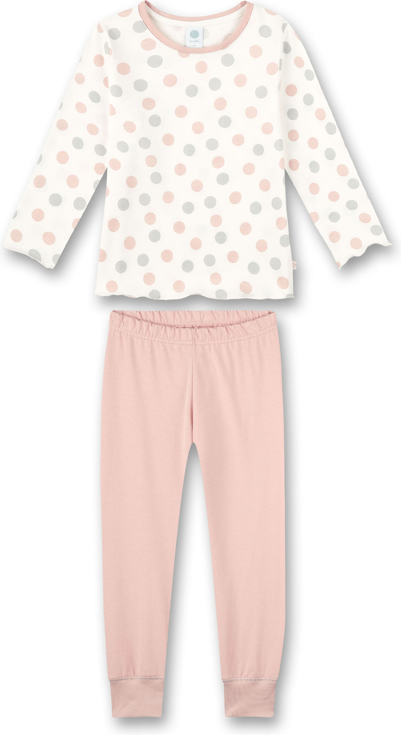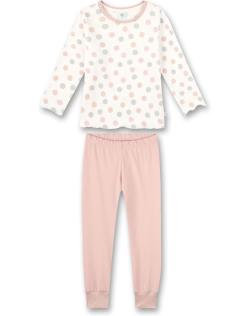 Hübscher, zweiteiliger Schlafanzug in weiß mit Allover-Punkte-Druck in Pastell-Tönen von SANETTA für Mädchen. Die Säume des Shirts sind leicht gewellt.