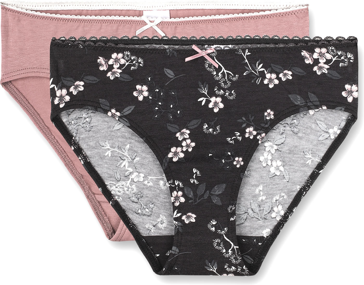 Hübsches Slip Set in Cotton-Modal Qualität für ein angenehmes Hautgefühl von SANETTA für Mädchen. Die hochwertige Single-Qualität und der flexible Taillenbund bieten einen hohen Tragekomfort. Das Set besteht aus einem Slip in rosa mit hübscher Zierschleife und Picotkante in weiß und einem Slip mit romantischen Blumenmuster in schwarz und rosa, der ebenfalls von einer Schleife und Picotkante geziert wird.
