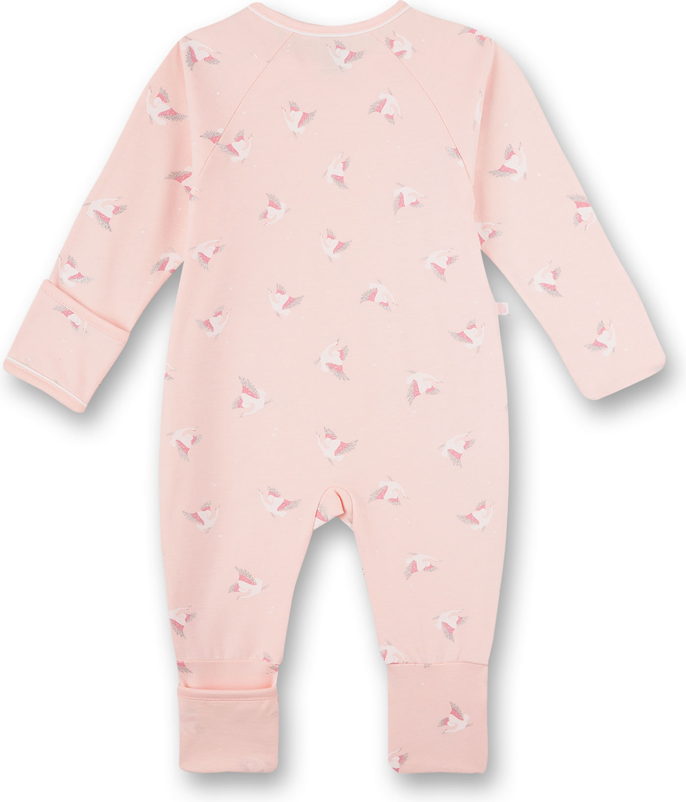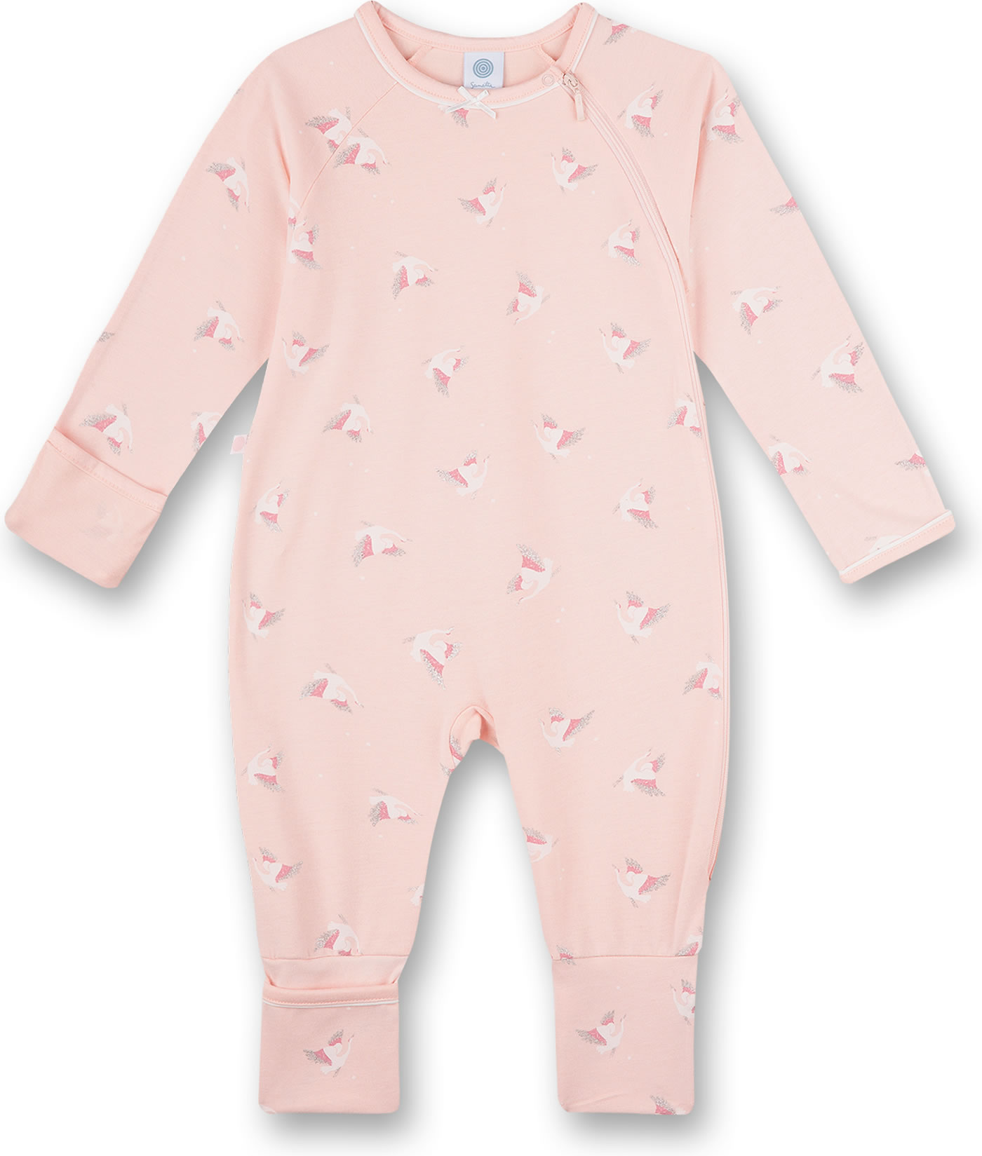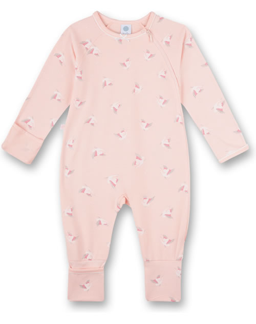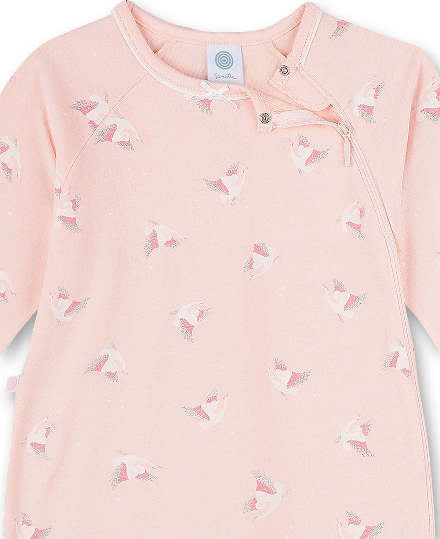 Bezaubernder Strampler mit langen Armen und Füßen in rosa und hübschem Kranich Allover-Print von SANETTA für Mädchen. Ein extralanger Reißverschluss von der Brust bis zum linken Beinende erleichtert das Anziehen und Wickeln. Eine kleine Schleife in rosa ziert den Halsausschnitt. Die Beinenden lassen sich zu Füße umstülpen, die Ärmelenden sind ebenfalls umzustülpen und bieten so einen Kratzschutz für das Baby. Das weiche Material sorgt für einen hohen Tragekomfort.