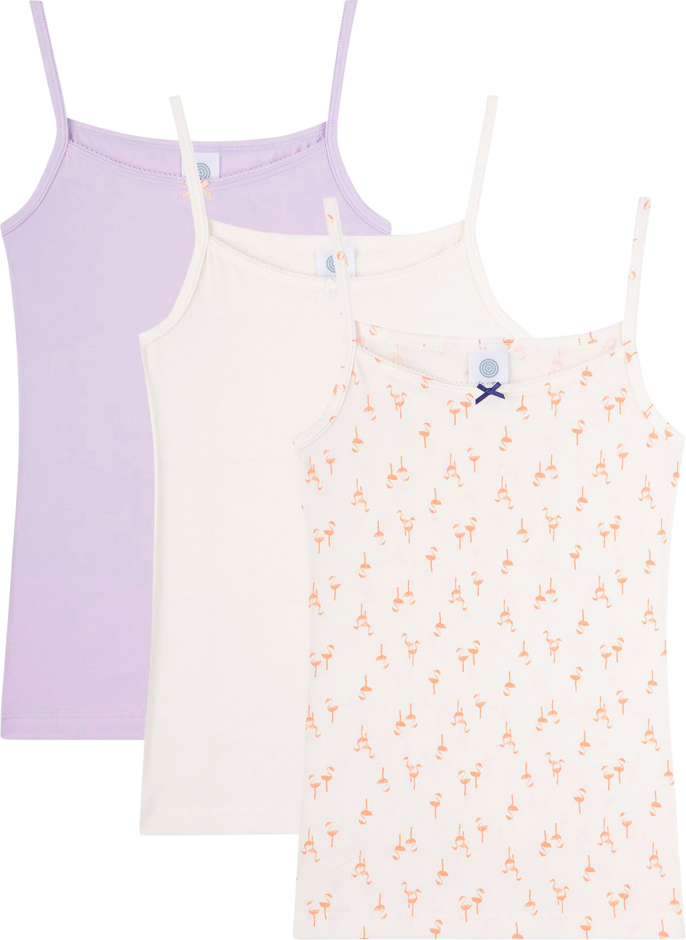 Schönes Unterhemden-Set in Single-Jersey Qualität von SANETTA für Mädchen. Das Set besteht aus einem Unterhemd in lila, einem in weiß und einem Unterhemd in weiß mit schönem Flamingo-Allover-Print in orange. Besonders schöne Details sind die zarten Spitzenränder und die kleinen Schleifen am Ausschnitt. Das weiche Material aus Baumwolle und Elasthan sorgt für einen hohen Tragekomfort.