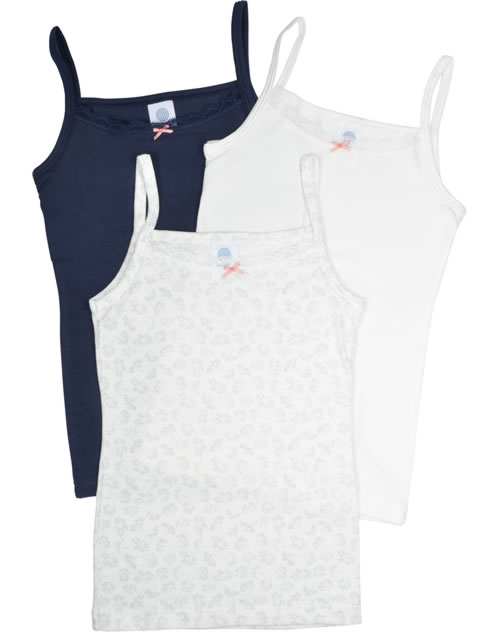 Schönes Unterhemden-Set in Single-Jersey Qualität von SANETTA für Mädchen. Das eine Unterhemd in creme hat ein hübsches Blumen-Muster, die anderen sind uni weiß und dunkelblau. Besonders schön ist die zarte Spitze mit kleiner Schleife. Das weiche Material aus Baumwolle und Elasthan sorgt für einen hohen Tragekomfort.