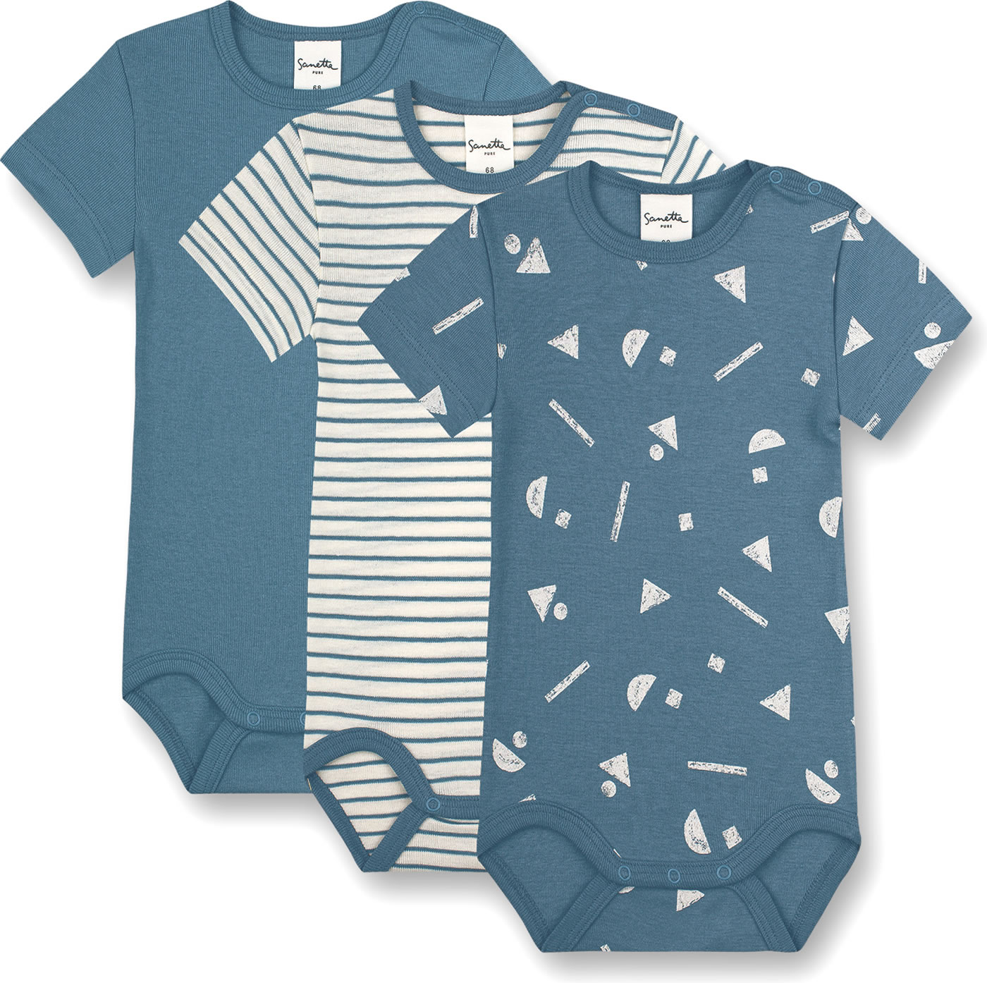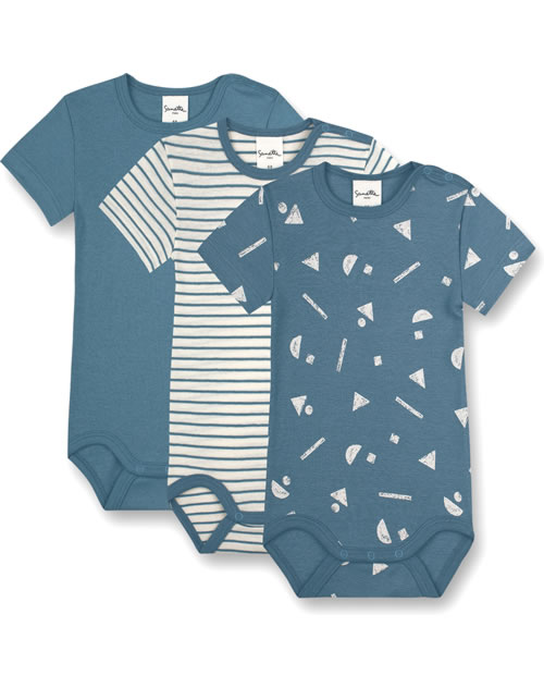 Tolles Body-Set für Jungen mit kurzen Armen und in tollen Muster- und Farbkombinationen von SANETTA PURE. Alle drei Bodys sind in blau gehalten: uni, weiß-blau geringelt und in blau mit grafischem Allover-Print in weiß.