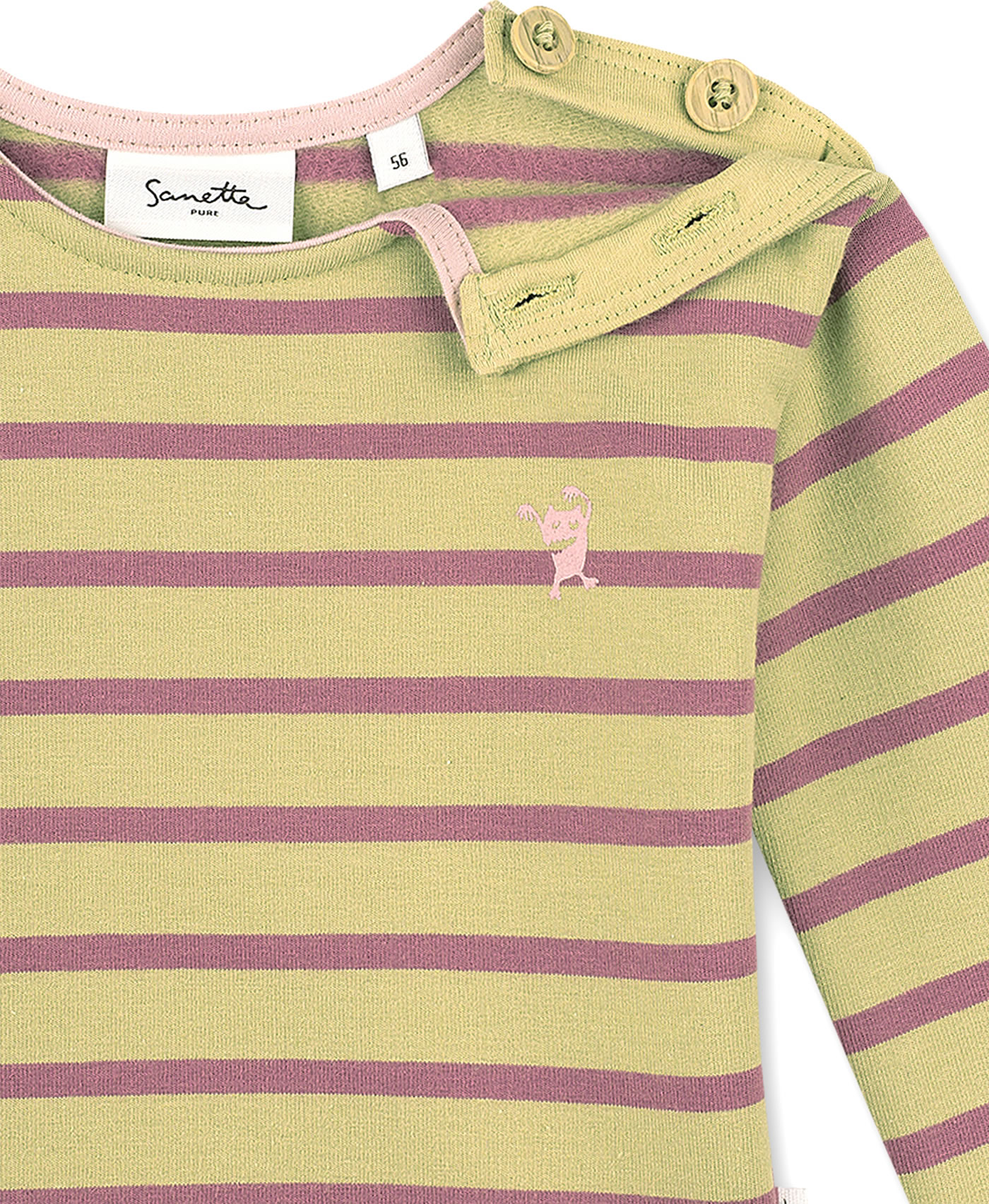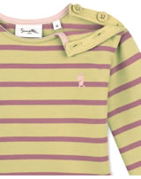 Geringeltes Mädchen-Sweatshirt in einer herbstlichen Farbkombination von SANETTA PURE. Der praktische und zugleich schöne Knopf-Verschluss an der Schulter erleichtert das Umziehen. Überschnittene Ärmel und ein lockerer Schnitt runden das Design ab. Ein kleiner Monster-Druck auf der Brust ist ein witziges Detail.