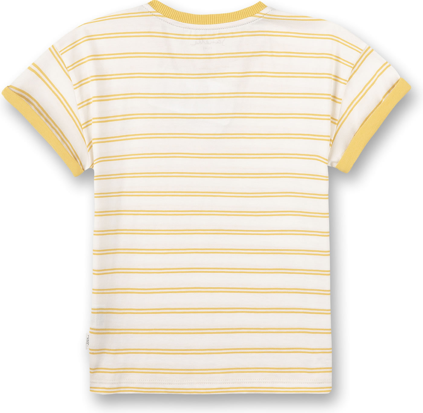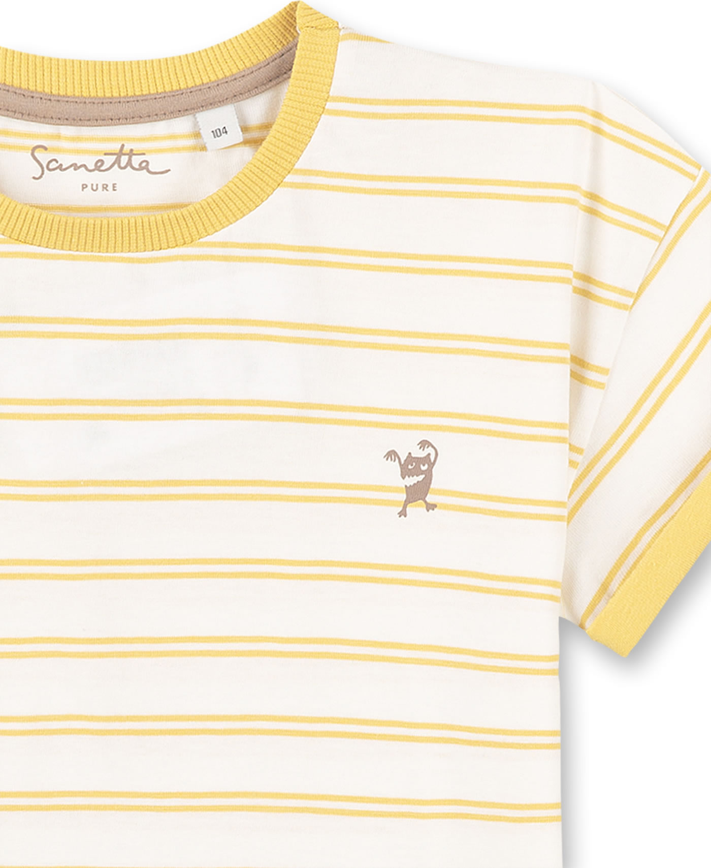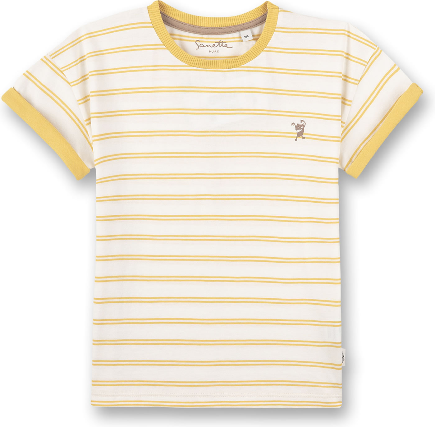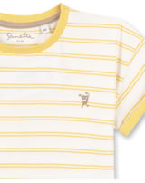 Schönes Kurzarm-Shirt in gelb und weiß gestreift mit kleinem Monster-Print auf der linken Brust von SANETTA PURE für Jungen und Mädchen. Das gemütliche T-Shirt aus 100 % Bio-Baumwolle ist ein tolles Kleidungsstück für die warmen Tage des Jahres, das sich prima kombinieren lässt. Schöne Details sind die umgeschlagenen Ärmel und das Rippbündchen am Halsausschnitt in einer Kontrastfarbe.