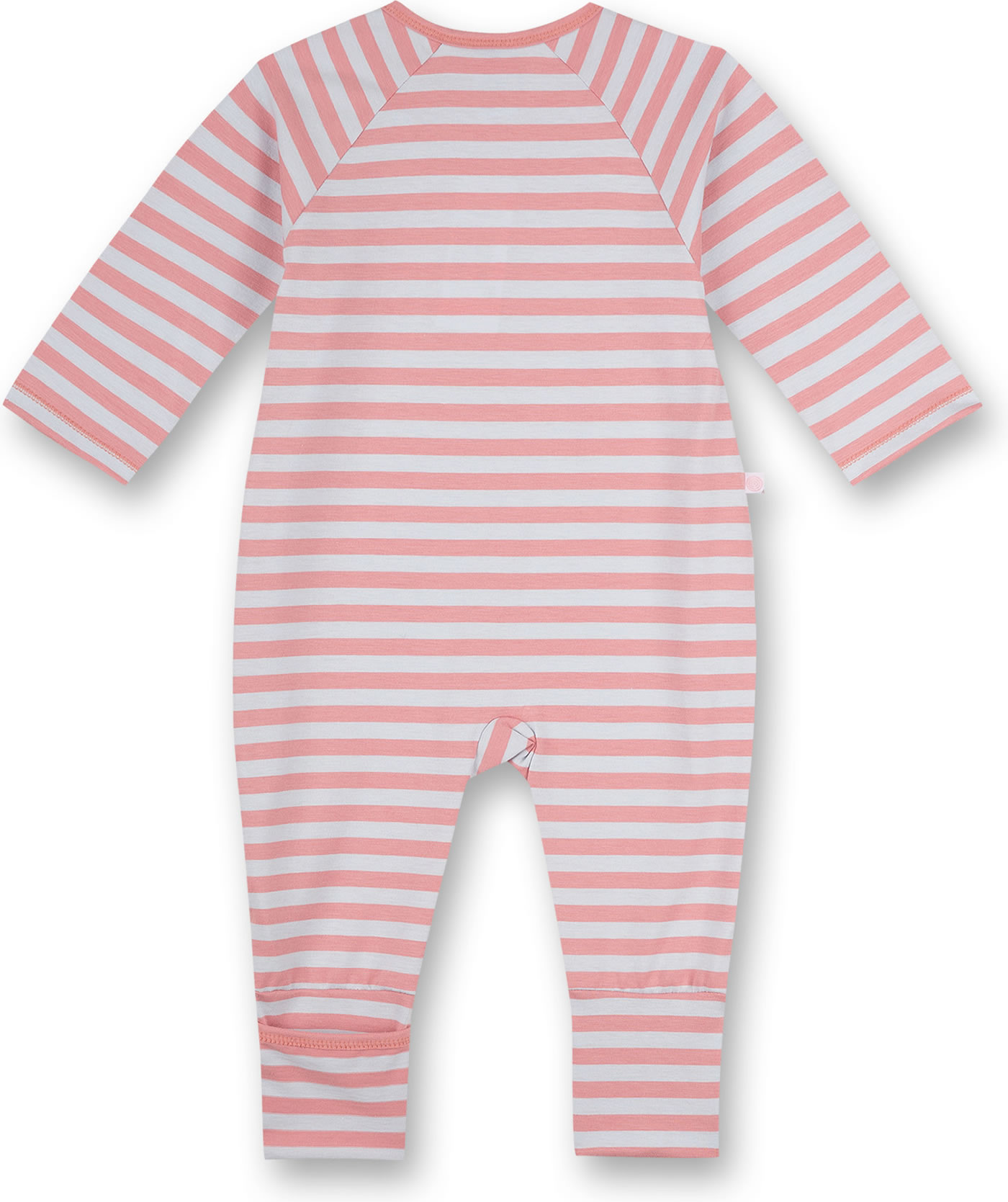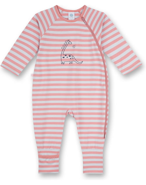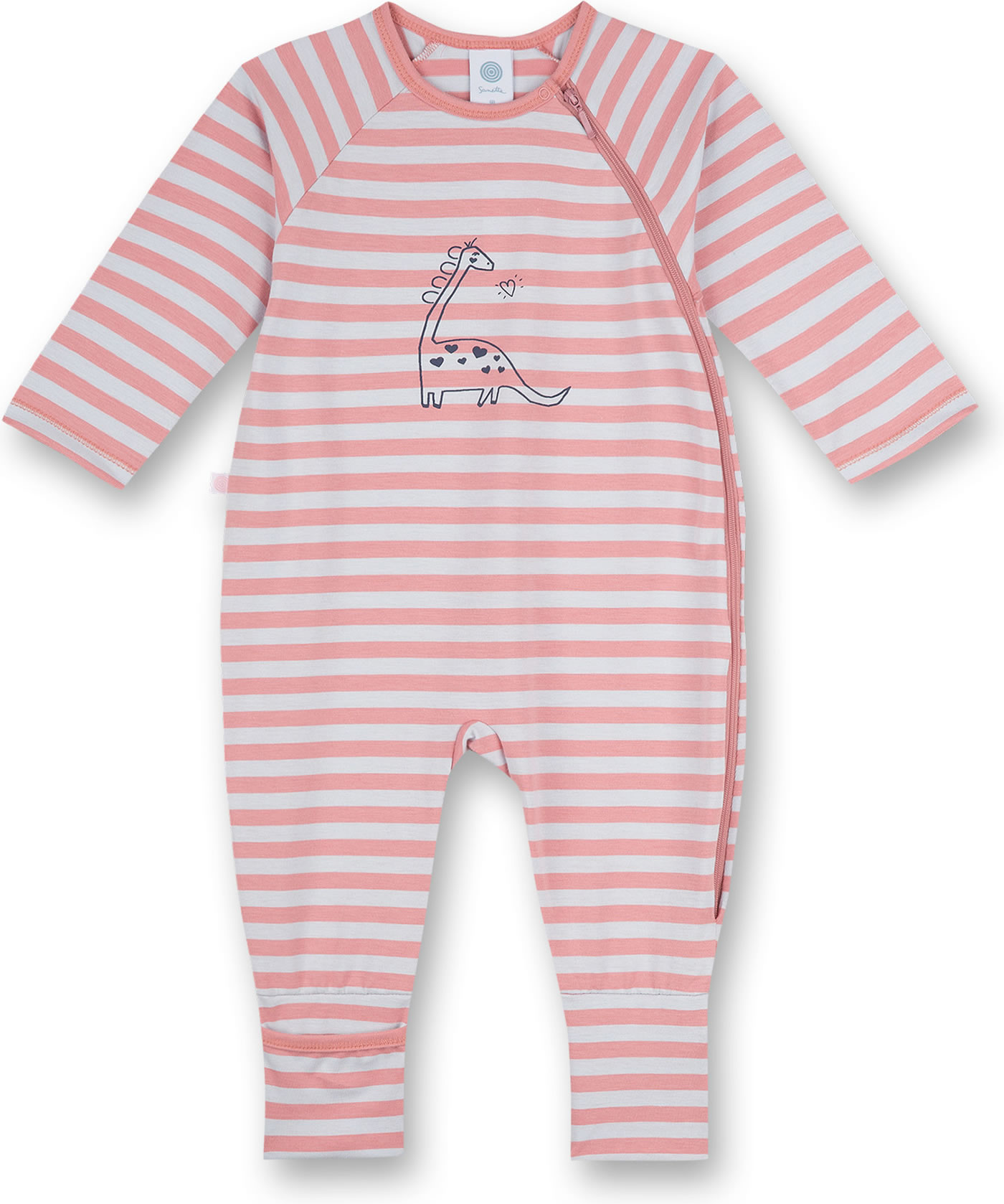 Gestreifter Strampler mit langen Armen und Füßen von SANETTA für Mädchen. Besonders schön ist der niedliche Dino-Print auf der Vorderseite. Ein extralanger Reißverschluss von der Brust bis zum linken Beinende erleichtert das Anziehen und Wickeln. Die Beinenden lassen sich zu Füße umstülpen. Das weiche Material sorgt für einen hohen Tragekomfort.