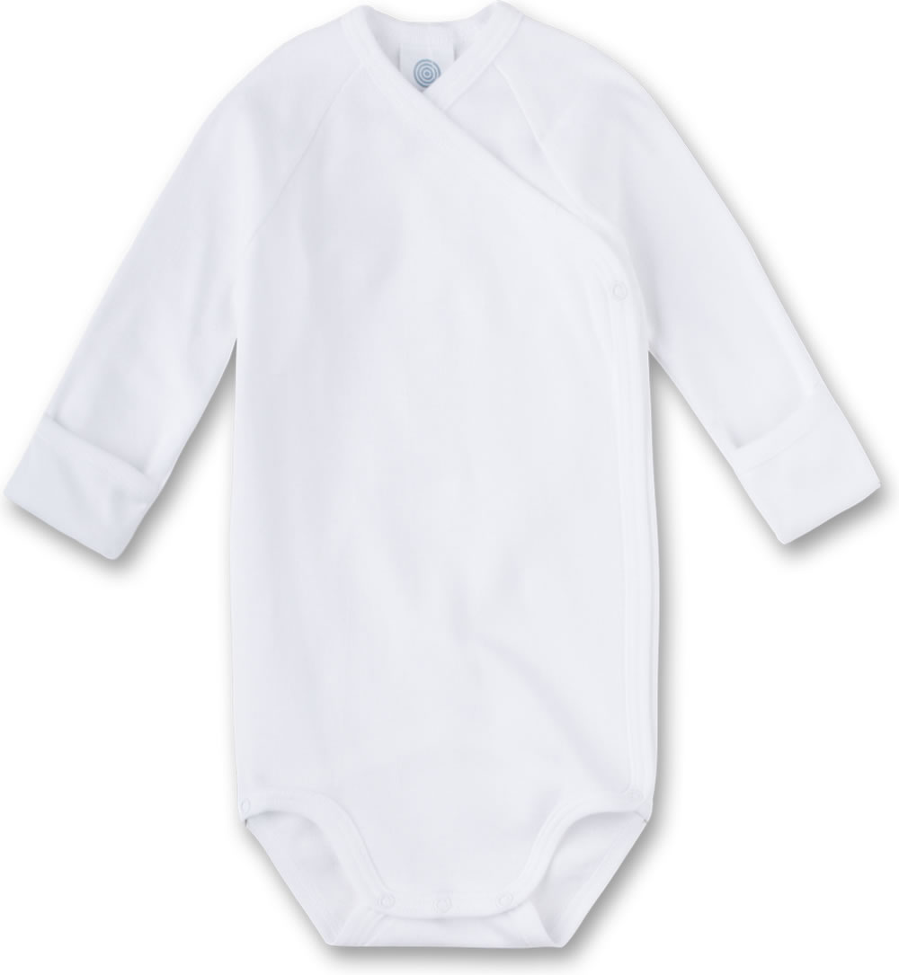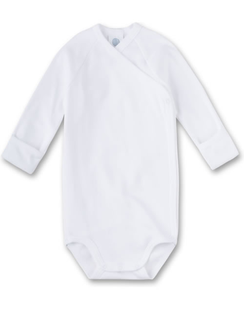 Weißer Wickel-Body mit langen Armen für Jungen und Mädchen von SANETTA. Der Body hat einen integrierten Kratzschutz - einfach die Ärmel umstülpen. Der Wickel-Body hat keine Seitennaht. Eine Druckknopf-Leiste von der Brust bis zum Schritt erleichtern das Anziehen und Wickeln. Das weiche Material sorgt für einen hohen Tragekomfort.